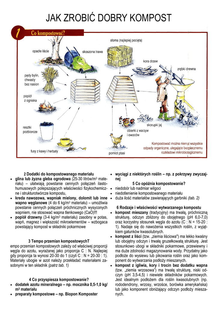 JAK ZROBIĆ DOBRY KOMPOST 2 Dodatki do kompostowanego materiału glina lub żyzna gleba ogrodowa (25-30 litrów/m3 materiału) – ułatwiają powstanie cennych połączeń ilastohumusowych polepszających właściwości fizykochemiczne i strukturotwórcze kompostu, kreda nawozowa, wapniak mielony, dolomit lub inne wapno węglanowe (4 do 6 kg/m3 materiału) – umożliwia powstanie cennych połączeń próchnicznych wysyconych wapniem, nie stosować wapna tlenkowego (CaO)!!! popiół drzewny (3-4 kg/m3 materiału) zasobny w potas, wapń, magnez i większość mikroelementów – wzbogaca powstający kompost w składniki pokarmowe wyciągi z niektórych roślin – np. z pokrzywy zwyczajnej 5 Co opóźnia kompostowanie? niedobór lub nadmiar wilgoci niedotlenienie kompostowanego materiału duża ilość materiałów zawierających garbniki (tab. 2) 6 Rodzaje i właściwości wytwarzanego kompostu kompost mieszany (tradycyjny) ma trwałą, próchniczną strukturę, odczyn zbliżony do obojętnego (pH 6,0-7,0) oraz korzystny stosunek węgla do azotu (C : N = 15-20 : 1). Nadaje się do nawożenia wszystkich roślin, z wyjątkiem gatunków kwasolubnych. kompost z liści (tzw. „ziemia liściowa") ma lekko kwaśny 3 Tempo przemian kompostowychT lub obojętny odczyn i trwałą gruzełkowatą strukturę. Jest empo przemian kompostowych zależy od właściwej proporcji stosunkowo ubogi w składniki pokarmowe, przewiewny i węgla do azotu, wyrażanej jako proporcja C : N. Najlepiej ma duże zdolności magazynowania wody. Przydatny jako gdy proporcja ta wynosi 20-30 do 1 (czyli C : N = 20-30 : 1). podłoże do wysiewu lub pikowania roślin oraz jako komMateriały ubogie w azot należy przekładać materiałami zaponent do wytwarzania podłoży mieszanych. sobnymi w ten składnik (patrz tab. 1) kompost z igliwia, kory i trocin bez dodatku wapna (tzw. „ziemia wrzosowa”) ma trwałą strukturę, niski odczyn (pH 3,5-4,5) i niewiele składników pokarmowych. 4 Co przyspiesza kompostowanie? Jest idealnym podłożem dla roślin kwasolubnych (np. dodatek azotu mineralnego – np. mocznika 0,5-1,0 kg/ rododendrony, wrzosy, wrzośce, borówka amerykańska) 3 m materiału lub jako komponent obniżający odczyn podłoży miesza preparaty kompostowe – np. Biopon Komposter nych. 8. Stosowanie kompostu kompostem w proporcji 1 : 1, po czym na dnie usyPrzedwegetacyjnie – nawóz rozprowadza się puje się niewielki kopczyk, na którym rozkłada się równomiernie po zagonach w dawce 4-6 l/m 2 i równomiernie korzenie sadzonej rośliny; pozostałą przekopuje na głębokość 10-20 cm ziemią wzbogaconą kompostem zasypuje się dołek, punktowo – podczas sadzenia drzew i krzewów pogłównie – dojrzały kompost rozprowadza się rów(tzw. „zaprawianie dołków"): na dno wykopanego nomiernie wokół roślin w dawce 2-3 l/m 2, po czym dołka wrzuca się 2-3 łopaty dojrzałego kompostu i płytko miesza się go z wierzchnią warstwą gleby. miesza się go z glebą. Wybraną ziemię miesza się z Tab 1. Proporcje węgla (C) do azotu (N) w kompostowanych materiałach Materiały zasobne w azot Stosunek C : N Materiały ubogie w azot Stosunek C : N Resztki warzyw, ścięta trawa 12-20 : 1 Papier 700-1000 : 1 Rośliny motylkowe 13-15 : 1 Trociny 300-500 : 1 Młode chwasty 15-20 : 1 Słoma 50-100 : 1 Odpadki kuchenne 15-25 : 1 Igliwie sosnowe 80-85 : 1 Obornik 20-35 : 1 Łodygi kukurydzy 60-65 : 1 Dojrzałe chwasty 20-40 : 1 Igliwie świerkowe 47-53 : 1 Resztki owoców 25-35 : 1 Kora 35-40 : 1 Tab. 2. średnie zawartości garbników w przykładowych materiałach Materiał Zawartość garbników Kora sosnowa 5-8 % Liście brzozy 8-9 % Liście olchy 11-13 % Kora świerkowa 10-12 % Kora dębu 10-15 % HJerbata 17-20 % Liście orzecha włoskiego 30-35 % PROBLEMY POJAWIAJĄCE SIĘ PODCZAS KOMPOSTOWANIA I ICH ROZWIĄZYWANIE Problem Prawdopodobna przyczyna Rozwiązanie problemu Napowietrzyć kompostowany materiał, Nieprzyjemny zapach zjełczałego masła, Niedobór tlenu, spowodowany nadmiernym dodać do kompostownika materiałów rozoctu lub zgniłych jaj zbiciem materiału lub nadmiarem wilgoci luźniających i chłonących wilgoć Czuć ulatniający się amoniak Materiał nie zagrzewa się Nie rozłożone są brzeżne partie materiału Nadmiar azotu Wymieszać kompostowany materiał z dodatkami ubogimi w azot (trociny, kora, liście drzew) Niedobór azotu Wymieszać kompostowany materiał z dodatkami zasobnymi w azot (np. pomiot ptasi, pocięte rośliny motylkowe) Niedobór wilgoci Polać kompostowany materiał 5% roztworem mącznika (0,5 kg nawozu na 10 litrów wody na 1 m3 materiału), polać kompostowany materiał wodą Za mała objętość materiału Dodać więcej materiału do kompostowania Za niska temperatura otoczenia Kompostownik należy okryć grubą warstwą materiałów izolujących (np. liści, suchej trawy, tkanin naturalnych) Nadmierne przesuszenie Wymieszać materiał układając słabo rozłożone części do środka kompostownika oddzielić części podczas rafowania kompostu i ponownie przeznaczyć do kompostowania Oddzielić nierozłożone części materiału W gotowym kompoście są partie nierozło- Nadmierna zwięzłość (zbicie) materiału, podczas rafowania kompostu, rozluźnić je i żonego materiału nierównomierne napowietrzenie przeznaczyć do ponownego kompostowania Usunąć niewłaściwe materiały z kompoDo kompostowania przeznaczono niewłaPrzy kompostowniku pojawiają się muchy, stownika lub przykryć grubą warstwą mateściwe materiały (np. odpadki mięsa, tłuszmyszy, szczury riału ubogiego w składniki (np. trocin, drobczów, kości) nej kory) Powstający kompost należy okryć grubą Na kompostowniku częstymi gośćmi są Kompostowanie niewłaściwego materiału warstwą materiału (np. wysuszonej trawy, ptaki (np. odpadki mięsa, tłuszcz, kości) wiórów drzewnych lub grubą tkaniną