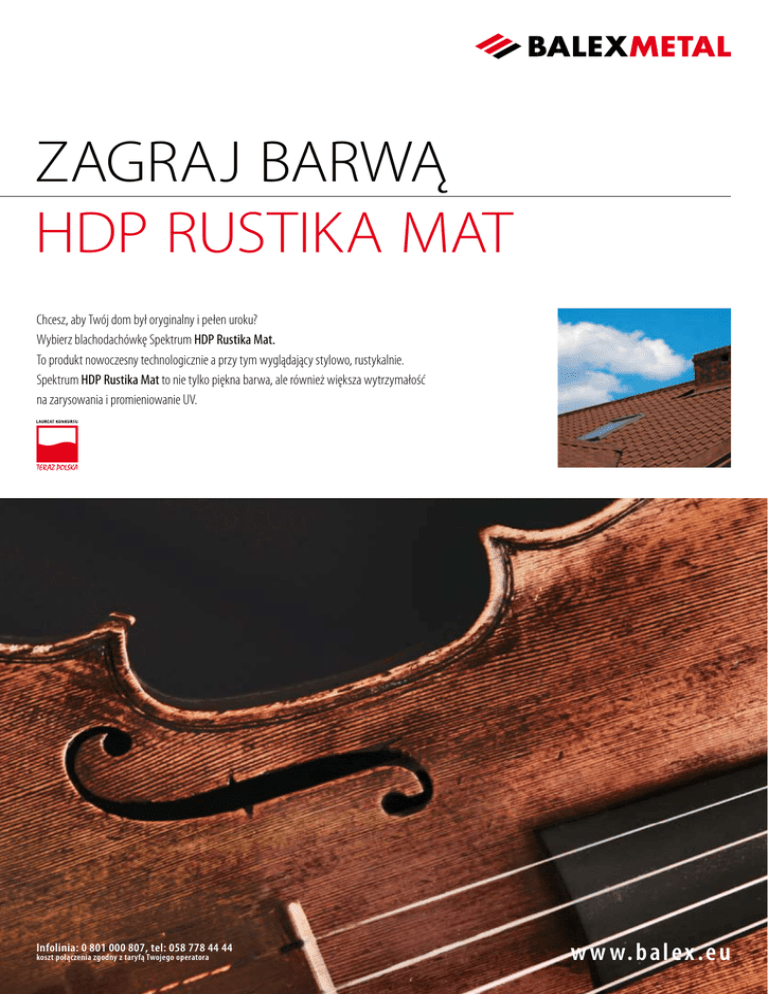 ZAGRAJ BARWĄ HDP RUSTIKA MAT Chcesz, aby Twój dom był oryginalny i pełen uroku? Wybierz blachodachówkę Spektrum HDP Rustika Mat. To produkt nowoczesny technologicznie a przy tym wyglądający stylowo, rustykalnie. Spektrum HDP Rustika Mat to nie tylko piękna barwa, ale również większa wytrzymałość na zarysowania i promieniowanie UV. Infolinia: 0 801 000 807, tel: 058 778 44 44 koszt połączenia zgodny z taryfą Twojego operatora w w w.b a lex.e u Spektrum HDP Rustika Mat Blachodachówka Spektrum HDP Rustika Mat to przede wszystkim oryginalna barwa podkreślająca piękno domu. Niepowtarzalny kolor został uzyskany dzięki zastosowaniu specjalnej technologii nakładania powłoki. HDP (High Durability Polyester) charakteryzuje się ona również zwiększoną odpornością na uszkodzenia mechaniczne i promieniowanie UV. Blachodachówka HDP Rustika Mat wykonana jest w klasycznym profilu Spektrum cenionym za jakość i precyzję wykonania. Stanowi to gwarancję szczelności dachu oraz szybkiego i łatwego montażu. Blachodachówka Spektrum HDP Rustika Mat dostępna jest z kompletnym systemem obróbek dekarskich oraz blachą płaską. Zalety: Parametry techniczne: - oryginalny i stylowy wygląd - powłoka: HDP (High Durability Polyester) - szybki i łatwy montaż - grubość powłoki: 35 μm - wytrzymała i trwała powłoka - grubość blachy: 0,50 mm - lekka konstrukcja dachu - powierzchnia: gładka, matowa - produkowana z najlepszej stali - szerokość użytkowa: 1100 mm - szerokość całkowita: 1170 ± 5 mm - długość modułu: od 280 do 430 mm (standardowo 350 mm) - wysokość profilu: 39 mm - wysokość przetłoczenia: 28 mm Infolinia: 0 801 000 807, tel: 058 778 44 44 koszt połączenia zgodny z taryfą Twojego operatora w w w.b alex.e u inDeks 01-07-2009 02 Zapytaj swojego dekarza lub zadzwoń do oddziału w Twojej okolicy!