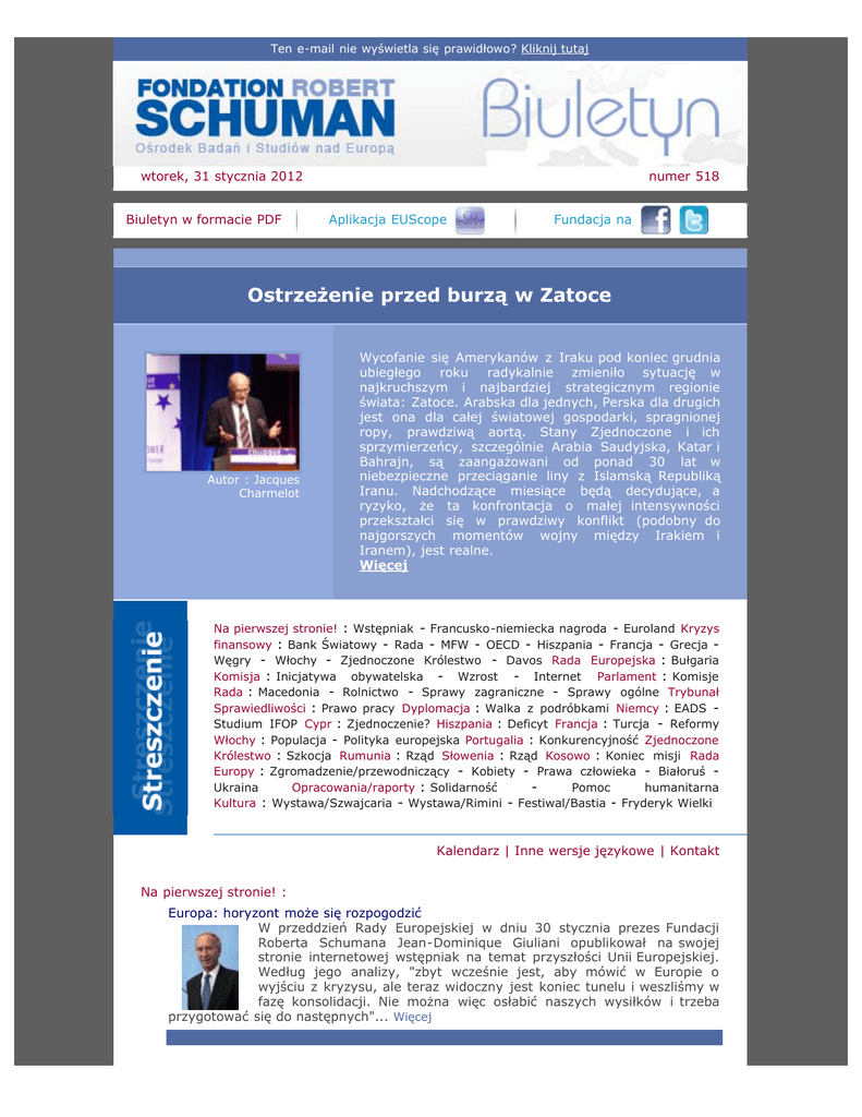 Ten e-mail nie wyświetla się prawidłowo? Kliknij tutaj wtorek, 31 stycznia 2012 Biuletyn w formacie PDF numer 518 Aplikacja EUScope Fundacja na Ostrzeżenie przed burzą w Zatoce Autor : Jacques Charmelot Wycofanie się Amerykanów z Iraku pod koniec grudnia ubiegłego roku radykalnie zmieniło sytuację w najkruchszym i najbardziej strategicznym regionie świata: Zatoce. Arabska dla jednych, Perska dla drugich jest ona dla całej światowej gospodarki, spragnionej ropy, prawdziwą aortą. Stany Zjednoczone i ich sprzymierzeńcy, szczególnie Arabia Saudyjska, Katar i Bahrajn, są zaangażowani od ponad 30 lat w niebezpieczne przeciąganie liny z Islamską Republiką Iranu. Nadchodzące miesiące będą decydujące, a ryzyko, że ta konfrontacja o małej intensywności przekształci się w prawdziwy konflikt (podobny do najgorszych momentów wojny między Irakiem i Iranem), jest realne. Więcej Na pierwszej stronie! : Wstępniak - Francusko-niemiecka nagroda - Euroland Kryzys finansowy : Bank Światowy - Rada - MFW - OECD - Hiszpania - Francja - Grecja Węgry - Włochy - Zjednoczone Królestwo - Davos Rada Europejska : Bułgaria Komisja : Inicjatywa obywatelska - Wzrost - Internet Parlament : Komisje Rada : Macedonia - Rolnictwo - Sprawy zagraniczne - Sprawy ogólne Trybunał Sprawiedliwości : Prawo pracy Dyplomacja : Walka z podróbkami Niemcy : EADS Studium IFOP Cypr : Zjednoczenie? Hiszpania : Deficyt Francja : Turcja - Reformy Włochy : Populacja - Polityka europejska Portugalia : Konkurencyjność Zjednoczone Królestwo : Szkocja Rumunia : Rząd Słowenia : Rząd Kosowo : Koniec misji Rada Europy : Zgromadzenie/przewodniczący - Kobiety - Prawa człowieka - Białoruś Ukraina Opracowania/raporty : Solidarność Pomoc humanitarna Kultura : Wystawa/Szwajcaria - Wystawa/Rimini - Festiwal/Bastia - Fryderyk Wielki Kalendarz | Inne wersje językowe | Kontakt Na pierwszej stronie! : Europa: horyzont może się rozpogodzić W przeddzień Rady Europejskiej w dniu 30 stycznia prezes Fundacji Roberta Schumana Jean-Dominique Giuliani opublikował na swojej stronie internetowej wstępniak na temat przyszłości Unii Europejskiej. Według jego analizy, "zbyt wcześnie jest, aby mówić w Europie o wyjściu z kryzysu, ale teraz widoczny jest koniec tunelu i weszliśmy w fazę konsolidacji. Nie można więc osłabić naszych wysiłków i trzeba przygotować się do następnych"... Więcej Francusko-niemiecka nagroda dla Jean François-Ponceta i Edzarda Reutera 24 stycznia ministrowie spraw europejskich Francji i Niemiec Jean Leonetti oraz Michael Link wręczyli w Berlinie Nagrodę de Gaulle'aAdenauera Jean François-Poncetowi, byłemu ministrowi i senatorowi, członkowi zarządu Fundacji Roberta Schumana, i Edzardowi Reuterowi, byłemu prezesowi Daimlera-Benza. Te dwie osobistości otrzymały nagrodę za to, iż były inicjatorami spotkań w Evian. Co roku od 1992 gromadzą one francuskich i niemieckich przedsiębiorców oraz przyczyniają się w ten sposób do przedłużenia na szczebel przedsiębiorstw unikalnej i uprzywilejowanej relacji łączącej oba kraje... Więcej Manifest na rzecz solidarnej i zintegrowanej strefy euro Zorganizowane przez Confrontations Europe, Fundację Astrid i Fundację Bertelsmanna Europejskie Rozmowy Gospodarcze zakończyły się "Manifestem na rzecz solidarnej i zintegrowanej strefy euro". Aby powstrzymać rosnącą presję rynków i uniknąć dezintegracji Unii Europejskiej, niezbędna jest silniejsza solidarność i koordynacja krajów europejskich, żeby przekształcić ich konkurencyjność. W chwili, kiedy przyspiesza debata na temat reformy unijnych traktatów, trzy organizacje społeczeństwa obywatelskiego przyjęły europejski manifest na rzecz solidarnej i zintegrowanej strefy euro i ruszają z kampanią promującą te cele. Jean-Dominique Giuliani, prezes Fundacji Roberta Schumana, jest jednym z wielu sygnatariuszy manifestu... Więcej Kryzys finansowy : Europa musi dostosować swój model gospodarczy, a nie go porzucać 24 stycznia Bank Światowy opublikował raport na temat zalet i wad europejskiego modelu gospodarczego, zatytułowany "Restoring the lustre of the European economic model". W trakcie prezentacji wiceprezes Banku Światowego ds. Europy i Azji Środkowej Philippe Le Houerou zwrócił się do Europejczyków o zachowanie ich krytycznego umysłu i nietracenie zaufania do ich modelu gospodarczego. Raport dotyczy dwóch ostatnich dziesięcioleci i przeanalizowano w nim sześć dziedzin podnoszących wzrost, to znaczy handel, finanse, przedsiębiorstwa, innowacje, pracę i zarządzanie... Więcej Węgry ścigane za nadmierny deficyt 24 stycznia Rada europejskich ministrów finansów oficjalnie uznała, że Węgry nie podjęły środków koniecznych dla zredukowania swojego nadmiernego deficytu. Bowiem choć założony deficyt został technicznie osiągnięty w 2011 roku, Rada orzekła, że nie było "silnej i trwałej" korekty. Możliwe więc, że przelewy z funduszy strukturalnych i spójności, jakie kraj otrzymuje od Unii Europejskiej, zostaną zawieszone. Ministrowie przyjęli również do wiadomości priorytety ustalone przez duńską prezydencję i przedyskutowali roczną analizę wzrostu autorstwa Komisji, która służy za podstawę badań prowadzonych w ramach europejskiego semestru, a także projekty legislacyjne dotyczące pozagiełdowych pochodnych, nadzoru budżetowego i zarządzania gospodarczego... Więcej MFW koryguje w dół swoje prognozy wzrostu na 2012 24 stycznia Międzynarodowy Fundusz Walutowy (MFW) obniżył swoje światowe prognozy gospodarcze na 2012 rok o 0,7%, w stosunku do perspektyw światowej gospodarki opublikowanych we wrześniu 2011 roku. MFW ocenia, że w br. światowy wzrost gospodarczy sytuować się będzie na poziomie 3,25%. Szanse na wzrost zmniejszyły się w następstwie zwiększonego napięcia gospodarczego w strefie euro. W strefie euro w 2012 roku MFW przewiduje recesję 0,5% i wzrost o 0,8% w 2013