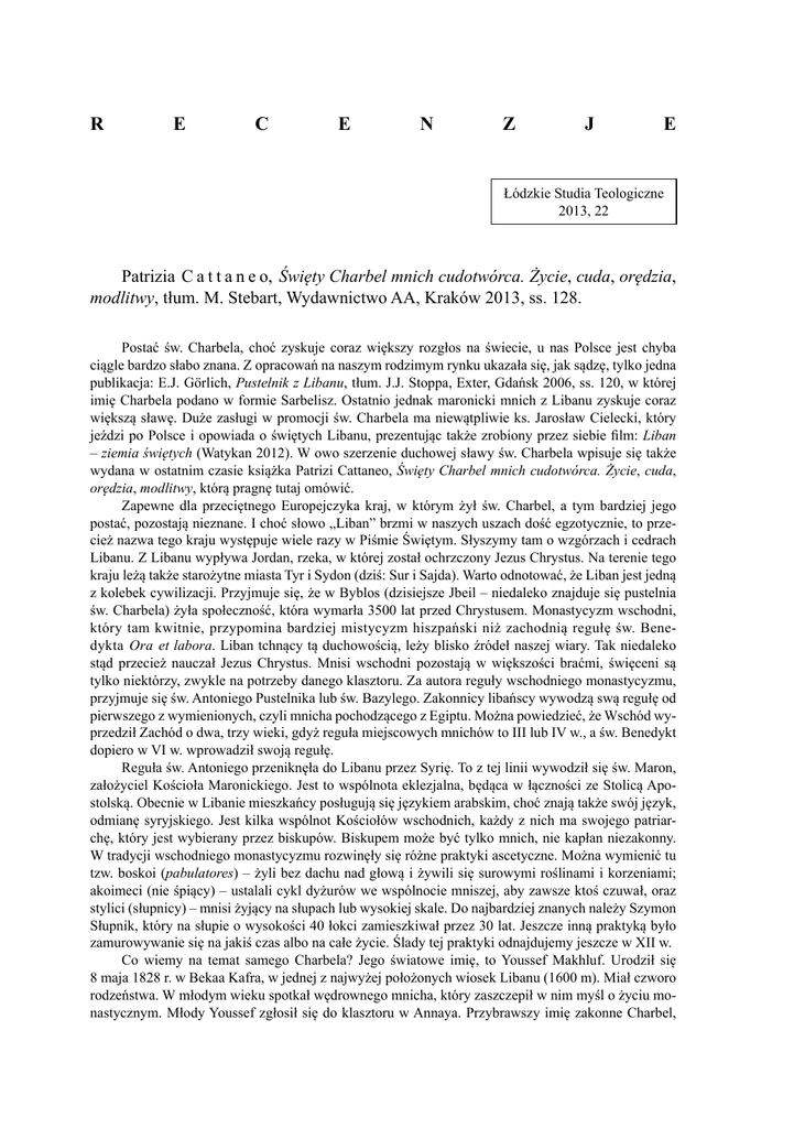 ks. Piotr Kaczmarek (rec.), Patrizia Cattaneo, Święty Charbel mnich