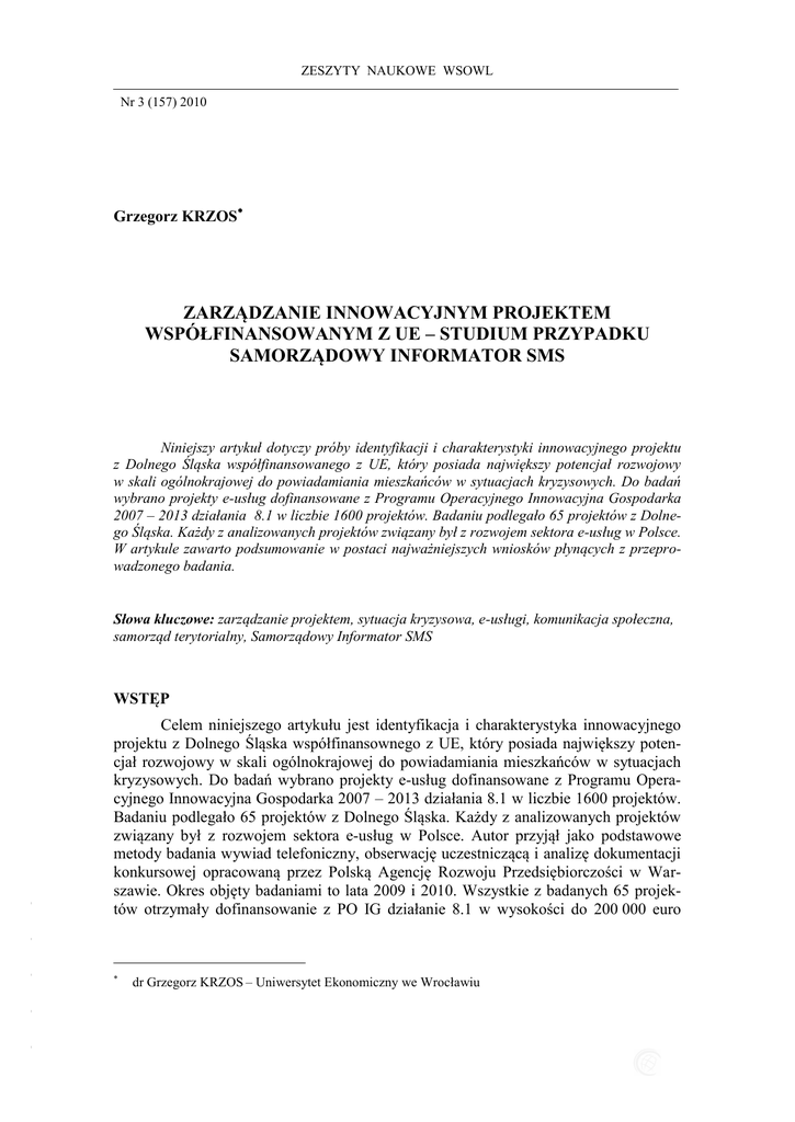 ZESZYTY NAUKOWE WSOWL Nr 3 (157) 2010 ISSN 1731-8157 Grzegorz KRZOS ZARZĄDZANIE INNOWACYJNYM PROJEKTEM WSPÓŁFINANSOWANYM Z UE – STUDIUM PRZYPADKU SAMORZĄDOWY INFORMATOR SMS Niniejszy artykuł dotyczy próby identyfikacji i charakterystyki innowacyjnego projektu z Dolnego Śląska współfinansowanego z UE, który posiada największy potencjał rozwojowy w skali ogólnokrajowej do powiadamiania mieszkańców w sytuacjach kryzysowych. Do badań wybrano projekty e-usług dofinansowane z Programu Operacyjnego Innowacyjna Gospodarka 2007 – 2013 działania 8.1 w liczbie 1600 projektów. Badaniu podlegało 65 projektów z Dolnego Śląska. Każdy z analizowanych projektów związany był z rozwojem sektora e-usług w Polsce. W artykule zawarto podsumowanie w postaci najważniejszych wniosków płynących z przeprowadzonego badania. Słowa kluczowe: zarządzanie projektem, sytuacja kryzysowa, e-usługi, komunikacja społeczna, samorząd terytorialny, Samorządowy Informator SMS Celem niniejszego artykułu jest identyfikacja i charakterystyka innowacyjnego projektu z Dolnego Śląska współfinansownego z UE, który posiada największy potencjał rozwojowy w skali ogólnokrajowej do powiadamiania mieszkańców w sytuacjach kryzysowych. Do badań wybrano projekty e-usług dofinansowane z Programu Operacyjnego Innowacyjna Gospodarka 2007 – 2013 działania 8.1 w liczbie 1600 projektów. Badaniu podlegało 65 projektów z Dolnego Śląska. Każdy z analizowanych projektów związany był z rozwojem sektora e-usług w Polsce. Autor przyjął jako podstawowe metody badania wywiad telefoniczny, obserwację uczestniczącą i analizę dokumentacji konkursowej opracowaną przez Polską Agencję Rozwoju Przedsiębiorczości w Warszawie. Okres objęty badaniami to lata 2009 i 2010. Wszystkie z badanych 65 projektów otrzymały dofinansowanie z PO IG działanie 8.1 w wysokości do 200 000 euro - - - - - WSTĘP dr Grzegorz KRZOS – Uniwersytet Ekonomiczny we Wrocławiu ZARZĄDZANIE INNOWACYJNYM PROJEKTEM WSPÓŁFINANSOWANYM Z UE… każdy. Potencjał rozwojowy badanych projektów autor oceniał subiektywnie, tworząc w celach oceny sześć kryteriów: zasięg geograficzny świadczonej usługi (z jakich województw pochodzą klienci usługi); liczbę klientów korzystających z usługi; konkurencję dla badanej usługi; stopień zaawansowania wdrażania usługi; potencjał generowania przychodów ze świadczonej usługi; przyznane nagrody i wyróżnienia. Autor mając świadomość wad i niedoskonałości takiego sposobu pomiaru potencjału rozwojowego 65 dolnośląskich przedsiębiorstw, wybrał jako najbardziej atrakcyjny projekt przedsiębiorstwa Samorządowy informator SMS Sp. z o.o. we Wrocławiu pt. „Stworzenie internetowego serwisu i automatycznego systemu komunikacji zbiorowej SISMS dla mieszkańców gmin”. 1. ZARZĄDZANIE PROJEKTEM - ZAŁOŻENIA METODYCZNE Mając na uwadze pragmatyczne podejście do badanego problemu, przyjmuje się definicje, opisujące badane zagadnienie za instytucjami, profesjonalnie zajmujące się metodyką zarządzania projektami. W prowadzonych rozważaniach przyjęto definicje „projektu” i „zarządzania projektem” za Project Management Institute w USA. Instytucja ta (jak wiadomo) jest światowym liderem w zakresie rozwoju metod zarządzania projektem i od kilkudziesięciu lat ustanawia standardy w tym zakresie1. Czym zatem jest projekt? Projekt jest to przedsięwzięcie, w którym precyzyjnie zdefiniowano cel, jego początek i koniec oraz budżet. Natomiast zarządzanie projektem to proces sterowania i zastosowania dostępnej wiedzy, umiejętności, narzędzi i technik w celu spełnienia oczekiwań zleceniodawców projektu. W procesie tym winno się dążyć do efektywnego wykorzystywania niezbędnych zasobów ludzkich, rzeczowych, finansowych i informacyjnych do osiągnięcia celu. Zarządzanie projektem winno się odbywać zgodnie z określoną metodyką. Jej najbardziej znaną, cenioną w świecie i powszechnie stosowaną postać opracowało Stowarzyszenie Project Management Institute 2. - - Wsparciem finansowym dla owych projektów mogą być dotacje unijne, przez które rozumie się środki finansowe przekazywane instytucjom na zasadzie refundacji już poniesionych kosztów kwalifikowanych ponoszonych na realizację projektu. Źródłem dotacji dla badanych przedsiębiorców jest Europejski Fundusz Rozwoju Regionalnego. Sposób korzystania z tych dotacji określa tzw. program operacyjny, czyli dokument opisujący cele, kryteria i procedury korzystania z dotacji unijnych oraz z budżetu państwa, dla danego rodzaju wsparcia. 1 - - - 2 Kompendium wiedzy o zarządzaniu projektami, PM BOK Guide 2000 Edition, Warszawa 2003. W. R. Duncan, Guide to the Project Management Body of Knowledge – PMBOK Guide, Project Management Institute, Newton Square, Pennsylvania1996. 119 Grzegorz KRZOS Inną propozycją metodyczną w dziedzinie zarządzania projektem jest koncepcja zwana PRINCE. Opracowano ją w Wielkiej Brytanii w oparciu o wieloletnie doświadczenia związane z realizacją ogromnej liczby projektów. PRINCE - czyli PRojects IN Controlled Environments (projekty w sterowalnym otoczeniu) jest zarejestrowanym i zastrzeżonym znakiem handlowym przez Office of Government Commerce, a prawa autorskie pozostają w posiadaniu Rządu Wielkiej Brytanii. W 1996 roku powstała zmodyfikowana wersja tej metody pod nazwą PRINCE-2, dostosowana do potrzeb różnych typów projektów. Wreszcie warto wymienić metodę zarządzania projektem, która jest szczególnie ważna z punktu widzenia prowadzonych tu rozważań, jest nią Project Cycle Management. Metoda ta przeznaczona jest do zarządzania projektami finansowanymi ze środków Unii Europejskiej, w szczególności zaś tzw. projektami szkoleniowymi. Metoda została opracowana w 1991 roku na zlecenie Komisji Europejskiej. W Polsce, w roku 2004 Ministerstwo Gospodarki, Polityki Społecznej i Pracy wydało podręcznik op