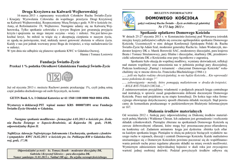 Droga Krzyżowa na Kalwarii Wejherowskiej 16 marca 2013 r. zapraszamy wszystkich Członków Ruchu Światło-Życie i Krucjaty Wyzwolenia Człowieka do wspólnego przeżycia Drogi Krzyżowej na Kalwarii Wejherowskiej. Rozpoczniemy Mszą Świętą o godz. 9:30 w kościele św. Anny, ul. Reformatorów 19, Wejherowo. Następnie udamy się na Kalwarię Wejherowską. Tylko spotkanie człowieka z żywym Bogiem jest gwarancją przyjęcia krzyża i spojrzenia na niego innymi oczyma – wiary i miłości. Nie jest łatwo pokochać krzyż, bo miłość ta wiąże się z akceptacją cierpienia w naszym życiu, ze zgodą na poświęcenie, trud, niekiedy nawet gotowość złożenia w ofierze życia. Każdy z nas jest jednak wezwany przez Boga do świętości, a więc naśladowania Go w miłości. W tym dniu nie odbędzie się planowe spotkanie KWC w Gdańsku-Osowej. Hanna i Tomasz Łosiowie Fundacja Światło-Życie Przekaż 1 % podatku Ośrodkowi Gdańskiemu Fundacji Światło-Życie Już od stycznia 2013 r. możecie Ruchowi pomóc przekazując 1%, czyli jedną setną część podatku dochodowego od osób fizycznych, na konto: GETIN Bank S.A. I Oddział Katowice nr 61 1560 1108 0000 9060 0004 4584. Wystarczy w deklaracji PIT wpisać numer KRS 0000071891 oraz Fundacja Światło-Życie Ośrodek w Gdańsku. Następne spotkanie modlitewno - formacyjne 4.03.2013 w kościele pw. Zesłania Ducha Świętego w Sopocie-Brodwinie, ul. Kujawska 50, godz. 19.00, odpowiedzialny Rejon II. Najbliższa Adoracja Najświętszego Sakramentu i Eucharystia, spotkanie członków i sympatyków KWC 16.02.2013 w kościele pw. św. Polikarpa BM w Gdańsku-Osowej, godz. 17.30. Odpowiedzialni za treść: ks. Tomasz Knuth – moderator diecezjalny DK, Gabriela i Krzysztof Gilewicz – para diecezjalna DK. Numer zamknięto 31.01.2013 r. Nakład 100 egz . Do użytku wewnątrzkościelnego. BIULETYN INFORMACYJNY DOMOWEGO KOŚCIOŁA gałęzi rodzinnej Ruchu Światło – Życie archidiecezji gdańskiej Nr 171 luty 2013 r. Spotkanie opłatkowe Domowego Kościoła W dniach 25-27 stycznia 2013 r. w Konstancinie-Jeziornej pod Warszawą (ośrodek misyjny księży pallotynów) odbyło się coroczne ogólnopolskie spotkanie Domowego Kościoła. Uczestniczyli w nim: delegat Konferencji Episkopatu Polski ds. Ruchu Światło-Życie bp Adam Szal, moderator generalny Ruchu ks. Adam Wodarczyk, moderator krajowy DK o. Marek Borowski SAC, moderatorzy diecezjalni, para krajowa Beata i Tomasz Strużanowscy, pary filialne i diecezjalne, skarbnicy DK, przedstawicielki sekretariatu DK z Krościenka oraz pary łącznikowe z zagranicą. Spotkanie było okazją do wspólnej modlitwy, wymiany doświadczeń, refleksji nad stanem wspólnoty oraz umocnienia nas w pełnieniu posługi pary diecezjalnej. Podczas konferencji „Pamięć i tożsamość – charyzmat Domowego Kościoła” wsłuchaliśmy się w mocne słowa ks. Franciszka Blachnickiego (1966 r.): „… jeśli nie będzie rodziny chrześcijańskiej, to nie będzie Kościoła… Kto wprowadzi nowe pokolenia do niego ?” „… zobowiązania – metody, które pomagają małżeństwom w drodze do świętości, – BYLE BYŚ TYLKO CHCIAŁ…” Z zainteresowaniem przyjęliśmy wiadomość o podjętych pracach kręgu centralnego nad instrukcją w sprawie zasad gospodarowania dobrami doczesnymi Domowego Kościoła. Prace nad projektem są na etapie konsultacji. Do końca tego roku formacyjnego obowiązuje dotychczasowy sposób zbierania składek rocznych. Stąd powracamy do komunikatu przekazanego w październikowym Biuletynie Informacyjnym nr 167. Diakonia środków materialnych Od września 2012 r. funkcję pary odpowiedzialnej za Diakonię środków materialnych pełnią Mariola i Waldemar Chrzan. Ich zadaniem jest gromadzenie i rozliczenie składek członkowskich. Pieniądze zbierane na spotkaniach Domowego Kościoła są zawsze dobrowolnymi ofiarami, które mogą być przeznaczane przez ofiarodawcę na konkretny cel. Zadaniem animatora kręgu jest dyskretna zbiórka tych ofiar na każdym spotkaniu kręgu. Pieniądze te służą na pokrycie bieżących wydatków naszego ruchu w rejonach, diecezji i centrali Domowego Kościoła. Każde małżeństwo utożsamiające się z Domowym Kościołem powinno poczuwać się do współfinansowania potrzeb ruchu przez regularne płacenie składki na miarę swoich możliwości. Wymiernym odniesieniem indywidualnej hojności w skali roku jest zwyczajowo wartość jednej osobistej dniówki. Podział powyższych środków odbywa się na zasadzie: 20 % kwoty pozostaje w rejonie na jego potrzeby, 40 % przeznaczane jest na potrzeby ruchu w Polsce (Krościenko), pozostałe zaś 40 % na finansowanie potrzeb diecezji (materiały niezbędne do funkcjonowania, materiały rekolekcyjne, delegacje pary diecezjalnej i księdza moderatora, dofinansowanie rekolekcji). Tę ostatnią pulę zwiększają środki uzyskane z tzw. „tacy” podczas comiesięcznych Eucharystii (począwszy od listopada 2012 r.), ewentualne nadwyżki pozostałe po rekolekcjach i uzyskane w wyniku dystrybucji Listu do rodzin DK. W praktyce składki animatorzy przekazują parom rejonowym, one zaś Diakonii środków materialnych. Fundacja i jej cele Fundacja „Światło–Życie” Ośrodek w Gdańsku jest jednym z dziewiętnastu ośrodków fundacji założonej w 1989 roku. Jej fundusz założycielski został utworzony z nagrody przyznanej przez Fundację Jana Pawła II Ruchowi Światło-Życie „za bezprecedensową w Europie Środkowej pracę nad formacją religijną i moralną polskiej młodzieży zmierzającą do ukształtowania w niej pełnej odpowiedzialności za życie Kościoła i własnego Narodu". Zgodnie ze Statutem, Fundacja może podejmować różnego rodzaju działania związane z propagowaniem życia wolnego od nałogów i uzależnień, propagującego Nowy Styl Życia. Do tego rodzaju działań można zaliczyć organizację m.in. bali bezalkoholowych, zarówno dla dorosłych, jak i dla młodz