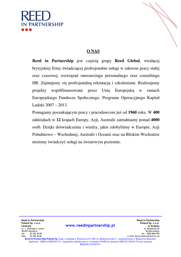 O NAS Reed in Partnership jest częścią grupy Reed Global, wiodącej brytyjskiej firmy świadczącej profesjonalne usługi w zakresie pracy stałej oraz czasowej, rozwiązań outsourcingu personalnego oraz consultingu HR. Zajmujemy się profesjonalną rekrutacją i szkoleniami. Realizujemy projekty współfinansowane przez Unię Europejską w ramach Europejskiego Funduszu Społecznego, Programu Operacyjnego Kapitał Ludzki 2007 – 2013. Pomagamy poszukującym pracy i pracodawcom juŜ od 1960 roku. W 400 oddziałach w 12 krajach Europy, Azji, Australii zatrudniamy ponad 4000 osób. Dzięki doświadczeniu i wiedzy, jakie zdobyliśmy w Europie, Azji Południowo – Wschodniej, Australii i Oceanii oraz na Bliskim Wschodzie moŜemy świadczyć usługi na światowym poziomie. Reed in Partnership Poland Sp. z o.o. Centrala ul. J. Wolnego 4, parter 40-857 Katowice tel: 32 356 40 00 faks: 32 356 40 60 www.reedinpartnership.pl Reed in Partnership Poland Sp. z o.o. o/ Kraków ul. Malborska 65 30-646 Kraków tel. 0605 866 995 e-mail: [email protected] Reed in Partnership Poland Sp. z o.o. z siedzibą w Warszawie 01-209, ul. Hrubieszowska 2 , zarejestrowana w Krajowym Rejestrze Sądowym - KRS nr 0000291173, z kapitałem zakładowym w wysokości 50 000 zł, numerze NIP:525-240-62-76 oraz numerze REGON:141030753. REKRUTACJA Czy obliczaliście kiedyś Państwo ile kosztuje minuta Waszej pracy? Czy przeliczaliście ile kosztuje czas, poświęcony przeprowadzeniu rekrutacji? Czy pomnoŜyliście to przez ilość rozmów i spotkań z kandydatami, zanim wybraliście tego właściwego? Czy zdarzyło się Państwu nie trafić z wyborem? W dąŜeniu do pełnej profesjonalizacji we właściwym doborze kandydatów do pracy, pragniemy zaoferować Państwu usługi rekrutacji personelu. Pozyskanie pracownika, który z zadowoleniem wykonuje swoją pracę, jest bardzo waŜne dla kaŜdej firmy. Podstawą sukcesu w biznesie jest bowiem właściwie dobrany zespół ludzi, posiadających odpowiednie umiejętności i motywację do pracy. Tym co nas wyróŜnia wśród innych firm oferujących tego typu usługi jest moŜliwość połączenie rekrutacji pracownika wraz z jego przeszkoleniem, wybranym przez pracodawcę z naszej bogatej oferty. Oferowany przez nas proces rekrutacji zawiera: • • • • • • szczegółowe zdefiniowanie stanowiska we współpracy z klientem przygotowanie profilu kandydata wyszukanie kandydatów przeprowadzenie procesu rekrutacyjnego wyłonienie najlepszych kandydatów przedstawienie najlepszych kandydatów pracodawcy Reed in Partnership Poland Sp. z o.o. Centrala ul. J. Wolnego 4, parter 40-857 Katowice tel: 32 356 40 00 faks: 32 356 40 60 www.reedinpartnership.pl Reed in Partnership Poland Sp. z o.o. o/ Kraków ul. Malborska 65 30-646 Kraków tel. 0605 866 995 e-mail: [email protected] Reed in Partnership Poland Sp. z o.o. z siedzibą w Warszawie 01-209, ul. Hrubieszowska 2 , zarejestrowana w Krajowym Rejestrze Sądowym - KRS nr 0000291173, z kapitałem zakładowym w wysokości 50 000 zł, numerze NIP:525-240-62-76 oraz numerze REGON:141030753. USŁUGI PRACY TYMCZASOWEJ Ile razy znajdowaliście się Państwo w sytuacji, kiedy w sezonie zwiększonego zapotrzebowania na towary i usługi, traciliście pieniądze z powodu absencji pracowników? Ile czasu zajmowało Wam poszukiwanie ludzi na zastępstwo? Sytuacja na rynku pracy wymusza na pracodawcach stosowanie elastycznych form zatrudnienia pracowników. Wychodząc naprzeciw temu problemowi stworzyliśmy ofertę usług pracy tymczasowej. Wykorzystując nasze wieloletnie doświadczenie w tego typu działalności, potrafimy właściwie dopasować naszą ofertę do potrzeb pracodawcy. Wszędzie tam, gdzie wykonywana praca ma charakter tymczasowy, czy to ze względu na sezonowość, okresy urlopowe lub inne przyczyny, jesteśmy w stanie zagwarantować profesjonalnych pracowników. Są oni zatrudnieni przez nasza firmę zgodnie z prawem pracy, rozliczani i terminowo przez nas wynagradzani. Pracodawca otrzymuje jedynie fakturę VAT za usługi pracy tymczasowej. Pomaga to optymalizować koszty, zapewnia ciągłość procesów, zapobiega przestojom i bezpośrednio wpływa na pozytywny wizerunek firmy. Reed in Partnership Poland Sp. z o.o. Centrala ul. J. Wolnego 4, parter 40-857 Katowice tel: 32 356 40 00 faks: 32 356 40 60 www.reedinpartnership.pl Reed in Partnership Poland Sp. z o.o. o/ Kraków ul. Malborska 65 30-646 Kraków tel. 0605 866 995 e-mail: [email protected] Reed in Partnership Poland Sp. z o.o. z siedzibą w Warszawie 01-209, ul. Hrubieszowska 2 , zarejestrowana w Krajowym Rejestrze Sądowym - KRS nr 0000291173, z kapitałem zakładowym w wysokości 50 000 zł, numerze NIP:525-240-62-76 oraz numerze REGON:141030753. SZKOLENIA Korzystając z międzynarodowego doświadczenia oraz wykwalifikowanej kadry trenerskiej, jesteśmy w stanie indywidualnie dopasować moduły szkoleniowe do potrzeb klienta. realizowane zarówno w projektach Europejską, jak i dla partnerów Szerokie spektrum tematyczne finansowanych przez Unię biznesowych, pozwala nam zaprezentować Państwu naszą ofertę. KaŜdy moduł tematyczny jest przygotowywany indywidualnie po dokładnej analizie potrzeb szkoleniowych klienta. Szkolimy w następujących obszarach: • • • • • • • • • obsługa klienta, efektywna komunikacja, asertywność, motywacja, zarządzanie sobą w czasie, konstruktywne rozwiązywanie konfliktów, budowa skutecznego zespołu, równowaga w Ŝyciu osobistym i zawodowym oraz inne w zaleŜności od oczekiwań naszych klientów. Reed in Partnership Poland Sp. z o.o. Centrala ul. J. Wolnego 4, parter 40-857 Katowice tel: 32 356 40 00 faks: 32 356 40 60 www.reedinpartnership.pl Reed in Partnership Poland Sp. z o.o. o/ Kraków ul. Malborska 65 30-646 Kraków tel. 0605 866 995 e-mail: [email protected] Reed in Partnership Poland Sp. z o.o. z siedzibą w Warszawie 01-209, ul. Hrubieszowska 2 , zarejestrowana w Krajowym Rejestrze Sądowym - K