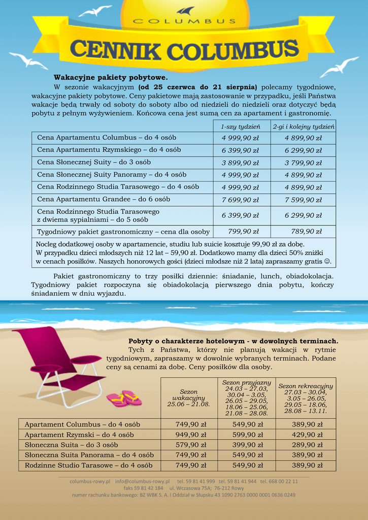 Wakacyjne pakiety pobytowe. W sezonie wakacyjnym (od 25 czerwca do 21 sierpnia) polecamy tygodniowe, wakacyjne pakiety pobytowe. Ceny pakietowe mają zastosowanie w przypadku, jeśli Państwa wakacje będą trwały od soboty do soboty albo od niedzieli do niedzieli oraz dotyczyć będą pobytu z pełnym wyżywieniem. Końcowa cena jest sumą cen za apartament i gastronomię. 1-szy tydzień 2-gi i kolejny tydzień Cena Apartamentu Columbus – do 4 osób 4 999,90 zł 4 899,90 zł Cena Apartamentu Rzymskiego – do 4 osób 6 399,90 zł 6 299,90 zł Cena Słonecznej Suity – do 3 osób 3 899,90 zł 3 799,90 zł Cena Słonecznej Suity Panoramy – do 4 osób 4 999,90 zł 4 899,90 zł Cena Rodzinnego Studia Tarasowego – do 4 osób 4 999,90 zł 4 899,90 zł Cena Apartamentu Grandee – do 6 osób 7 699,90 zł 7 599,90 zł Cena Rodzinnego Studia Tarasowego z dwiema sypialniami – do 5 osób 6 399,90 zł 6 299,90 zł 799,90 zł 789,90 zł Tygodniowy pakiet gastronomiczny – cena dla osoby Nocleg dodatkowej osoby w apartamencie, studiu lub suicie kosztuje 99,90 zł za dobę. W przypadku dzieci młodszych niż 12 lat – 59,90 zł. Dodatkowo mamy dla dzieci 50% zniżki w cenach posiłków. Naszych honorowych gości (dzieci młodsze niż 2 lata) zapraszamy gratis . Pakiet gastronomiczny to trzy posiłki dziennie: śniadanie, lunch, obiadokolacja. Tygodniowy pakiet rozpoczyna się obiadokolacją pierwszego dnia pobytu, kończy śniadaniem w dniu wyjazdu. Pobyty o charakterze hotelowym - w dowolnych terminach. Tych z Państwa, którzy nie planują wakacji w rytmie tygodniowym, zapraszamy w dowolnie wybranych terminach. Podane ceny są cenami za dobę. Ceny posiłków dla osoby. Sezon wakacyjny 25.06 – 21.08. Apartament Columbus – do 4 osób Apartament Rzymski – do 4 osób Słoneczna Suita – do 3 osób Słoneczna Suita Panorama – do 4 osób Rodzinne Studio Tarasowe – do 4 osób 749,90 949,90 579,90 749,90 749,90 zł zł zł zł zł Sezon przyjazny 24.03 – 27.03, 30.04 – 3.05, 26.05 – 29.05, 18.06 – 25.06, 21.08 – 28.08. 549,90 599,90 399,90 549,90 549,90 zł zł zł zł zł Sezon rekreacyjny 27.03 – 30.04, 3.05 – 26.05, 29.05 – 18.06, 28.08 – 13.11. 389,90 429,90 289,90 389,90 389,90 zł zł zł zł zł Apartament Grandee – do 6 osób 1 099,90 zł Rodzinne Studio Tarasowe z dwiema sypialniami – do 5 osób 949,90 zł Całodzienne wyżywienie 119,90 zł Śniadanie – szwedzki bufet 39,90 zł Obiadokolacja – szwedzki bufet 79,90 zł Lunch 39,90 zł Obiad – szwedzki bufet – Kolacja – szwedzki bufet – Nocleg dodatkowej osoby 99,90 zł Nocleg dodatkowego dziecka (do 12 lat) 59,90 zł 749,90 zł 599,90 zł 89,90 zł 34,90 zł – – 39,90 zł 34,90 zł 59,90 zł 39,90 zł 469,90 zł 429,90 zł 89,90 zł 34,90 zł – – 39,90 zł 34,90 zł 59,90 zł 39,90 zł Dzieci młodsze niż 12 lat mają 50% zniżki w cenach posiłków. Naszych honorowych gości (dzieci młodsze niż 2 lata) zapraszamy gratis . Zwierzęta. Z największą przyjemnością będziemy gościli Państwa czworonożnych przyjaciół. Opłata za ich wakacje to 49,90 zł dziennie, nie więcej jednak niż 299,90 zł za cały pobyt. Zamiar przyjazdu z psem lub kotem uprzejmie prosimy zgłosić na etapie rezerwacji. Prosimy o zabranie stosownych dokumentów typu książeczka szczepień etc. etc. Opłaty klimatyczne, za parking, za udział dzieci w zajęciach animacyjnych, za korzystanie z internetu. Zawarte są one już w cenach za pobyt. Wyposażenie. Wszystkie apartamenty, studia i suity wyposażone są w łazienkę, lodówkę, telewizor LCD – min. 32 cale, szafę, ławę, biurko toaletkę, bezprzewodowy dostęp do internetu. Na życzenie (nieodpłatnie) uzupełnimy wyposażenie o łóżeczko dziecięce, wanienkę… Domki campingowe. Dysponujemy ograniczoną ich ilością. Wszystkie wyposażone są w łazienki oraz lodówki. Ceny są cenami za tydzień (definiowany jako 7 dób, od niedzieli – do niedzieli) w sezonie wakacyjnym oraz za dobę w pozostałych okresach. Sezon wakacyjny 25.06 – 21.08. Cena za tydzień Domek 4–osobowy Domek dwurodzinny (10–cio osobowy, dwupokojowy) Sezon rekreacyjny i przyjazny do 25.06 i od 21.08. Cena za dobę 999,90 zł 99,90 zł 1 999,90 zł 199,90 zł Serdecznie zapraszamy Columbus Team