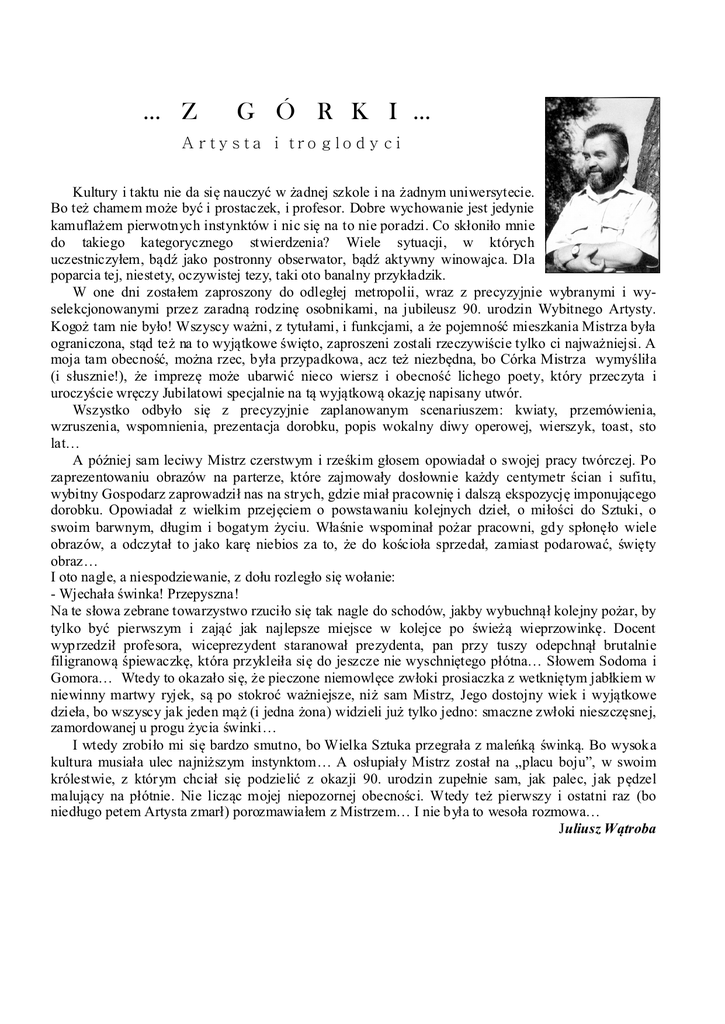 … Z G Ó R K I … A r ty s ta i tro g lo d y c i Kultury i taktu nie da się nauczyć w żadnej szkole i na żadnym uniwersytecie. Bo też chamem może być i prostaczek, i profesor. Dobre wychowanie jest jedynie kamuflażem pierwotnych instynktów i nic się na to nie poradzi. Co skłoniło mnie do takiego kategorycznego stwierdzenia? Wiele sytuacji, w których uczestniczyłem, bądź jako postronny obserwator, bądź aktywny winowajca. Dla poparcia tej, niestety, oczywistej tezy, taki oto banalny przykładzik. W one dni zostałem zaproszony do odległej metropolii, wraz z precyzyjnie wybranymi i wyselekcjonowanymi przez zaradną rodzinę osobnikami, na jubileusz 90. urodzin Wybitnego Artysty. Kogoż tam nie było! Wszyscy ważni, z tytułami, i funkcjami, a że pojemność mieszkania Mistrza była ograniczona, stąd też na to wyjątkowe święto, zaproszeni zostali rzeczywiście tylko ci najważniejsi. A moja tam obecność, można rzec, była przypadkowa, acz też niezbędna, bo Córka Mistrza wymyśliła (i słusznie!), że imprezę może ubarwić nieco wiersz i obecność lichego poety, który przeczyta i uroczyście wręczy Jubilatowi specjalnie na tą wyjątkową okazję napisany utwór. Wszystko odbyło się z precyzyjnie zaplanowanym scenariuszem: kwiaty, przemówienia, wzruszenia, wspomnienia, prezentacja dorobku, popis wokalny diwy operowej, wierszyk, toast, sto lat… A później sam leciwy Mistrz czerstwym i rześkim głosem opowiadał o swojej pracy twórczej. Po zaprezentowaniu obrazów na parterze, które zajmowały dosłownie każdy centymetr ścian i sufitu, wybitny Gospodarz zaprowadził nas na strych, gdzie miał pracownię i dalszą ekspozycję imponującego dorobku. Opowiadał z wielkim przejęciem o powstawaniu kolejnych dzieł, o miłości do Sztuki, o swoim barwnym, długim i bogatym życiu. Właśnie wspominał pożar pracowni, gdy spłonęło wiele obrazów, a odczytał to jako karę niebios za to, że do kościoła sprzedał, zamiast podarować, święty obraz… I oto nagle, a niespodziewanie, z dołu rozległo się wołanie: - Wjechała świnka! Przepyszna! Na te słowa zebrane towarzystwo rzuciło się tak nagle do schodów, jakby wybuchnął kolejny pożar, by tylko być pierwszym i zająć jak najlepsze miejsce w kolejce po świeżą wieprzowinkę. Docent wyprzedził profesora, wiceprezydent staranował prezydenta, pan przy tuszy odepchnął brutalnie filigranową śpiewaczkę, która przykleiła się do jeszcze nie wyschniętego płótna… Słowem Sodoma i Gomora… Wtedy to okazało się, że pieczone niemowlęce zwłoki prosiaczka z wetkniętym jabłkiem w niewinny martwy ryjek, są po stokroć ważniejsze, niż sam Mistrz, Jego dostojny wiek i wyjątkowe dzieła, bo wszyscy jak jeden mąż (i jedna żona) widzieli już tylko jedno: smaczne zwłoki nieszczęsnej, zamordowanej u progu życia świnki… I wtedy zrobiło mi się bardzo smutno, bo Wielka Sztuka przegrała z maleńką świnką. Bo wysoka kultura musiała ulec najniższym instynktom… A osłupiały Mistrz został na „placu boju”, w swoim królestwie, z którym chciał się podzielić z okazji 90. urodzin zupełnie sam, jak palec, jak pędzel malujący na płótnie. Nie licząc mojej niepozornej obecności. Wtedy też pierwszy i ostatni raz (bo niedługo petem Artysta zmarł) porozmawiałem z Mistrzem… I nie była to wesoła rozmowa… Juliusz Wątroba Bydzie lepij Bydzie kiesi lepij na tym inszym świecie, tóż se lepij skrepnij, krowo ty się nie ciel… Wilk nie zeżro łowce, a katolik lutra, bydóm radzi wdowce i baby we furtach. Nie bydziesz się jargoł jak podciep pod płotym. Nie bydziesz go targoł za kabot, galoty… Pónbóczek cie w niebie nałuczy moresu cobyś taki pampóń już się w niebie nie czuł nó bo Świenty Pioter za dźwiyrze wychynie, do rzici ci kopnie: leć nazodź na ziymie! Juliusz Wątroba Słowniczek gwarowy inszy – inny luter – ewangelik jargać – kłócić się podciep – podrzutek kabot – marynarka mores – przyzwoitość pampóń – bogacz, zachłanny wychynóć – wyrzucić nazodź – z powrotem