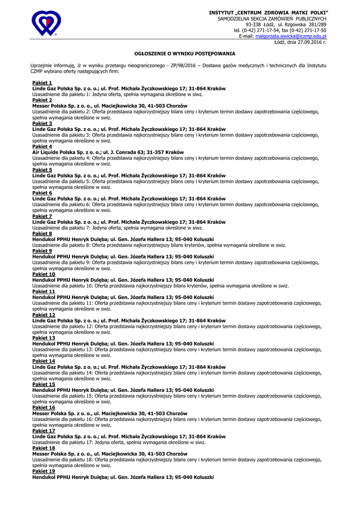 INSTYTUT „CENTRUM ZDROWIA MATKI POLKI” SAMODZIELNA SEKCJA ZAMÓWIEŃ PUBLICZNYCH 93-338 Łódź, ul. Rzgowska 281/289 tel. (0-42) 271-17-54, fax (0-42) 271-17-50 E-mail: [email protected] Łódź, dnia 27.09.2016 r. OGŁOSZENIE O WYNIKU POSTĘPOWANIA Uprzejmie informuję, iż w wyniku przetargu nieograniczonego - ZP/98/2016 – Dostawa gazów medycznych i technicznych dla Instytutu CZMP wybrano oferty następujących firm: Pakiet 1 Linde Gaz Polska Sp. z o. o.; ul. Prof. Michała Życzkowskiego 17; 31-864 Kraków Uzasadnienie dla pakietu 1: Jedyna oferta, spełnia wymagania określone w siwz. Pakiet 2 Messer Polska Sp. z o. o., ul. Maciejkowicka 30, 41-503 Chorzów Uzasadnienie dla pakietu 2: Oferta przedstawia najkorzystniejszy bilans ceny i kryterium termin dostawy zapotrzebowania częściowego, spełnia wymagania określone w swiz. Pakiet 3 Linde Gaz Polska Sp. z o. o.; ul. Prof. Michała Życzkowskiego 17; 31-864 Kraków Uzasadnienie dla pakietu 3: Oferta przedstawia najkorzystniejszy bilans ceny i kryterium termin dostawy zapotrzebowania częściowego, spełnia wymagania określone w swiz. Pakiet 4 Air Liquide Polska Sp. z o. o.; ul. J. Conrada 63; 31-357 Kraków Uzasadnienie dla pakietu 4: Oferta przedstawia najkorzystniejszy bilans ceny i kryterium termin dostawy zapotrzebowania częściowego, spełnia wymagania określone w swiz. Pakiet 5 Linde Gaz Polska Sp. z o. o.; ul. Prof. Michała Życzkowskiego 17; 31-864 Kraków Uzasadnienie dla pakietu 5: Oferta przedstawia najkorzystniejszy bilans ceny i kryterium termin dostawy zapotrzebowania częściowego, spełnia wymagania określone w swiz. Pakiet 6 Linde Gaz Polska Sp. z o. o.; ul. Prof. Michała Życzkowskiego 17; 31-864 Kraków Uzasadnienie dla pakietu 6: Oferta przedstawia najkorzystniejszy bilans ceny i kryterium termin dostawy zapotrzebowania częściowego, spełnia wymagania określone w swiz. Pakiet 7 Linde Gaz Polska Sp. z o. o.; ul. Prof. Michała Życzkowskiego 17; 31-864 Kraków Uzasadnienie dla pakietu 7: Jedyna oferta, spełnia wymagania określone w siwz. Pakiet 8 Hendukol PPHU Henryk Dulęba; ul. Gen. Józefa Hallera 13; 95-040 Koluszki Uzasadnienie dla pakietu 8: Oferta przedstawia najkorzystniejszy bilans kryteriów, spełnia wymagania określone w swiz. Pakiet 9 Hendukol PPHU Henryk Dulęba; ul. Gen. Józefa Hallera 13; 95-040 Koluszki Uzasadnienie dla pakietu 9: Oferta przedstawia najkorzystniejszy bilans ceny i kryterium termin dostawy zapotrzebowania częściowego, spełnia wymagania określone w swiz. Pakiet 10 Hendukol PPHU Henryk Dulęba; ul. Gen. Józefa Hallera 13; 95-040 Koluszki Uzasadnienie dla pakietu 10: Oferta przedstawia najkorzystniejszy bilans kryteriów, spełnia wymagania określone w swiz. Pakiet 11 Hendukol PPHU Henryk Dulęba; ul. Gen. Józefa Hallera 13; 95-040 Koluszki Uzasadnienie dla pakietu 11: Oferta przedstawia najkorzystniejszy bilans ceny i kryterium termin dostawy zapotrzebowania częściowego, spełnia wymagania określone w swiz. Pakiet 12 Linde Gaz Polska Sp. z o. o.; ul. Prof. Michała Życzkowskiego 17; 31-864 Kraków Uzasadnienie dla pakietu 12: Oferta przedstawia najkorzystniejszy bilans ceny i kryterium termin dostawy zapotrzebowania częściowego, spełnia wymagania określone w swiz. Pakiet 13 Hendukol PPHU Henryk Dulęba; ul. Gen. Józefa Hallera 13; 95-040 Koluszki Uzasadnienie dla pakietu 13: Oferta przedstawia najkorzystniejszy bilans ceny i kryterium termin dostawy zapotrzebowania częściowego, spełnia wymagania określone w swiz. Pakiet 14 Linde Gaz Polska Sp. z o. o.; ul. Prof. Michała Życzkowskiego 17; 31-864 Kraków Uzasadnienie dla pakietu 14: Oferta przedstawia najkorzystniejszy bilans ceny i kryterium termin dostawy zapotrzebowania częściowego, spełnia wymagania określone w swiz. Pakiet 15 Hendukol PPHU Henryk Dulęba; ul. Gen. Józefa Hallera 13; 95-040 Koluszki Uzasadnienie dla pakietu 15: Oferta przedstawia najkorzystniejszy bilans ceny i kryterium termin dostawy zapotrzebowania częściowego, spełnia wymagania określone w swiz. Pakiet 16 Messer Polska Sp. z o. o., ul. Maciejkowicka 30, 41-503 Chorzów Uzasadnienie dla pakietu 16: Oferta przedstawia najkorzystniejszy bilans ceny i kryterium termin dostawy zapotrzebowania częściowego, spełnia wymagania określone w swiz. Pakiet 17 Linde Gaz Polska Sp. z o. o.; ul. Prof. Michała Życzkowskiego 17; 31-864 Kraków Uzasadnienie dla pakietu 17: Jedyna oferta, spełnia wymagania określone w siwz. Pakiet 18 Messer Polska Sp. z o. o., ul. Maciejkowicka 30, 41-503 Chorzów Uzasadnienie dla pakietu 18: Oferta przedstawia najkorzystniejszy bilans ceny i kryterium termin dostawy zapotrzebowania częściowego, spełnia wymagania określone w swiz. Pakiet 19 Hendukol PPHU Henryk Dulęba; ul. Gen. Józefa Hallera 13; 95-040 Koluszki Uzasadnienie dla pakietu 19: Oferta przedstawia najkorzystniejszy bilans ceny i kryterium termin dostawy zapotrzebowania częściowego, spełnia wymagania określone w swiz. Pakiet 20 Linde Gaz Polska Sp. z o. o.; ul. Prof. Michała Życzkowskiego 17; 31-864 Kraków Uzasadnienie dla pakietu 20: Jedyna oferta, spełnia wymagania określone w siwz. Pakiet 21 Air Liquide Polska Sp. z o. o.; ul. J. Conrada 63; 31-357 Kraków Uzasadnienie dla pakietu 21: Oferta przedstawia najkorzystniejszy bilans ceny i kryterium termin dostawy zapotrzebowania częściowego, spełnia wymagania określone w swiz. Pakiet 22 Linde Gaz Polska Sp. z o. o.; ul. Prof. Michała Życzkowskiego 17; 31-864 Kraków Uzasadnienie dla pakietu 22: Oferta przedstawia najkorzystniejszy bilans ceny i kryterium termin dostawy zapotrzebowania częściowego, spełnia wymagania określone w swiz. Streszczenie i porównanie złożonych ofert: Nr oferty Nazwa i siedziba Wykonawcy Liczba punktów w kryterium cena Liczba punktów w kryterium termin dostawy zapotrzebowania częściowego Razem Pakiet 1 3 Linde Gaz Polska Sp. z o. o.; ul. Prof. Michała Życzkowskiego 17; 31-864 Kraków 95,00 5,00 100,00 95,00 3,33 98,33 66,
