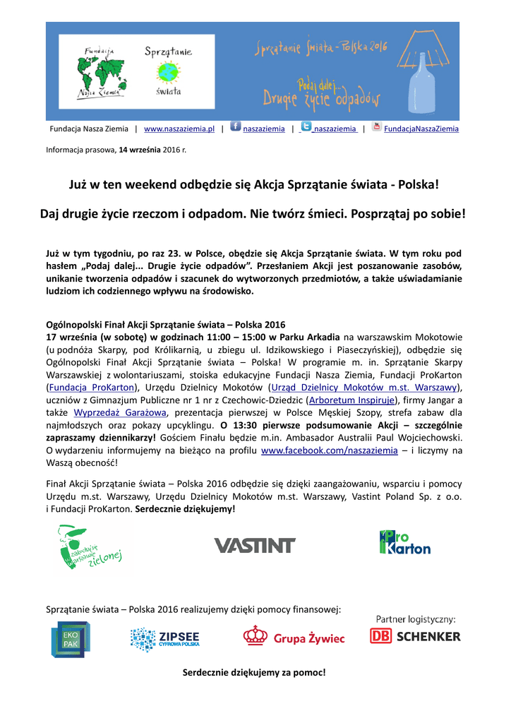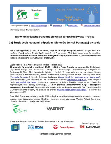 Fundacja Nasza Ziemia | www.naszaziemia.pl | naszaziemia | naszaziemia | FundacjaNaszaZiemia Informacja prasowa, 14 września 2016 r. Już w ten weekend odbędzie się Akcja Sprzątanie świata - Polska! Daj drugie życie rzeczom i odpadom. Nie twórz śmieci. Posprzątaj po sobie! Już w tym tygodniu, po raz 23. w Polsce, obędzie się Akcja Sprzątanie świata. W tym roku pod hasłem „Podaj dalej... Drugie życie odpadów”. Przesłaniem Akcji jest poszanowanie zasobów, unikanie tworzenia odpadów i szacunek do wytworzonych przedmiotów, a także uświadamianie ludziom ich codziennego wpływu na środowisko. Ogólnopolski Finał Akcji Sprzątanie świata – Polska 2016 17 września (w sobotę) w godzinach 11:00 – 15:00 w Parku Arkadia na warszawskim Mokotowie (u podnóża Skarpy, pod Królikarnią, u zbiegu ul. Idzikowskiego i Piaseczyńskiej), odbędzie się Ogólnopolski Finał Akcji Sprzątanie świata – Polska! W programie m. in. Sprzątanie Skarpy Warszawskiej z wolontariuszami, stoiska edukacyjne Fundacji Nasza Ziemia, Fundacji ProKarton (Fundacja ProKarton), Urzędu Dzielnicy Mokotów (Urząd Dzielnicy Mokotów m.st. Warszawy), uczniów z Gimnazjum Publiczne nr 1 nr z Czechowic-Dziedzic (Arboretum Inspiruje), firmy Jangar a także Wyprzedaż Garażowa, prezentacja pierwszej w Polsce Męskiej Szopy, strefa zabaw dla najmłodszych oraz pokazy upcyklingu. O 13:30 pierwsze podsumowanie Akcji – szczególnie zapraszamy dziennikarzy! Gościem Finału będzie m.in. Ambasador Australii Paul Wojciechowski. O wydarzeniu informujemy na bieżąco na profilu www.facebook.com/naszaziemia – i liczymy na Waszą obecność! Finał Akcji Sprzątanie świata – Polska 2016 odbędzie się dzięki zaangażowaniu, wsparciu i pomocy Urzędu m.st. Warszawy, Urzędu Dzielnicy Mokotów m.st. Warszawy, Vastint Poland Sp. z o.o. i Fundacji ProKarton. Serdecznie dziękujemy! Sprzątanie świata – Polska 2016 realizujemy dzięki pomocy finansowej: Serdecznie dziękujemy za pomoc! Sprzątanie świata w Warszawie W tym roku w Warszawie odbywają się wspólnie Akcja Sprzątanie świata – Polska i Warszawskie Dni Recyklingu. W sobotę w każdej dzielnicy Warszawy w godzinach 10-13 będzie można wziąć udział w zbiórce odpadów i sprzątaniu terenów publicznych. W zamian będzie można uzyskać sadzonki roślin. (Finał Warszawskich Dni Recyklingu: festyn rodzinny, niedziela, 18.09, godz. 11-16 pod Pałacem Kultury i Nauki na Pl. Defilad, więcej: www.czysta.um.warszawa.pl). Miejsca zbiórek i sprzątań w sobotę, 17.09, między godz. 10 a 13: Bemowo Teren zieleni pomiędzy ul. Anieli Krzywoń, ul. Synów Pułku i torami kolejowymi. Punkt przyjmowania worków ze śmieciami oraz wydawania kuponów zlokalizowany będzie przy siłowni plenerowej na wysokości budynku Synów Pułku 6. Białołęka Wały Wiślane odcinek od Mostu Marii Skłodowskiej – Curie do ulicy Sprawnej. Bielany W pobliżu ujęcia wody oligoceńskiej przy ul. Gąbińskiej. Mokotów OGÓLNOPOLSKI FINAŁ AKCJI – godz. 11-15 godz. 10-13 - zbiórka odpadów za roślinki i Sprzątanie Skarpy – miejsce: pas drogowy ul. Piaseczyńskiej, fragment skarpy Warszawskiej w rej. ul Dolnej, tereny pod skoczną. Ochota Skwer Dobrego Maharadży. Praga- Południe Tyły bazaru „Rogatka” rejon ulic Mińska, Kamionkowska, Głucha. Praga-Północ Kwartał ulic Floriańska, Okrzei, al. Solidarności, Panieńska. Rembertów Teren wokół Osiedla „Sady Rembertowskie”, przy ul Paderewskiego i ul. Kadrowej. Śródmieście Nabrzeże Wisły – pomiędzy Portem Czerniakowskim a ul. Czerniakowską, oddanie odpadów i odbiór kuponów na parkingu przed dawną siedzibą Straży Miejskiej (wjazd od str. Ul. Zaruskiego). Targówek Las Bródnowski - wejście do lasu przy parkingu u zbiegu ul. Kondratowicza i ul. Przy Grodzisku. Ursus Teren przy ul. Orląt Lwowskich, wjazd na teren od ul. Warszawskiej lub od strony ronda v/v sklepu Biedronka. Ursynów „Park im. Cichociemnych Spadochroniarzy AK” położony w okolicy tzw. „Góry Trzech Szczytów”. Wawer Lasek przy ulicy Patriotów między ul. Zwoleńską a ul. Lucerny. Wesoła Teren pomiędzy bunkrem i sanatorium MSWiA ograniczony ul. 1 Praskiego Pułku, ul. Berenta i ul. Niemcewicza. Wilanów Rezerwat Skarpa Ursynowska, wejście od ul. Arbuzowej, w rejonie ul. Renety. Włochy Teren zieleni „Ogrody Kosmosu” – rejon pomiędzy ulicami: Sympatyczna, Plastyczna, a torami kolejowymi. Wola Lasek na Kole i Park Księcia Janusza. Dodatkowo sprzątanie Wolskiej Reduty wzdłuż ulicy Redutowej. Żoliborz Pas Nadwiślański – teren pomiędzy mostem Grota Roweckiego (Trasa AK), a Klubem Sportowym Spójnia. Za co dostaniemy roślinki? Wszyscy uczestnicy akcji Sprzątania świata w Warszawie otrzymają kupony (nie więcej niż 7), zgodnie z przelicznikiem poniżej. Sprzątanie świata w Dzielnicach odbędzie się w sobotę, 17 września 2016 r., w godzinach 10.00 – 13.00 we wskazanych powyżej lokalizacjach. Uczestnicy Sprzątania świata zostaną wyposażeni w worki i rękawice i otrzymają: - za udział w akcji i zebranie odpadów z danego terenu – 1 kupon - za zapełnienie worka 80l odpadami zebranymi z terenu – 3 kupony - za dostarczenie surowców wtórnych: SZKŁO OPAKOWANIOWE (butelki, słoiki) -za każde 10 sztuk = 1 KUPON PLASTIK/METAL - za każde 10 sztuk = 1 KUPON PAPIER 1 pudełko = 1 KUPON, Każde następne pudełko = 1 kupon (1 pudełko o wymiarach szer. 30 cm x dł. 45 cm x wys. 25 cm) ELEKTROŚMIECI: Mały sprzęt (np. suszarka, mikser) = 1 KUPON Średni sprzęt (np. mikrofala, telewizor, odkurzacz, komputer) = 2 KUPONY Duży sprzęt (np. lodówka, pralka) = 3 KUPONY Za każdy kolejny mały, średni lub duży sprzęt = odpowiednio 1 KUPON albo 2 KUPONY albo 3 KUPONY Kable - bez kuponów. BATERIE - za każde 20 szt. = 1 KUPON Wymiana kuponów na sadzonki: 1 KUPON = 1 sadzonka zioła lub opakowanie cebulek 3 KUPONY = 1 sadzonka krzewu, 1 kwiat lub 1 trawa ozdobna. Szczegóło