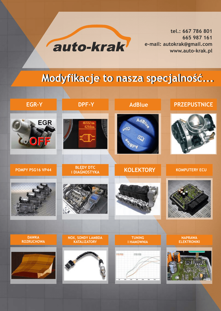 tel.: 667 786 801 665 987 161 e-mail: [email protected] www.auto-krak.pl Modyfikacje to nasza specjalność... EGR-Y DPF-Y AdBlue POMPY PSG16 VP44 BŁĘDY DTC i DIAGNOSTYKA KOLEKTORY DAWKA ROZRUCHOWA NOX, SONDY LAMBDA KATALIZATORY TUNING I HAMOWNIA PRZEPUSTNICE KOMPUTERY ECU NAPRAWA ELEKTRONIKI tel.: 667 786 801 665 987 161 www.auto-krak.pl Filtr cząstek stałych (DPF/FAP) montowany jest zwykle w układach wydechowych silników wysokoprężnych aby sprostać wysokim wymaganiom norm emisji spalin. Ma on postać przestrzennej struktury o bardzo dużej całkowitej powierzchni ścianek. Cząstki stałe osiadają na porowatych ściankach lub włóknach wykonanych z metalu, materiałów ceramicznych. Gromadzące się w filtrze cząstki powodują jego stopniowe zapychanie i utratę wydajności. Ten "cudowny" wynalazek ekologów posiada jednak sporo minusów. Największy to spora awaryjność przez co samochód po dłuższym użytkowaniu, szczególnie na krótkich trasachzaczyna zapychać filtr, wchodzić w trybyawaryjne, wyświetlać błędy - wtedy każdorazowe przywrócenie go do stanu używalności kosztuje a całkowita naprawa wiążąca się z wymianą filtra na nowy to wydatek rzędu kilku, a czasem nawet kilkunastu tysięcy złotych. Urządzenie które uprzykrza nam życie można jednak usunąć w wyspecjalizowanych warsztatach. Usunięcie filtra wiąże się nie tylko z jego fizycznym wycięciem, poza zmodyfikowaniem układu wydechowego należy również wyprogramować go z układu sterującego silnikiem w odpowiedni sposób aby poza wyłączeniem samego filtra wyeliminować również błędy które mogą pojawić się w skutek jego braku. To operacja wymagająca doświadczenia oraz znajomości architektury systemu sterującego silnika. Do reedycji map używamy profesjonalnych firm uznawanych na całym świecie. Warsztatom, które chciałyby wprowadzić do swojej oferty usługę wyprogramowania filtrów służymy naszym bogatym doświadczeniem oraz proponujemy konkurencyjne ceny na modyfikację oprogramowania. Rzemień 183, 39-322 Rzemień e-mail: [email protected] tel.: 667 786 801 665 987 161 www.auto-krak.pl Oferujemy usługę całkowitego wyłączenia zaworu EGR, zabieg ten polega na modyfikacji oprogramowania w taki sposób aby komputer nie uruchamiał zaworu. Istnieje również możliwość modyfikacji oprogramowania aby EGR można było fizycznie usunąć lub zaślepić. Do zalet usunięcia zaworu zaliczamy m.in. zmniejszenie nagaru w kolektorze dolotowym a tym samym zwiększamy żywotność silnika oraz klap wirowych. 2.0 TDi Volkswagen Auto Group 2.2 DTI/DI Opel Chevrolet 2.2 TiD Saab 1.6B/1.8B/2.0B BMW 2.4 JTDM Fiat/Alfa Romeo Lancia 1.2B Opel 1.8 TDCi Ford 2.2 TDCI Ford/Fiat/Citroen Rzemień 183, 39-322 Rzemień 2.0 CDTi/TTiD/JTDM 2.0 DTI/DI 2.2 HDi/TDCi/JTD Opel Opel/Saab/Fiat Citroen/Ford/Fiat Alfa Romeo/Lancia Chevrolet 1.6 TDi Volkswagen Auto Group 3.0B Renault 4.0 CDi Mercedes Wszystkie zainteresowane warsztaty zapraszamy do współpracy w zakresie usuwania zaworów recyrkulacji spalin. Oferujemy fachową obsługę, konkurencyjne ceny oraz rabaty dla stałych osbiorców usług e-mail: [email protected] tel.: 667 786 801 665 987 161 www.auto-krak.pl Elektronika w tak szerokiej dziedzinie jaką bez wątpienia jest motoryzacja rozwija się w bardzo szybkim tempie. Ciągle powstają nowe rozwiązania, koncepcje, wersje istniejących oprogramowań i systemów elektronicznych. Postęp widoczny jest gołym okiem i cieszy użytkowników korzystających z najnowszych technologii, co jednak oznacza to dla warsztatów samochodowych? Najbardziej oczywista odpowiedź na to pytanie to: ciągły rozwój i nauka. Jeśli nie radzisz sobie z naprawą samochodu może powinieneś pomyśleć o współpracy? Te usługi nasi współpracownicy zlecają nam najczęściej: - Wyprogramowanie: - przepustnic - zaworów EGR - klap wirowych - sond lambda - czujników NOX - Usuwanie błędów DTC - Programowanie radioodbiorników - Naprawa komputerów sterującyhc silnikiem (ECU) - Naprawa elektroniki w pompach BOSCH Vp44 PSG16 - Optymalizacja oprogramowania ECU pod kątem spalania - Tuning elektroniczny jednostek turbodoładowanych W naszym warsztacie istnieje również szereg innych usług związanych z elektroniką i możliwych do przeprowadzenia modyfikacji których ze względu na ich mnogość nie sposób wymienić. Kilka mniej typowych usług które również można u nas wykonać to: - wyprogramowanie immobilisera, czujników ciśnienia opon - elektroniczne ograniczenie mocy pojazdu używanego przez młodzież, floty itp - programowanie wtryskiwaczy - naprawa modułu sterującego kolumny kierownicy - programowanie modułów UHC, REC, BCM, CIM - programowanie kluczy i IMMO - tryb ekologiczny w którym samochód spala jak najmniej paliwa uruchamiany standardowym przyciskiem „sport” Współpracującym z nami warsztatom oferujemy szeroki wachlarz usług - od wysyłkowej naprawy elektroniki po modyfikacje oprogramowania przez Internet. ELEKTRONICZNE PRZEPUSTNICE ZAWORY, FILTRY I CZUJNIKI W większości samochodów możemy je całkowicie wyprogramować. Istnieje również możliwość całkowitego wypięcia np. przepustnicy z układu i zastąpienia jej adapterem lub całkowitego zaślepienia zaworu EGR Zapewniamy fachową pomoc i konkurencyjne ceny.Współpraca z nami to gwarancja satysfakcji i zysku- przekonało się o tym już kilkadziesiąt warsztatów z kraju i okolic. Rzemień 183, 39-322 Rzemień e-mail: [email protected] tel.: 667 786 801 665 987 161 www.auto-krak.pl BOSCH VP44 PSG16 Dwuwtykowa pompa wtryskowa DIAGNOZUJEMY NAPRAWIAMY ELEKTRONIKĘ REGENERUJEMY USPRAWNIAMY PROGRAMUJEMY MONTUJEMY Dwuwtykową pompę wtryskową ze zintegrowanym sterownikiem silnika ECU montowano w Samochodach: - OPEL Zafira 2002-2005 Y2ODTH Y22DTR OPEL Astra G 2002-2006 Y2ODTH Y22DTR OPEL Frontera 2002-2004 Y22DTR OPEL Vectra C 2002-2005 Y2ODTH Y22DTR OPEL Signum 2003-2005 Y2ODTH Y22DTR SAAB 93 i 95 2001-2004 2
