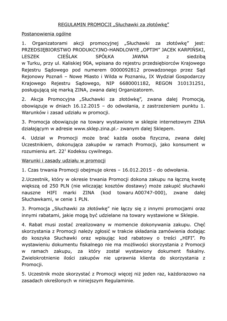 REGULAMIN PROMOCJI „Słuchawki za złotówkę” Postanowienia ogólne 1. Organizatorami akcji promocyjnej „Słuchawki za złotówkę” jest: PRZEDSIĘBIORSTWO PRODUKCYJNO-HANDLOWYE „OPTIM” JACEK KARPIŃSKI, LESZEK CIEŚLAK SPÓŁKA JAWNA z siedzibą w Turku, przy ul. Kaliskiej 90A, wpisana do rejestru przedsiębiorców Krajowego Rejestru Sądowego pod numerem 0000092812 prowadzonego przez Sąd Rejonowy Poznań – Nowe Miasto i Wilda w Poznaniu, IX Wydział Gospodarczy Krajowego Rejestru Sądowego, NIP 6680001182, REGON 310131251, posługującą się marką ZINA, zwana dalej Organizatorem. 2. Akcja Promocyjna „Słuchawki za złotówkę”, zwana dalej Promocją, obowiązuje w dniach 16.12.2015 – do odwołania, z zastrzeżeniem punktu 1. Warunków i zasad udziału w promocji. 3. Promocja obowiązuje na towary wystawione w sklepie internetowym ZINA działającym w adresie www.sklep.zina.pl.- zwanym dalej Sklepem. 4. Udział w Promocji może brać każda osoba fizyczna, zwana dalej Uczestnikiem, dokonująca zakupów w ramach Promocji, jako konsument w rozumieniu art. 221 Kodeksu cywilnego. Warunki i zasady udziału w promocji 1. Czas trwania Promocji obejmuje okres – 16.012.2015 - do odwołania. 2.Uczestnik, który w okresie trwania Promocji dokona zakupu na łączną kwotę większą od 250 PLN (nie wliczając kosztów dostawy) może zakupić słuchawki nauszne HIFI marki ZINA (kod towaru A00747-000), zwane dalej Słuchawkami, w cenie 1 PLN. 3. Promocja „Słuchawki za złotówkę” nie łączy się z innymi promocjami oraz innymi rabatami, jakie mogą być udzielane na towary wystawione w Sklepie. 4. Rabat musi zostać zrealizowany w momencie dokonywania zakupu. Chęć skorzystania z Promocji należy zgłosić w trakcie składania zamówienia dodając do koszyka Słuchawki oraz wpisując kod rabatowy o treści „HIFI”. Po wystawieniu dokumentu fiskalnego nie ma możliwości skorzystania z Promocji w ramach zakupu, za który został wystawiony dokument fiskalny. Zwielokrotnienie ilości zakupów nie uprawnia klienta do skorzystania z Promocji. 5. Uczestnik może skorzystać z Promocji więcej niż jeden raz, każdorazowo na zasadach określonych w niniejszym Regulaminie. 6. Organizator w Promocji dopuszcza możliwość wymiany lub zwrotu towaru, na który został udzielony rabat z zachowaniem postanowień Regulaminu, Wymian i Zwrotów, Reklamacji dostępnego na stronie internetowej Sklepu www.sklep.zina.pl. W przypadku zwrotu produktu, którego dotyczy Promocja, Organizator zwraca tylko i wyłącznie cenę rzeczywiście uiszczoną za zakupiony produkt. Postanowienie końcowe 1. Niniejszy regulamin www.sklep.zina.pl. jest dostępny na stronie internetowej Sklepu 2. Organizator zastrzega sobie prawo zmiany postanowień niniejszego regulaminu. Zmiana będzie każdorazowo ogłaszana na stronie internetowej Sklepu www.sklep.zina.pl. 3. Biorąc udział w promocji, Uczestnik potwierdza, że wyraża zgodę na zasady Promocji określone w niniejszym Regulaminie oraz przetwarzanie danych osobowych uzyskanych od Uczestnika w związku z realizacją zakupów w Sklepie.