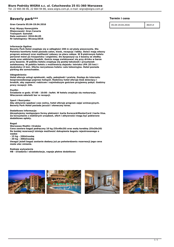 Biuro Podróży WIGRA s.c. ul. Człuchowska 25 01-360 Warszawa Tel. 22 665 06 06, 22 664 94 86, www.wigra.com.pl, e-mail: [email protected] Beverly park*** Gran Canaria 05.04-19.04.2016 Termin i cena 05.04-19.04.2016 3619 zł Kraj: Wyspy Kanaryjskie Miejscowość: Gran Canaria Transport: Samolot Data ważności: 2016-04-05 Nr katalogowy: Wczasy/2016 Informacje Ogólne: Beverly Park Hotel znajduje się w odległości 200 m od plaży piaszczysta. Dla Państwa komfortu hotel posiada salon, kiosk, recepcję i lobby. Dzieci mają własny program animacji oraz możliwość zabawy na placu zabaw. W 8-piętrowym hotelu personel mówi po hiszpańsku i angielsku. Do dyspozycji są 3 baseny ze słodką wodą oraz oddzielny brodzik. Goście mogą zrelaksować się przy drinku w barze przy basenie. W pobliżu hotelu znajdują się postój taksówek i przystanek autobusowy. W pobliżu hotelu z możliwością dojazdu: lotnisko LPA (35 km) i dyskoteka (3 km). Oferta rozrywkowa hotelu: sala telewizyjna. Hotel posiada parking dla samochodów. Udogodnienia: Hotel oferuje usługi opiekunki, sejfy, pokojówki i pralnię. Dostęp do Internetu bezprzewodowego poprzez hotspot. Rodzinny hotel oferuje klub dziecięcy i brodzik, aby zapewnić rodzicom i najmłodszym gościom przyjemny pobyt. Godziny pracy recepcji: 24h. Posiłki: Śniadanie w godz. 07:00 - 10:00 : bufet. W hotelu znajduje się restauracja. Wieczorem odwiedź bar w recepcji. Sport i Rozrywka: Aby aktywnie spędzać czas wolny, hotel oferuje program zajęć animacyjnych. Beverly Park Hotel posiada jacuzzi i słoneczny taras. Dodatkowe Informacje: Akceptujemy następujące formy płatności: karta Eurocard/MasterCard i karta Visa. Za korzystanie z niektórych urządzeń, ofert i aktywności mogą być pobierane dodatkowe opłaty. Bagaż Warszawa Modlin i Kraków Cena zawiera bagaż podręczny 10 kg (55x40x20) oraz małą torebkę (35x20x20) Do każdej rezerwacji istnieje możliwość dokupienia bagażu rejestrowanego o wadze - 15 kg – 200zł/osobę - 20 kg – 300zł/osobę Uwaga! Jeżeli bagaż zostanie dodany już po potwierdzeniu rezerwacji jego cena może ulec zmianie. Rodzaje wyżywienia HB - śniadania i obiadokolacje, napoje płatne dodatkowo 1/1 Powered by TCPDF (www.tcpdf.org)