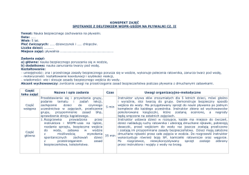 KONSPEKT ZAJĘĆ SPOTKANIE Z DELFINKIEM WOPR-USIEM NA PŁYWALNI CZ. II Temat: Nauka bezpiecznego zachowania na pływalni. Data: …… Wiek: 5 lat. Płeć ćwiczących: …… dziewczynek i …… chłopców. Liczba dzieci: ………… Miejsce zajęć: pływalnia ………………………………………………………… Zadania zajęć: a) główne: nauka bezpiecznego poruszania się w wodzie, b) dodatkowe: nauka zanurzania twarzy pod wodę. Kształtowanie:  umiejętności: zna i przestrzega zasady bezpiecznego porusza się w wodzie, wykonuje polecenia ratownika, zanurza twarz pod wodę,  motoryczność: kształtowanie koordynacji i szybkości reakcji,  wiadomości: wie i stosuje zasady bezpiecznego wejścia do wody. Akcent wychowawczy: zwrócenie uwagi na przestrzeganie zasad bezpieczeństwa podczas pływania z dmuchanymi zabawkami. Część toku zajęć Część wstępna Część główna Nazwa i opis zadania Czas Przedstawienie się i przywitanie grupy, podanie tematu i zadań lekcji, zachęcenie dzieci do czynnego 5 min uczestnictwa w zajęciach, przeliczenie grupy, przypomnienie zasad bhp, sprawdzenie stroju kąpielowego. 1. Rozgrzewka prowadzona przez instruktora i WOPR-usia na lądzie, rozdanie sprzętu, bezpieczne wejście do wody, zabawa w wodzie z możliwością wywołania 35 min spontanicznych zachowań dzieci z przestrzeganiem zasad bezpieczeństwa, koleżeństwa. Uwagi organizacyjno-metodyczne Instruktor używa słów zrozumiałych dla 5 letnich dzieci, mówi głośno i wyraźnie, stoi twarzą do grupy. Demonstruje bezpieczny sposób wejścia do wody. Ma przygotowany sprzęt do nauki pływania po jednym komplecie dla każdego uczestnika. Instruktor zbiera od wychowawców pokolorowane książeczki, które zostaną ocenione, a nagrody będą wręczone na ostatnich zajęciach. Instruktor ustawia dzieci w rozsypce, każde ma miejsce do ćwiczeń, dzieci naśladują ruchy ratownika i ubierają dmuchane rękawki, pobierają deseczki, przed wejściem do wody raz jeszcze zostają przeliczone i zostają im przypomniane zasady bezpieczeństwa. Dzieci mają założone dmuchane rękawki przez całe zajęcia w wodzie. Do rozgrzewki instruktor wykorzystuje również boję SP, kamizelki ratownicze oraz węgorze. Po rozgrzewce, niewykorzystywany sprzęt zostaje zebrany przez instruktora i wyjęty z wody na brzeg. 2. Zabawy w wodzie: Czaple: dzieci brodzą w wodzie wysoko unosząc kolana i zagarniają wodę rękoma, głośno wypowiadając swoje imię. Lustro: dzieci obserwują ruchy instruktora. i Instruktor demonstruje chód czapli. naśladują Instruktor demonstruje chód słonia, mrówki, bociana, ruch lokomotywy, skoki żabki, skoki jednonóż i obunóż na różne odległości i wysokość; porusza się w różnych kierunkach. Motorówki i żaglówki: dzieci na hasło „żaglówki” biegają w wodzie z uniesionymi rękoma, a na hasło: „motorówki” zatrzymują się i zanurzając usta do wody wydmuchują powietrze, starając się naśladować głośny warkot silnika. Zwrócenie uwagi na szybkość reakcji. Zwrócenie uwagi na wydech do wody, podczas zanurzania twarzy. Pociąg Expres: dzieci ustawiają się w rzędzie, chwytają się za barki i tworzą pociąg, który porusza się w różnych kierunkach. Na hasło instruktora: „pociąg expresowy” – pociąg przyspiesza. Na hasło: „stacja Warszawa” – pociąg zatrzymuje się. Instruktor zwraca uwagę, żeby pociąg tworzył całość, a poszczególne wagony się nie rozczepiły. Motyle: dzieci wykonują skurcz ramion i przysiad w wodzie zanurzając brodę i wykonują naprzemianstronne ruchy ramion nad woda i w wodzie. Instruktor wypowiada głośno imiona które „nie wycierało” oczu po ochlapaniu wodą. Oberwanie chmury: dzieci ochlapują się wzajemnie wodą, za pomocą deski pływackiej przez wykonywanie nią szybkich ruchów przyciągania i odpychania od siebie. Ustawienie w dwuszeregu naprzeciwko siebie. Każde dziecko ma deskę pływacką. Deski rozdaje instruktor w sposób: „podaj dalej”. Deska pływacka trzymana jest oburącz z przodu w pionie. Zwrócenie uwagi, by dzieci się nie odwracały ani nie zasłaniały oczu podczas wzajemnego ochlapywania. Zwrócenie uwagi na przestrzeganie dyscypliny i kontrola reakcji wykonywania poleceń instruktora. każdego dziecka, Część Końcowa Dzień dobry, do widzenia: Na hasło instruktora „dzień dobry”, dzieci „zdejmują” deski pływackie ze swoich głów i kłaniają się koledze, na hasło: „do widzenia” kładą sobie deskę na głowę, przytrzymuje ją oburącz i przed zanurzeniem głowy do wody mówią do kolegi „do widzenia”. Ustawienie: marsz w rozsypce: każde dziecko ma deskę pływacką. Podczas wykonywania ćwiczenia, należy zwrócić uwagę, by każde dziecko przywitało się i pożegnało z wszystkimi dziećmi z grupy. 3. Uspokojenie organizmu, bezpieczne wyjście z wody, zebranie sprzętu wykorzystanego na zajęciach. Instruktor z WOPR-usiem omawia zrealizowane zadania lekcji, podsumowuje ją, zachęca dzieci do nauki pływania oraz bezpiecznego korzystania z kąpieli pod nadzorem ratownika i osób dorosłych w miejscach strzeżonych, przypomina o zasadach bhp i higieny, pożegnanie. Instruktor pomaga zebrać sprzęt i odkłada go na miejsce, poleca dzieciom, by wytarły się ręcznikiem i stanęły w grupie, sprawdza stan liczebny. Instruktor zbiera rękawki, aby przynieść je na następne zajęcia. Instruktor za pośrednictwem WOPR-usia chwali cała grupę, prosi wychowawców przedszkolnych o zebranie wszystkich pokolorowanych książeczek i oddanie ich instruktorowi na następnych zajęciach. 5 min Sprzęt wykorzystany do realizacji tematu: kamizelki ratownicze, rękawki dmuchane, węgorze, bojki SP, deski pływackie. Uwagi: Na jednego ratownika przypada maksymalnie grupa 15 dzieci, podczas zajęć obecni są również: rodzice lub opiekunowie oraz panie przedszkolanki. Do zadań wyżej wymienionych osób należy baczne ob