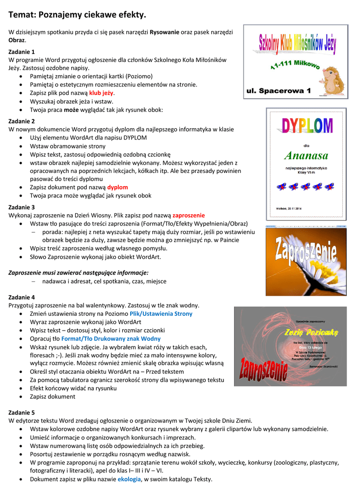 Temat: Poznajemy ciekawe efekty. W dzisiejszym spotkaniu przyda ci się pasek narzędzi Rysowanie oraz pasek narzędzi Obraz. Zadanie 1 W programie Word przygotuj ogłoszenie dla członków Szkolnego Koła Miłośników Jeży. Zastosuj ozdobne napisy. Pamiętaj zmianie o orientacji kartki (Poziomo) Pamiętaj o estetycznym rozmieszczeniu elementów na stronie. Zapisz plik pod nazwą klub jeży. Wyszukaj obrazek jeża i wstaw. Twoja praca może wyglądać tak jak rysunek obok: Zadanie 2 W nowym dokumencie Word przygotuj dyplom dla najlepszego informatyka w klasie Użyj elementu WordArt dla napisu DYPLOM Wstaw obramowanie strony Wpisz tekst, zastosuj odpowiednią ozdobną czcionkę wstaw obrazek najlepiej samodzielnie wykonany. Możesz wykorzystać jeden z opracowanych na poprzednich lekcjach, kółkach itp. Ale bez przesady powinien pasować do treści dyplomu Zapisz dokument pod nazwą dyplom Twoja praca może wyglądać jak rysunek obok Zadanie 3 Wykonaj zaproszenie na Dzień Wiosny. Plik zapisz pod nazwą zaproszenie Wstaw tło pasujące do treści zaproszenia (Format/Tło/Efekty Wypełnienia/Obraz) porada: najlepiej z neta wyszukać tapety mają duży rozmiar, jeśli po wstawieniu obrazek będzie za duży, zawsze będzie można go zmniejszyć np. w Paincie Wpisz treść zaproszenia według własnego pomysłu. Słowo Zaproszenie wykonaj jako obiekt WordArt. Zaproszenie musi zawierać następujące informacje: nadawca i adresat, cel spotkania, czas, miejsce Zadanie 4 Przygotuj zaproszenie na bal walentynkowy. Zastosuj w tle znak wodny. Zmień ustawienia strony na Poziomo Plik/Ustawienia Strony Wyraz zaproszenie wykonaj jako WordArt Wpisz tekst – dostosuj styl, kolor i rozmiar czcionki Opracuj tło Format/Tło Drukowany znak Wodny Wskaż rysunek lub zdjęcie. Ja wybrałem kwiat róży w takich esach, floresach ;-). Jeśli znak wodny będzie mieć za mało intensywne kolory, wyłącz rozmycie. Możesz również zmienić skalę obrazka wpisując własną Określ styl otaczania obiektu WordArt na – Przed tekstem Za pomocą tabulatora ogranicz szerokość strony dla wpisywanego tekstu Efekt końcowy widać na rysunku Zapisz dokument Zadanie 5 W edytorze tekstu Word zredaguj ogłoszenie o organizowanym w Twojej szkole Dniu Ziemi. Wstaw kolorowe ozdobne napisy WordArt oraz rysunek wybrany z galerii clipartów lub wykonany samodzielnie. Umieść informacje o organizowanych konkursach i imprezach. Wstaw numerowaną listę osób odpowiedzialnych za ich przebieg. Posortuj zestawienie w porządku rosnącym według nazwisk. W programie zaproponuj na przykład: sprzątanie terenu wokół szkoły, wycieczkę, konkursy (zoologiczny, plastyczny, fotograficzny i literacki), apel do klas I– III i IV – VI. Dokument zapisz w pliku nazwie ekologia, w swoim katalogu Teksty. Zadanie 6 W edytorze tekstów Word przepisz i wykonaj zadanie. a następnie zapisz je w pliku pod nazwą ślimak. W pracy wykorzystaj fotografię ślimaka winniczka z internetu. Do wykonania opisu części ciała możesz wykorzystać autokształty np. Pole tekstowe Zadanie 7 Opracuj własne logo lub wizytówkę, zastosuj wtle znak wodny. Zapisz dokument wpliku onazwie logo. Zadanie 6 W edytorze tekstu Word opracuj plan turnieju sportowego, który odbędzie się w Dniu Sportu w Twojej szkole. Zadbaj oto, aby zarówno zaplanowane rozgrywki sportowe, jak i wygląd napisanego tekstu były atrakcyjne i zachęcały do udziału w imprezie. Pamiętaj, ze dokument musi zawierać informacje o tym, w jakich dyscyplinach sportowych zostaną przeprowadzone rozgrywki, gdzie się odbędą, na jakie godziny zostały zaplanowane, kto odpowiada za ich przebieg. W zakończeniu dokumentu przedstaw informacje na temat czasu, miejsca i warunków uczestnictwa w zawodach. Dokument zapisz w pliku o nazwie zawody, w swoim katalogu Teksty. Zadanie 7 Wykonaj kolejno poniższe polecenia W nowym dokumencie edytora tekstów przepisz zdanie: Korzystając z internetu, nie podaję żadnych osobistych informacji o sobie. Zaznacz tekst i wybierz opcję Format/Zmień wielkość liter lub przycisk Aa Zmień na WIELKIE LITERY Zapisz plik pod nazwą internet Uzupełnij tekst o samodzielnie wykonany znak graficzny. Wstaw tekst oraz znak graficzny w odpowiednio dobrany autokształt Zapisz plik ponownie Zadanie 8 Ojoj!!! Jesteś naprawdę wybitny jeśli go robisz . Napisz w edytorze tekstów opowiadanie do hasła Sadzimy drzewa. Uzupełnij tekst o samodzielnie wykonany rysunek oraz odpowiedni autokształt. Ćwiczenie wykonaj w następującej kolejności: Napisz opowiadanie w zeszycie Przepisz czcionką Times New Roman, 12pt Sformatuj, wykorzystując style formatowania: tytuł – styl Nagłówek 4, treść – styl Normalny Wykonaj rysunek w edytorze grafiki i zapisz go na dysku Wstaw rysunek do dokumentu tekstowego: wyśrodkuj, dopasuj rozmiar, otocz polem tekstowym wstaw autokształt. W nim napisz, gdzie i kiedy odbędzie się najbliższa akcja sadzenia drzew w Twojej okolicy Zapisz pod nazwą moje opowiadanie Praca domowa Wybierz jedno z zadań i wykonaj. Pracę prześlij e-mailem nauczycielowi informatyki 1. W edytorze tekstu sporządź listę gości, których zamierzasz zaprosić na swoje urodziny. Zaplanuj także urodzinowe menu. Napisz teksty w jednym dokumencie, każdy na oddzielnej stronie. Zadbaj przy tym o przejrzysty i estetyczny wygląd obu tekstów. Na trzeciej stronie opracuj zaproszenie, wykonaj samodzielnie rysunek, który do niego dołączysz. Zadbaj, aby rysunek i tekst były atrakcyjne i pasowały do okoliczności. Dokument zapisz w pliku o nazwie urodziny. 2. W dokumencie edytora tekstu przygotuj krótka historyjkę obrazkowa wykonaną z autokształtów. Dokument zapisz w pliku o nazwie Moja historyjka. 3. W dokumencie tekstowym przygotuj zabawną kompozycje graficzną, wykorzystując dowolne kształty dostępne w edytorze tekstu. Zapisz ja w pliku o nazwie kompozycja. 4. W dokumencie edytora tekstów przygotuj plakat na temat Szkolnego Turnieju Bezpiecz