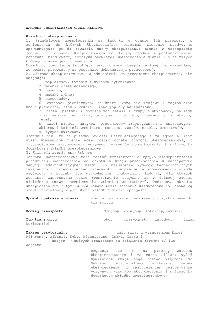 WARUNKI UBEZPIECZENIA CARGO ALLIANZ Przedmiot ubezpieczenia 1. Przedmiotem ubezpieczenia s ładunki w czasie ich przewozu, w odniesieniu do których Ubezpieczaj cy otrzymał zlecenie spedycyjne upowa niaj ce go do zawarcia umowy ubezpieczenia mienia w transporcie (cargo) na rachunek Ubezpieczonego, na którym, zgodnie z postanowieniami kontraktu handlowego, spoczywa obowi zek ubezpieczenia mienia lub na ryzyko którego mienie jest przewo one. Przedmiot ubezpieczenia obj ty jest ochron ubezpieczeniow pod warunkiem, e b dzie przewo ony na podstawie dokumentacji przewozowej. 2. Ochrona ubezpieczeniowa, w odniesieniu do przedmiotu ubezpieczenia, nie obejmuje: 1) papierosów, tytoniu i wyrobów tytoniowych 2) mienia przesiedle czego, 3) cementu, 4) m czki rybnej, 5) samochodów, 6) warto ci pieni nych, za które uwa a si krajowe i zagraniczne znaki pieni ne, czeki, weksle i inne papiery warto ciowe, 7) złota, platyny i pozostałych metali z grupy platynowców, palladu oraz wyrobów ze złota, platyny i palladu, kamieni szlachetnych, pereł, 8) dzieł sztuki, antyków, przedmiotów artystycznych i unikatowych, zbiorów i kolekcji wszelkiego rodzaju, wzorów, modeli, prototypów, 9) ywych zwierz t. Uzgadnia si , e na pisemny wniosek Ubezpieczaj cego i za zgod Allianz wy ej wymienione mienie mo e zosta obj te ochron ubezpieczeniow , z zastrze eniem zastosowania odr bnych warunków ubezpieczenia i naliczenia dodatkowej składki ubezpieczeniowej. 3. Klauzula mienia specjalnego Ochrona ubezpieczeniowa mo e zosta rozszerzona o ryzyko niedopuszczenia przedmiotu ubezpieczenia do obrotu w kraju przeznaczenia w nast pstwie decyzji administracyjnej władz lub naruszenia wymogów technologicznych zwi zanych z przeznaczeniem przedmiotu ubezpieczenia spowodowanych szkod cz ciow w ładunku lub uszkodzeniem opakowania. Ładunki, dla których zostanie zastosowane takie rozszerzenie nazywane s w dalszej cz ci niniejszej umowy ubezpieczenia „mieniem specjalnym”. Dodatkowa składka ubezpieczeniowa z tytułu w/w rozszerzenia zostanie ka dorazowo naliczona wg stawki okre lonej w pkt Stopa składki/ mienie specjalne. Sposób opakowania mienia mienie fabrycznie opakowane i przystosowane do transportu Rodzaj transportu drogowy, kolejowy, lotniczy, morski Typ transportu kurierskie) obcy (przewo nik zawodowy, firmy Zakres terytorialny cały wiat z wył czeniem Korei Północnej, Albanii, Kuby, Afganistanu, Iraku, Iranu i krajów, w których prowadzone s działania zbrojne i/ lub wojenne Uzgadnia si , e na pisemny wniosek Ubezpieczaj cego i za zgod Allianz wy ej wymienione kraje mog zosta wł czone do Zakresu terytorialnego niniejszej umowy ubezpieczenia, z zastrze eniem zastosowania odr bnych warunków ubezpieczenia i naliczenia dodatkowej składki ubezpieczeniowej. Zakres ubezpieczenia dla transportów morskich zakres pełny (all risk) – 1/1/82 Institute Cargo Clauses (A) /Instytutowe Klauzule Ładunkowe (A), z wł czeniem ryzyka załadunku i rozładunku 1/1/01 Institute Classification Clause /Instytutowa Klauzula Klasyfikacyjna, ISM Endorsement Clause /Aneks Ładunkowy ISM, dla transportów lotniczych zakres pełny (all risk) – 1/1/82 Institute Cargo Clauses (Air) (excluding sendings by Post) /Instytutowe Klauzule Ładunkowe (Air) z wył. przesyłek pocztowych, dla transportów l dowych zakres pełny (all Institute Cargo Clauses Klauzule Ładunkowe (A), risk) – 1/1/82 (A) /Instytutowe dla transportów ładunków schłodzonych zakres pełny (all risk) – 1/1/86 Institute Frozen Food Clauses (A) (Excluding Frozen i mro onych Meat) /Instytutowe Klauzule dla ywno ci Mro onej (A) (z wyj tkiem mro onego mi sa), dodatkowo dla wszystkich rodzajów transportów 1/1/34 Institute Replacement Clause /Klauzula wymiany cz ci ubezpieczonej maszyny lub urz dzenia, 10/11/03 Institute Radioactive Contamination, Chemical, Biological, Bio-Chemical And Electromagnetic Weapons Exclusion Clause /Instytutowa Klauzula Wył czaj ca Ryzyko Ska enia Radioaktywnego, Bro Chemiczn , Biologiczn , Biochemiczn Oraz Elektromagnetyczn , 10/11/03 Institute Cyber Attack Clause /Instytutowa Klauzula Ataku Cybernetycznego Termination of Transit Clause (Terrorism) /Klauzula Tranzytowa (Terroryzm) Uzgadnia si , ze ochron ubezpieczeniow szklanych powstałe na skutek potłuczenia. obj te s szkody w przedmiotach W sprawach nie uregulowanych powy szymi klauzulami, innych ni zakres ubezpieczonych ryzyk, zastosowanie maj Ogólne warunki ubezpieczenia mienia w transporcie (cargo) zatwierdzone uchwał Zarz du TU Allianz Polska S.A. nr 170/2007 z dnia 01.08.2007r Klauzula ubezpieczenia transportów na statkach starszych ni 15 lat Uzgadnia si , e na pisemny wniosek Ubezpieczaj cego i za opłat dodatkowej składki ochron ubezpieczeniow mog zosta obj te transporty dokonywane statkami starszymi ni 15 lat, lecz nie przekraczaj cymi wieku 40 lat. W takich przypadkach składka dodatkowa zostanie wyliczona zgodnie z zapisami i wg stawek okre lonych w pkt. Stopa składki/ stawki za wiek statku. Uzgadnia si , e ka dy transport mienia statkiem starszym ni 15 lat zostanie zgłoszony przez Ubezpieczaj cego do Allianz z podaniem m.in. nast puj cych danych: - nazwa i wiek statku, - data rozpocz cia transportu i przewidywana data ko ca transportu, - trasa przewozu, - warto i ilo mienia w danym transporcie Klauzula uprz tni cia/ utylizacji mienia Uzgadnia si , e ubezpieczenie obejmuje dodatkowo koszty uprz tni cia mienia lub jego utylizacji po szkodzie, z zastrze eniem limitu odpowiedzialno ci dla tych kosztów w wysoko ci 200.000 PLN dla wszystkich zdarze w okresie ubezpieczenia ł cznie. Maksymalna warto przewo onego mienia na 1 rodek transportu 1.000.000 USD wg redniego kursu NBP z dnia rozpocz cia transportu (limit odpowiedzialno ci) Uzgadnia si , e na pisemny wniosek Ubezpieczaj cego i za zgod Allianz istnieje mo liwo obj cia ochron ubezpieczeniow mienia o warto ci przekraczaj cej wy ej wymieniony limit odpowiedzialno ci, z zastrze eniem zastosowania odr bnych warunk