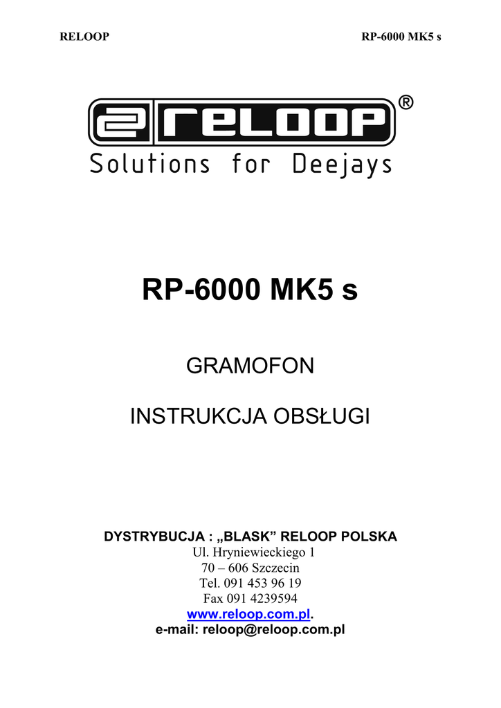 RELOOP RP-6000 MK5 s RP-6000 MK5 s GRAMOFON INSTRUKCJA OBSŁUGI DYSTRYBUCJA : „BLASK” RELOOP POLSKA Ul. Hryniewieckiego 1 70 – 606 Szczecin Tel. 091 453 96 19 Fax 091 4239594 www.reloop.com.pl. e-mail: [email protected] RELOOP RP-6000 MK5 s Gratulacje !!! Nabyłeś gramofon Reloop RP-6000 MK5 s. Dziękujemy Tobie za zaufanie naszym sprzętem dla DJ’ów. Przed uŜyciem prosimy Ciebie o uwaŜne przestudiowanie poniŜszej instrukcji. Proszę wyjąć Reloop RP-6000 MK5 s z opakowania. Sprawdź przed pierwszym uŜyciem, aby się upewnić, Ŝe urządzenie nie zostało uszkodzone podczas transportu, jeśli wykryjesz jakieś uszkodzenia kabla zasilającego lub obudowy nie uŜywaj tego urządzenia. Skontaktuj się ze sprzedawcą. Instrukcje bezpieczeństwa UWAGA! Proszę zachowaj szczególną ostroŜność podczas pracy z napięciem 230 V. Takie napięcie moŜe prowadzić do powaŜnego poraŜenia prądem. Jakiekolwiek uszkodzenia spowodowane poprzez nieostroŜne i niepoprawne uŜycie nie podlega gwarancji. Producent nie jest odpowiedzialny za jakiekolwiek uszkodzenia własności lub szkody osobowe spowodowane przez niewłaściwe uŜycie lub niedotrzymanie zasad bezpieczeństwa. - To urządzenie opuściło fabrykę w idealnym stanie. Aby utrzymać ten stan oraz aby nie było jakiegokolwiek zagroŜenia uŜytkownik musi przestrzegać instrukcji bezpieczeństwa oraz ostrzeŜeń zawartych w tej instrukcji. - Z powodów bezpieczeństwa oraz certyfikacji (CE) nieautoryzowane przerabianie lub/i modyfikacja tego urządzenia jest zabroniona. - Zawartość tego urządzenia nie zawiera Ŝadnych części, które wymagają konserwacji za wyjątkiem zewnętrznych części, które moŜna wymienić z zewnętrz. Wyspecjalizowane osoby mogą prowadzić konserwacje w przeciwnym razie gwarancja nie zostanie uznana. - Upewnij się, Ŝe zasilanie będzie podłączone tylko wtedy, gdy urządzenie będzie przygotowane do pracy. Zawsze podłączaj główny kabel zasilający jako ostatni. Upewnij się, Ŝe główny włącznik jest w pozycji „OFF” gdy podłączasz urządzenie do sieci. - UŜywaj tylko takich kabli, które uwzględnione są w zaleceniach. Sprawdź czy wszystkie połączenia typu „Jack” i inne wtyki są dociśnięte i poprawnie podpięte. Zgłoś się do sprzedawcy jeśli masz jakiś wątpliwości. - Upewnij się podczas uruchamiania urządzenia, Ŝe główny kabel nie jest zgnieciony lub uszkodzony ostrym narzędziem, - Unikaj kontaktu głównego przewodu z innymi kablami. Obchodź się z naleŜytą ostroŜnością podczas operowania kablami i stykami. Nigdy nie dotykaj tych części mokrymi rękoma, - Podłączaj kabel zasilający wyłącznie do odpowiednich gniazd zabezpieczonych przed przepięciem. Jedynymi gniazdami zasilania są punkty zgodne ze specyfikacją publicznej sieci. - Odłącz urządzenie z sieci, kiedy nie jest uŜywane oraz przed czyszczeniem! Trzymaj przewód za wtyczkę. Nigdy nie ciągnij za główny przewód. - Ustaw urządzenie w pozycji poziomej i stabilnej, na niepalnym podłoŜu. Gdy następuje sprzęŜenie zwrotne ustaw pole działania twoich głośników z dala od urządzenia. - Unikaj wstrząsów oraz mocnych uderzeń podczas instalacji i uŜytkowania sprzętu. - Podczas wyboru miejsca instalacji urządzenia, upewnij się, Ŝe urządzenie nie będzie poddawane działaniu wysokiego ciepła, wilgotności oraz zanieczyszczeń. Upewnij się, Ŝe Ŝaden kabel nie leŜy dookoła urządzenia. Narazisz swoje bezpieczeństwo oraz innych!! - Nie kładź Ŝadnych pojemników wypełnionych cieczą, która mogłaby się łatwo rozlać na urządzenie lub w jego najbliŜszym sąsiedztwie. Jeśli jednakŜe płyny dostaną się do środka urządzenia, natychmiast odłącz główny przewód zasilający. Sprzęt musi zostać sprawdzony przez wykwalifikowany personel serwisowy przed kolejnym uŜyciem. Szkody powstałe z tytułu dostania się płynów do urządzenia nie są objęte gwarancją. - Nie uŜywaj urządzenia podczas wysokich temperatur (jeśli przekracza 35◦C) oraz niskich temperatur (poniŜej 5◦C). Nie wystawiaj urządzenia na bezpośrednie działanie promieni słonecznych oraz źródeł ciepła jak np.: radiatory, piekarniki itp. (nawet podczas transportu w zamkniętym pojeździe). Nigdy nie zakrywaj wiatraków chłodzących lub szczelin wentylacyjnych. Zawsze zapewniaj odpowiednią wentylacje. - Urządzenie nie moŜe być uŜywane zaraz po zmianie środowiska np.: z zimnego na ciepłe. Skroplenia mogą spowodować uszkodzenie urządzenia. Nie włączaj ani nie uŜywaj urządzenia dopóki nie osiągnie temperatury otoczenia. - Przełączniki oraz suwaki nie powinny być traktowane sprayami czyszczącymi ani smarami. Urządzenie naleŜy czyścić tylko wilgotną ściereczką. Nigdy nie uŜywaj rozpuszczalników ani płynów czyszczących na bazie benzyny do czyszczenia. - Podczas przenoszenia urządzenia powinno ono znajdować się w swoim oryginalnym opakowaniu. - Podczas uruchamiania urządzenia Crossfadery oraz poziomy głośności twojego wzmacniacza powinny być ustawione na minimum. Ustaw swoje głośniki w pozycji „OFF”. Poczekaj od 8 do 10 sekund przed zwiększeniem głośności, aby uniknąć strzałów w głośniku, które mogą doprowadzić do uszkodzenia głośników oraz zwrotnicy. - Zawsze upewniaj się Ŝe miejsce w którym uŜywasz urządzenia nie spowoduje niechcianych zadrapań ani nie ubrudzi płyt kompaktowych. Kiedy wkładasz płytę do odtwarzacza naleŜy mieć czyste ręce. - Aby utrzymać głowice lasera zawsze zamykaj tackę odtwarzacza. - Urządzenie zasilane prądem nie powinno być uŜywane przez dzieci. Zachowaj szczególną ostroŜność w obecności dzieci. - W szkołach, budynkach szkoleniowych, warsztatach, uŜywanie urządzenia musi być monitorowane przez wyszkolone osoby. - Przechowuj tą instrukcje w bezpiecznym miejscu w razie problemów i pytań. Zasady uŜytkowania zgodnie z instrukcją: - To urządzenie jest profesjonalnym g
