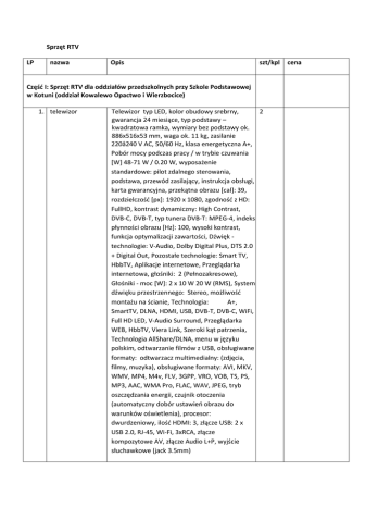 Sprzęt RTV LP nazwa Opis szt/kpl Część I: Sprzęt RTV dla oddziałów przedszkolnych przy Szkole Podstawowej w Kotuni (oddział Kowalewo Opactwo i Wierzbocice) 1. telewizor Telewizor typ LED, kolor obudowy srebrny, 2 gwarancja 24 miesiące, typ podstawy – kwadratowa ramka, wymiary bez podstawy ok. 886x516x53 mm, waga ok. 11 kg, zasilanie 220â240 V AC, 50/60 Hz, klasa energetyczna A+, Pobór mocy podczas pracy / w trybie czuwania [W] 48-71 W / 0.20 W, wyposażenie standardowe: pilot zdalnego sterowania, podstawa, przewód zasilający, instrukcja obsługi, karta gwarancyjna, przekątna obrazu [cal]: 39, rozdzielczość [px]: 1920 x 1080, zgodność z HD: FullHD, kontrast dynamiczny: High Contrast, DVB-C, DVB-T, typ tunera DVB-T: MPEG-4, indeks płynności obrazu [Hz]: 100, wysoki kontrast, funkcja optymalizacji zawartości, Dźwięk technologie: V-Audio, Dolby Digital Plus, DTS 2.0 + Digital Out, Pozostałe technologie: Smart TV, HbbTV, Aplikacje internetowe, Przeglądarka internetowa, głośniki: 2 (Pełnozakresowe), Głośniki - moc [W]: 2 x 10 W 20 W (RMS), System dźwięku przestrzennego: Stereo, możliwość montażu na ścianie, Technologia: A+, SmartTV, DLNA, HDMI, USB, DVB-T, DVB-C, WiFi, Full HD LED, V-Audio Surround, Przeglądarka WEB, HbbTV, Viera Link, Szeroki kąt patrzenia, Technologia AllShare/DLNA, menu w języku polskim, odtwarzanie filmów z USB, obsługiwane formaty: odtwarzacz multimedialny: (zdjęcia, filmy, muzyka), obsługiwane formaty: AVI, MKV, WMV, MP4, M4v, FLV, 3GPP, VRO, VOB, TS, PS, MP3, AAC, WMA Pro, FLAC, WAV, JPEG, tryb oszczędzania energii, czujnik otoczenia (automatyczny dobór ustawień obrazu do warunków oświetlenia), procesor: dwurdzeniowy, ilość HDMI: 3, złącze USB: 2 x USB 2.0, RJ-45, Wi-Fi, 3xRCA, złącze kompozytowe AV, złącze Audio L+P, wyjście słuchawkowe (jack 3.5mm) cena 2. zestaw kina domowego Kino domowe. Liczba kanałów: 5 Kolor: Czarny Wymiary jednostki centralnej (SxWxG) [mm]: 43.5 x 16.8 x 33.15 mm Okres gwarancji: 24 miesiące Pilot, instrukcja, gwarancja Parametry techniczne Moc wyjściowa (amplituner): 105 W, Dekodery dźwięku wielokanałowego: Dolby TrueHD, DTS-HD High Resolution Audio Standardy odtwarzania dźwięku: MP3, WMA, ACC Właściwości audio: -Auto Surround -Sterowanie bas / wys. częstotliwości -Sterowanie zakresem dynamiki -Headphone Surround -Front Stage Surround Advance -Loudness -Tryb odsłuchu Midnight -Sterowanie Fazą (Phase Control) -Opóźnienie dźwięku (LipSync) Właściwości video: Deep Colour, 3D Ready, x.v.Colour, 4K Pass, Through, 4K (MAIN ZONE) Tuner radiowy Zakresy fal radiowych: FM/AM, RDS Głośniki: 5 Rodzaje głośników: 1 x głośnik centralny, 2 x głośnik przedni, 2 x głośnik tylny Kolor kolumn: Czarny Wymiary głośników przednich (WxSxG) mm: ok. 900 x 210 x 240 Wymiary głośników surround (WxSxG) mm: ok. 254 x 147 x 117 Wymiary głośnika centralnego (WxSxG) mm: ok. 147 x 117 x 412 Złącza USB Ilość wyjść HDMI: 1 Ilość wejść HDMI: 4 Wejście optyczne Wyjście optyczne Stacja dokująca do Ipoda Złącza wejściowe: -Audio (Assignable) Złącza wyjściowe: -Monitor Composite -Preout Subwoofer - Digital Coaxial (Assignable) 2 TECHNOLOGIE: Deep Colour, HDMI, MP3, Radio z RDS, USB 2.0 Hi-Speed, DTS-HD High Resolution Audio, Dolby TrueHD Część II: Sprzęt RTV dla oddziałów przedszkolnych przy Szkole Podstawowej w Koszutach (2 oddziały). 1. Telewizor 7 42” 8 Przekątna ekranu 42cali Tryb 3 D okulary w komplecie Nominalna rozdzielczość 1920 x 1080 Full HD Tuner DVB-T (Cyfrowy naziemny z obsługą MPEC-4) Głośnik 10W Gniazdo słuchawkowe (ilość ) 1 szt Gniazdo HDM (ilość) 2 szt Możliwość podłączenia komputera PC Tak Gniazdo SCART (euro złącze)ilośc 1 szt GniazdoUSB (ilość) 1 szt 1 2. odtwarzacz 7 DVD 9 Odtwarzanie płyt DVD, DVD-R, DVD-RW Odtwarzanie DViX, XvID, WMA, MPEGA, MP3 Odtwarzania plików DivXi XviD z napisami Odtwarzanie płyt CD, VCD, CD-R, CD-RW Wyjście Composite CVBS Wyjście audio Port USB 1 3. radio 8 z odtwarzaczem 0 CD Moc wzmacniacza 2w Toner radiowy FM Wyświetlacz LCD Odtwarzacz CD i MP# Pilot Port USB 1