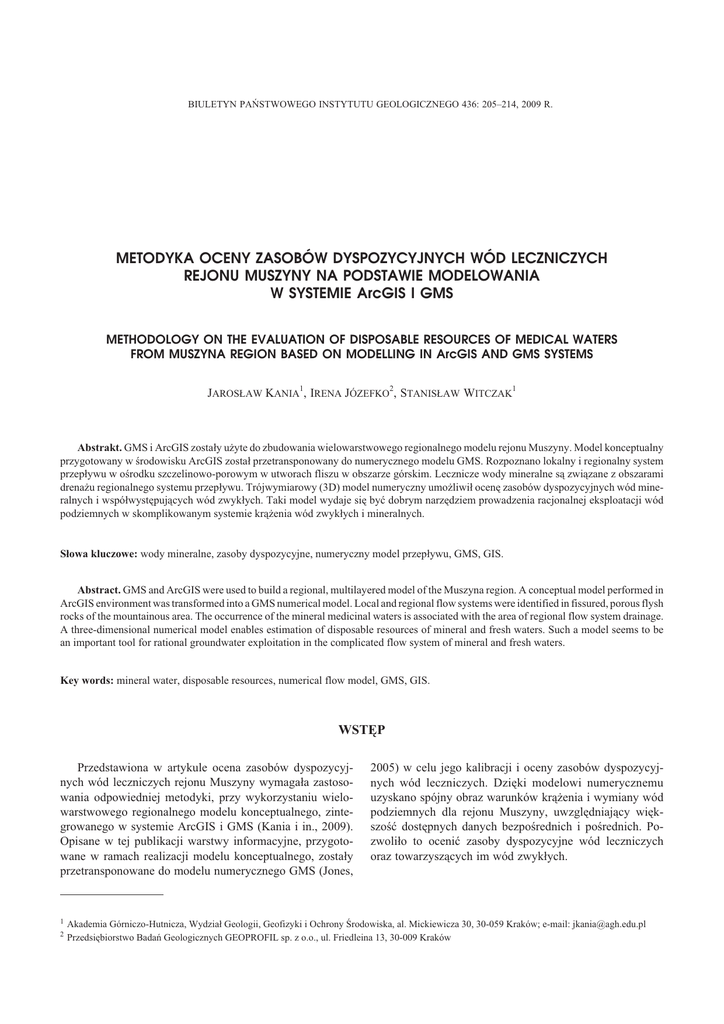 BIULETYN PAÑSTWOWEGO INSTYTUTU GEOLOGICZNEGO 436: 205–214, 2009 R. METODYKA OCENY ZASOBÓW DYSPOZYCYJNYCH WÓD LECZNICZYCH REJONU MUSZYNY NA PODSTAWIE MODELOWANIA W SYSTEMIE ArcGIS I GMS METHODOLOGY ON THE EVALUATION OF DISPOSABLE RESOURCES OF MEDICAL WATERS FROM MUSZYNA REGION BASED ON MODELLING IN ArcGIS AND GMS SYSTEMS JAROS£AW KANIA1, IRENA JÓZEFKO2, STANIS£AW WITCZAK1 Abstrakt. GMS i ArcGIS zosta³y u¿yte do zbudowania wielowarstwowego regionalnego modelu rejonu Muszyny. Model konceptualny przygotowany w œrodowisku ArcGIS zosta³ przetransponowany do numerycznego modelu GMS. Rozpoznano lokalny i regionalny system przep³ywu w oœrodku szczelinowo-porowym w utworach fliszu w obszarze górskim. Lecznicze wody mineralne s¹ zwi¹zane z obszarami drena¿u regionalnego systemu przep³ywu. Trójwymiarowy (3D) model numeryczny umo¿liwi³ ocenê zasobów dyspozycyjnych wód mineralnych i wspó³wystêpuj¹cych wód zwyk³ych. Taki model wydaje siê byæ dobrym narzêdziem prowadzenia racjonalnej eksploatacji wód podziemnych w skomplikowanym systemie kr¹¿enia wód zwyk³ych i mineralnych. S³owa kluczowe: wody mineralne, zasoby dyspozycyjne, numeryczny model przep³ywu, GMS, GIS. Abstract. GMS and ArcGIS were used to build a regional, multilayered model of the Muszyna region. A conceptual model performed in ArcGIS environment was transformed into a GMS numerical model. Local and regional flow systems were identified in fissured, porous flysh rocks of the mountainous area. The occurrence of the mineral medicinal waters is associated with the area of regional flow system drainage. A three-dimensional numerical model enables estimation of disposable resources of mineral and fresh waters. Such a model seems to be an important tool for rational groundwater exploitation in the complicated flow system of mineral and fresh waters. Key words: mineral water, disposable resources, numerical flow model, GMS, GIS. WSTÊP Przedstawiona w artykule ocena zasobów dyspozycyjnych wód leczniczych rejonu Muszyny wymaga³a zastosowania odpowiedniej metodyki, przy wykorzystaniu wielowarstwowego regionalnego modelu konceptualnego, zintegrowanego w systemie ArcGIS i GMS (Kania i in., 2009). Opisane w tej publikacji warstwy informacyjne, przygotowane w ramach realizacji modelu konceptualnego, zosta³y przetransponowane do modelu numerycznego GMS (Jones, 1 2 2005) w celu jego kalibracji i oceny zasobów dyspozycyjnych wód leczniczych. Dziêki modelowi numerycznemu uzyskano spójny obraz warunków kr¹¿enia i wymiany wód podziemnych dla rejonu Muszyny, uwzglêdniaj¹cy wiêkszoœæ dostêpnych danych bezpoœrednich i poœrednich. Pozwoli³o to oceniæ zasoby dyspozycyjne wód leczniczych oraz towarzysz¹cych im wód zwyk³ych. Akademia Górniczo-Hutnicza, Wydzia³ Geologii, Geofizyki i Ochrony Œrodowiska, al. Mickiewicza 30, 30-059 Kraków; e-mail: [email protected] Przedsiêbiorstwo Badañ Geologicznych GEOPROFIL sp. z o.o., ul. Friedleina 13, 30-009 Kraków 206 Jaros³aw Kania, Irena Józefko, Stanis³aw Witczak PRZEKSZTA£CENIE MODELU KONCEPTUALNEGO GMS W MODEL NUMERYCZNY GMS MODFLOW W pakiecie programowym GMS przekszta³cenie modelu konceptualnego w model numeryczny skutkuje podzia³em modelowanej przestrzeni na bloki obliczeniowe o za³o¿onych rozmiarach i o mi¹¿szoœci odpowiadaj¹cej mi¹¿szoœci wydzielonych warstw modelu. Zastosowano podzia³ na bloki 50×50 m, a skutki dyskretyzacji pokazano przyk³adowo dla rozk³adu wspó³czynników filtracji w drugiej warstwie modelu (fig. 1). Niezale¿nie od automatycznego procesu przekszta³cenia struktury modelu, konieczne by³y korekty wprowadzane manualnie. Dotyczy³o to przepuszczalnoœci stref przyuskokowych, przepuszczalnoœci w strefach przyotworowych, niektórych elementów symulacji rzek oraz ekstremalnego zgazowania wód. Dyslokacje tektoniczne by³y wprowadzane automatycznie przez przyjêcie pionowej œcianki pomiêdzy blokami modelu (Horizontal Flow Barrier – HFB) o gruboœci 10 m, symuluj¹cej sam¹ strefê uskokow¹. Dodatkowo, w blokach modelu przylegaj¹cych do dyslokacji zmieniano manualnie przepuszczalnoœæ ska³, zale¿nie od typu stref uskokowych (A, B, C – por. Kania i in., 2009). Wspó³czynniki filtracji poszczególnych litotypów zosta³y przetransponowane z modelu konceptualnego do modelu numerycznego automatycznie, zgodnie ze zintegrowan¹ baz¹ danych (por. Kania i in., 2009 – fig. 3). Taki obraz regionalny zosta³ uzupe³niony manualnie w otoczeniu odwiertów, gdzie przyjêto wspó³czynniki filtracji wynikaj¹ce z interpretacji wyników próbnych pompowañ. Bior¹c pod uwagê do- Fig. 1. Przyk³ad wprowadzenia wygenerowanych warstw informacyjnych ArcGIS do modelu numerycznego GMS. Widoczny rozk³ad wspó³czynników filtracji w warstwie drugiej modelu numerycznego (do 30 m p.p.t.). Powiêkszenie pokazuje strukturê modelu przy podziale na bloki 50×50 m. Izolinie pokazuj¹ uk³ad pola hydrodynamicznego Example of initial values of information layers after transformation from conceptual to GMS numerical model. Distribution of hydraulic conductivity in the second layer of the model (down to 30 m b.g.l.) is visible. Magnification shows the model structure divided into 50×50 m blocks. Equipotential lines shows simulated hydrodynamic field Metodyka oceny zasobów dyspozycyjnych wód leczniczych rejonu Muszyny... œwiadczenia literaturowe i doœwiadczenia w³asne autorów, wartoœci wspó³czynników filtracji z próbnych pompowañ wprowadzono w zasiêgu 9 bloków (blok centralny z odwiertem i 8 otaczaj¹cych go bloków). Rzeki odwzorowywane s¹ na modelu numerycznym GMS automatycznie wed³ug danych wprowadzonych do modelu konceptualnego. Okaza³o siê jednak, ¿e algorytm GMS nie jest w tym przypadku doskona³y. W blokach, w których wystêpuj¹ fragmenty dwóch lub wiêcej cieków, interpolacja rzêdnych poziomu wody realizowana jest oddzielnie dla ka¿dego z nich. W konsekwencji, np. w miejscach ujœcia dop³ywu do
