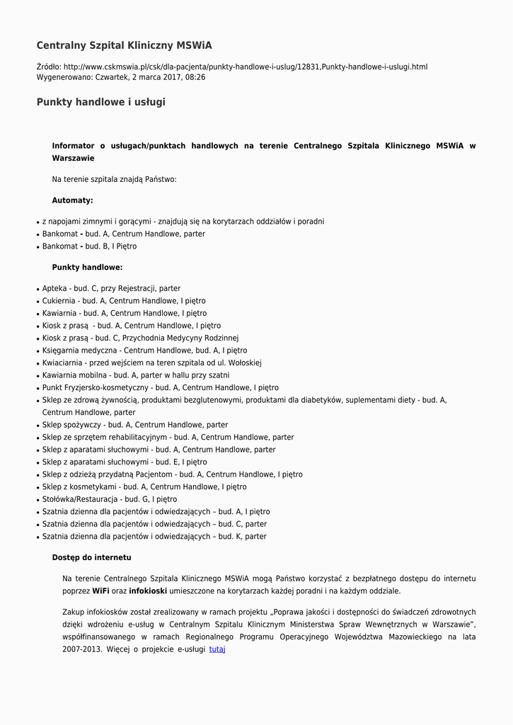 Centralny Szpital Kliniczny MSWiA Źródło: http://www.cskmswia.pl/csk/dla-pacjenta/punkty-handlowe-i-uslug/12831,Punkty-handlowe-i-uslugi.html Wygenerowano: Czwartek, 2 marca 2017, 08:26 Punkty handlowe i usługi Informator o usługach/punktach handlowych na terenie Centralnego Szpitala Klinicznego MSWiA w Warszawie Na terenie szpitala znajdą Państwo: Automaty: ● z napojami zimnymi i gorącymi - znajdują się na korytarzach oddziałów i poradni ● Bankomat - bud. A, Centrum Handlowe, parter ● Bankomat - bud. B, I Piętro Punkty handlowe: ● Apteka - bud. C, przy Rejestracji, parter ● Cukiernia - bud. A, Centrum Handlowe, I piętro ● Kawiarnia - bud. A, Centrum Handlowe, I piętro ● Kiosk z prasą - bud. A, Centrum Handlowe, I piętro ● Kiosk z prasą - bud. C, Przychodnia Medycyny Rodzinnej ● Księgarnia medyczna - Centrum Handlowe, bud. A, I piętro ● Kwiaciarnia - przed wejściem na teren szpitala od ul. Wołoskiej ● Kawiarnia mobilna - bud. A, parter w hallu przy szatni ● Punkt Fryzjersko-kosmetyczny - bud. A, Centrum Handlowe, I piętro ● Sklep ze zdrową żywnością, produktami bezglutenowymi, produktami dla diabetyków, suplementami diety - bud. A, Centrum Handlowe, parter ● Sklep spożywczy - bud. A, Centrum Handlowe, parter ● Sklep ze sprzętem rehabilitacyjnym - bud. A, Centrum Handlowe, parter ● Sklep z aparatami słuchowymi - bud. A, Centrum Handlowe, parter ● Sklep z aparatami słuchowymi - bud. E, I piętro ● Sklep z odzieżą przydatną Pacjentom - bud. A, Centrum Handlowe, I piętro ● Sklep z kosmetykami - bud. A, Centrum Handlowe, I piętro ● Stołówka/Restauracja - bud. G, I piętro ● Szatnia dzienna dla pacjentów i odwiedzających – bud. A, I piętro ● Szatnia dzienna dla pacjentów i odwiedzających – bud. C, parter ● Szatnia dzienna dla pacjentów i odwiedzających – bud. K, parter Dostęp do internetu Na terenie Centralnego Szpitala Klinicznego MSWiA mogą Państwo korzystać z bezpłatnego dostępu do internetu poprzez WiFi oraz infokioski umieszczone na korytarzach każdej poradni i na każdym oddziale. Zakup infokiosków został zrealizowany w ramach projektu „Poprawa jakości i dostępności do świadczeń zdrowotnych dzięki wdrożeniu e-usług w Centralnym Szpitalu Klinicznym Ministerstwa Spraw Wewnętrznych w Warszawie”, współfinansowanego w ramach Regionalnego Programu Operacyjnego Województwa Mazowieckiego na lata 2007-2013. Więcej o projekcie e-usługi tutaj Drukuj Generuj PDF Powiadom znajomego Wstecz