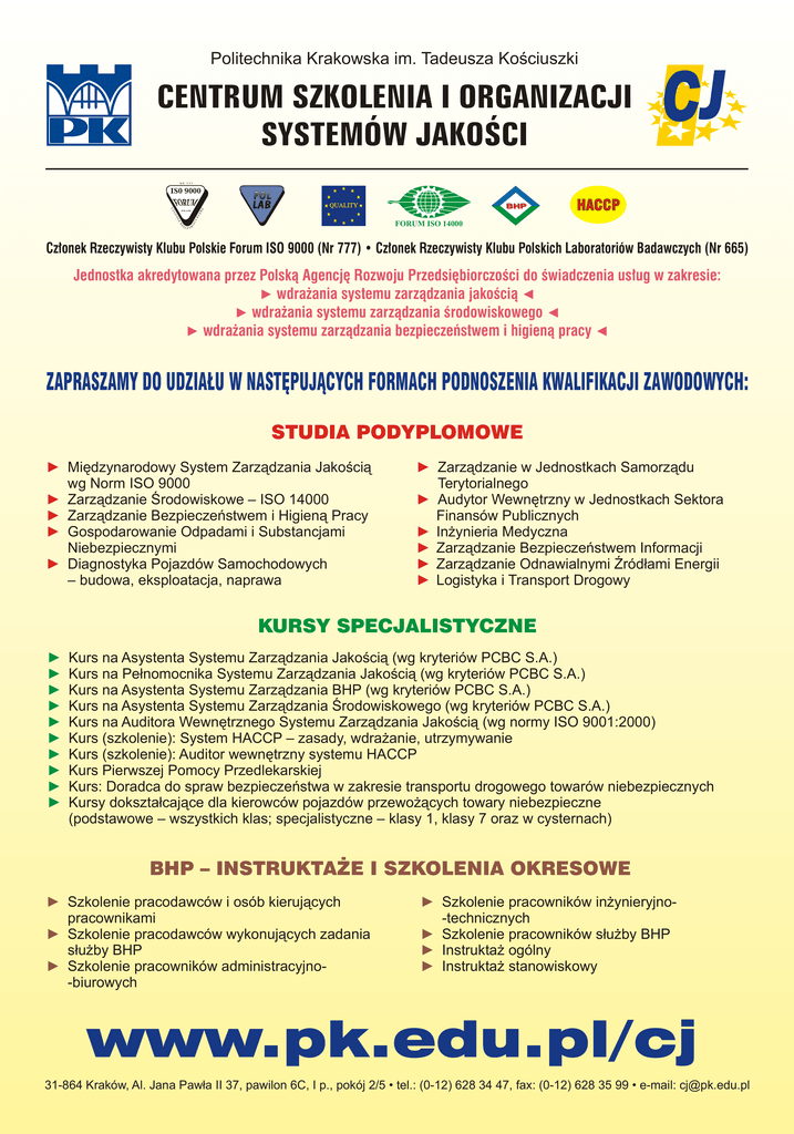 Politechnika Krakowska im. Tadeusza Kościuszki CENTRUM SZKOLENIA I ORGANIZACJI SYSTEMÓW JAKOŚCI NR 777 CZ U IS0 9000 RZ EC FORUM ISO 14000 IS K TY NE KL ŁO UB POLAND ZYW Członek Rzeczywisty Klubu Polskie Forum ISO 9000 (Nr 777) • Członek Rzeczywisty Klubu Polskich Laboratoriów Badawczych (Nr 665) Jednostka akredytowana przez Polską Agencję Rozwoju Przedsiębiorczości do świadczenia usług w zakresie: ► wdrażania systemu zarządzania jakością ◄ ► wdrażania systemu zarządzania środowiskowego ◄ ► wdrażania systemu zarządzania bezpieczeństwem i higieną pracy ◄ ZAPRASZAMY DO UDZIAŁU W NASTĘPUJĄCYCH FORMACH PODNOSZENIA KWALIFIKACJI ZAWODOWYCH: STUDIA PODYPLOMOWE ► Międzynarodowy System Zarządzania Jakością wg Norm ISO 9000 ► Zarządzanie Środowiskowe – ISO 14000 ► Zarządzanie Bezpieczeństwem i Higieną Pracy ► Gospodarowanie Odpadami i Substancjami Niebezpiecznymi ► Diagnostyka Pojazdów Samochodowych – budowa, eksploatacja, naprawa ► Zarządzanie w Jednostkach Samorządu Terytorialnego ► Audytor Wewnętrzny w Jednostkach Sektora Finansów Publicznych ► Inżynieria Medyczna ► Zarządzanie Bezpieczeństwem Informacji ► Zarządzanie Odnawialnymi Źródłami Energii ► Logistyka i Transport Drogowy KURSY SPECJALISTYCZNE ► ► ► ► ► ► ► ► ► ► Kurs na Asystenta Systemu Zarządzania Jakością (wg kryteriów PCBC S.A.) Kurs na Pełnomocnika Systemu Zarządzania Jakością (wg kryteriów PCBC S.A.) Kurs na Asystenta Systemu Zarządzania BHP (wg kryteriów PCBC S.A.) Kurs na Asystenta Systemu Zarządzania Środowiskowego (wg kryteriów PCBC S.A.) Kurs na Auditora Wewnętrznego Systemu Zarządzania Jakością (wg normy ISO 9001:2000) Kurs (szkolenie): System HACCP – zasady, wdrażanie, utrzymywanie Kurs (szkolenie): Auditor wewnętrzny systemu HACCP Kurs Pierwszej Pomocy Przedlekarskiej Kurs: Doradca do spraw bezpieczeństwa w zakresie transportu drogowego towarów niebezpiecznych Kursy dokształcające dla kierowców pojazdów przewożących towary niebezpieczne (podstawowe – wszystkich klas; specjalistyczne – klasy 1, klasy 7 oraz w cysternach) BHP – INSTRUKTAŻE I SZKOLENIA OKRESOWE ► Szkolenie pracodawców i osób kierujących pracownikami ► Szkolenie pracodawców wykonujących zadania służby BHP ► Szkolenie pracowników administracyjno-biurowych ► Szkolenie pracowników inżynieryjno-technicznych ► Szkolenie pracowników służby BHP ► Instruktaż ogólny ► Instruktaż stanowiskowy www.pk.edu.pl/cj 31-864 Kraków, Al. Jana Pawła II 37, pawilon 6C, I p., pokój 2/5 • tel.: (0-12) 628 34 47, fax: (0-12) 628 35 99 • e-mail: [email protected]