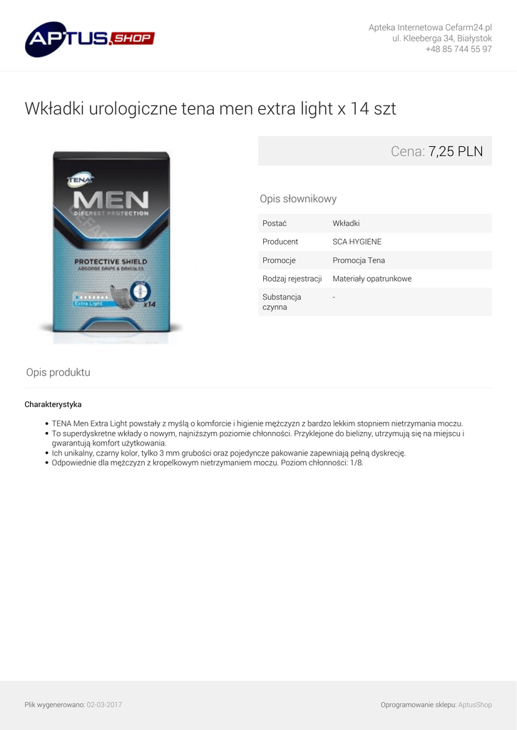 Apteka Internetowa Cefarm24.pl ul. Kleeberga 34, Białystok +48 85 744 55 97 Wkładki urologiczne tena men extra light x 14 szt Cena: 7,25 PLN Opis słownikowy Postać Wkładki Producent SCA HYGIENE Promocje Promocja Tena Rodzaj rejestracji Materiały opatrunkowe Substancja czynna - Opis produktu Charakterystyka TENA Men Extra Light powstały z myślą o komforcie i higienie mężczyzn z bardzo lekkim stopniem nietrzymania moczu. To superdyskretne wkłady o nowym, najniższym poziomie chłonności. Przyklejone do bielizny, utrzymują się na miejscu i gwarantują komfort użytkowania. Ich unikalny, czarny kolor, tylko 3 mm grubości oraz pojedyncze pakowanie zapewniają pełną dyskrecję. Odpowiednie dla mężczyzn z kropelkowym nietrzymaniem moczu. Poziom chłonności: 1/8. Plik wygenerowano: 02-03-2017 Powered by TCPDF (www.tcpdf.org) Oprogramowanie sklepu: AptusShop