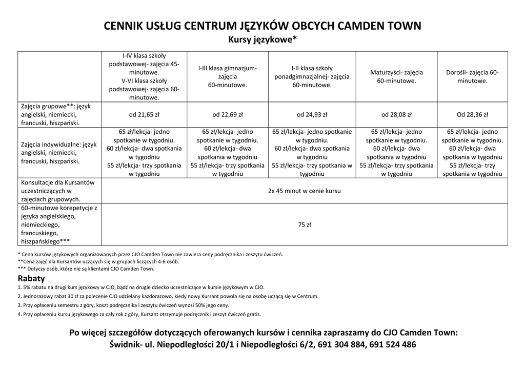CENNIK USŁUG CENTRUM JĘZYKÓW OBCYCH CAMDEN TOWN Kursy językowe* Zajęcia grupowe**: język angielski, niemiecki, francuski, hiszpański. Zajęcia indywidualne: język angielski, niemiecki, francuski, hiszpański. I-IV klasa szkoły podstawowej- zajęcia 45minutowe. V-VI klasa szkoły podstawowej- zajęcia 60minutowe. I-III klasa gimnazjumzajęcia 60-minutowe. I-II klasa szkoły ponadgimnazjalnej- zajęcia 60-minutowe. Maturzyści- zajęcia 60-minutowe. Dorośli- zajęcia 60minutowe. od 21,65 zł od 22,69 zł od 24,93 zł od 28,08 zł Od 28,36 zł 65 zł/lekcja- jedno spotkanie w tygodniu. 60 zł/lekcja- dwa spotkania w tygodniu 55 zł/lekcja- trzy spotkania w tygodniu 65 zł/lekcja- jedno spotkanie w tygodniu. 60 zł/lekcja- dwa spotkania w tygodniu 55 zł/lekcja- trzy spotkania w tygodniu 65 zł/lekcja- jedno spotkanie w tygodniu. 60 zł/lekcja- dwa spotkania w tygodniu 55 zł/lekcja- trzy spotkania w tygodniu 65 zł/lekcja- jedno spotkanie w tygodniu. 60 zł/lekcja- dwa spotkania w tygodniu 55 zł/lekcja- trzy spotkania w tygodniu 65 zł/lekcja- jedno spotkanie w tygodniu. 60 zł/lekcja- dwa spotkania w tygodniu 55 zł/lekcja- trzy spotkania w tygodniu Konsultacje dla Kursantów uczestniczących w zajęciach grupowych. 60-minutowe korepetycje z języka angielskiego, niemieckiego, francuskiego, hiszpańskiego*** 2x 45 minut w cenie kursu 75 zł * Cena kursów językowych organizowanych przez CJO Camden Town nie zawiera ceny podręcznika i zeszytu ćwiczeń. **Cena zajęć dla Kursantów uczących się w grupach liczących 4-6 osób. *** Dotyczy osób, które nie są klientami CJO Camden Town. Rabaty 1. 5% rabatu na drugi kurs językowy w CJO, bądź na drugie dziecko uczestniczące w kursie językowym w CJO. 2. Jednorazowy rabat 30 zł za polecenie CJO udzielany każdorazowo, kiedy nowy Kursant powoła się na osobę uczącą się w Centrum. 3. Przy opłaceniu semestru z góry, koszt podręcznika i zeszytu ćwiczeń wynosi 50% jego ceny. 4. Przy opłaceniu kursu językowego za cały rok z góry, Kursant otrzymuje podręcznik i zeszyt ćwiczeń gratis. Po więcej szczegółów dotyczących oferowanych kursów i cennika zapraszamy do CJO Camden Town: Świdnik- ul. Niepodległości 20/1 i Niepodległości 6/2, 691 304 884, 691 524 486 Garbów Drugi- ul. Młyńska 3 (przy Starym Młynie), 661 511 611 Tłumaczenia nieprzysięgłe Tłumaczenia do 1800 znaków na stronie Tłumaczenie: język angielski, niemiecki, francuski, hiszpański. 40 Tłumaczenia ekspresowe do 1800 znaków na stronie 60 Tłumaczenia specjalistyczne (biznesowe, techniczne, prawnicze, medyczne) do 1800 znaków na stronie inne 50 Cena niestandardowych tłumaczeń jest ustalana indywidualnie po zapoznaniu się z treścią tłumaczenia oraz umówieniu terminu, do którego Centrum zobowiązuje się przetłumaczyć dany tekst.
