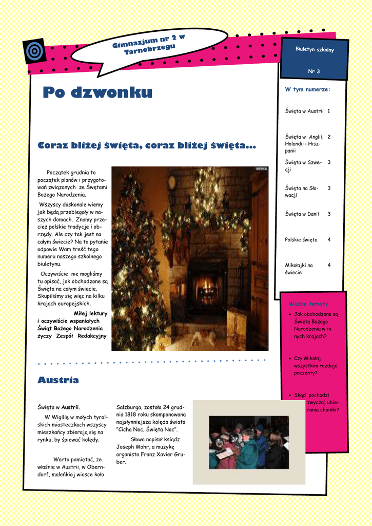 2w jum nr z a n m Gi rzegu Tarnob Biuletyn szkolny Nr 3 Po dzwonku W tym numerze: Święta w Austrii 1 Coraz bliżej święta, coraz bliżej święta... Początek grudnia to początek planów i przygotowań związanych ze Śwętami Bożego Narodzenia. Wszyscy doskonale wiemy jak będą przebiegały w naszych domach. Znamy przecież polskie tradycje i obrzędy. Ale czy tak jest na całym świecie? Na to pytanie odpowie Wam treść tego numeru naszego szkolnego biuletynu. Oczywiście nie mogliśmy tu opisać, jak obchodzone są Święta na całym świecie. Skupiliśmy się więc na kilku krajach europejskich. Warto pamiętać, że właśnie w Austrii, w Oberndorf, maleńkiej wiosce koło 3 Święta na Słowacji 3 Święta w Danii 3 Polskie święta 4 Mikołajki na świecie 4 Jak obchodzone są Święta Bożego Narodzenia w innych krajach? Czy Mikołaj wszystkim rozdaje prezenty? Austria W Wigilię w małych tyrolskich miasteczkach wszyscy mieszkańcy zbierają się na rynku, by śpiewać kolędy. Święta w Szwecji Ważne tematy: Miłej lektury i oczywiście wspaniałych Świąt Bożego Narodzenia życzy Zespół Redakcyjny Święta w Austrii. Święta w Anglii, 2 Holandii i Hiszpanii Salzburga, została 24 grudnia 1818 roku skomponowana najsłynniejsza kolęda świata ”Cicha Noc, Święta Noc”. Słowa napisał ksiądz Joseph Mohr, a muzykę organista Franz Xavier Gruber. Skąd pochodzi zwyczaj ubierania choinki? Wielka Brytania Zwyczaje Świąteczne w Wielkiej Bry- przypraw i owoców. tanii. Przyjaciele i krewni dalą sobie Dzieci bawią się „crackerami” – rozrywają je, aby wydobyć z ich wnętrza zabawki lub karteczki z zabawnymi sentencjami. W Boże Narodzenie rodziny starają się być razem, siedzą przy choince śpiewają kolędy i świąteczne piosenki . wiele prezentów, które należy otworzyć dopiero w bożonarodzeniowy poranek. W wielu domach jest zawieszona jemioła, pod którą można na szczęście pocałować swego chłopaka czy dziewczynę, męża czy żonę. Tradycyjny świąteczny obiad to pieczony indyk, pieczone ziemniaki, brukselka i specjalne ciasto pełne Choinka przywędrowała do nas z Niemiec, gdzie była podobno znana już w VII wieku. Hiszpania Boże Narodzenie świętowane jest w aktorów, a przez miasto przechodzi Hiszpanii szczególnie. Stanowi jedną z świąteczny korowód, w którym uczest- licznych okazji do rodzinnych spotkań. niczą mieszkańcy ubrani w stroje ludo- Rodzina spotyka się wieczorem przy we oraz przybrane wstążkami zwierzę- wspólnym posiłku przed wyjściem na ta. Kończy się on w miejscowej stajen- pasterkę zwaną tu „msza koguta”. W ce. tym okresie można oglądać wiele szopek, odgrywane są także misteria przez Hiszpanie bogato dekorują swoje domy. Holandia Święta w Holandii to nie gotowanie, ale Przeciętnie każda rodzina wysyła ich z pisanie. Holandia to kraj umiaru. Święta okazji Świąt Bożego Narodzenia 30-50. nie stoją pod znakiem suto zastawio- W niektórych wiejskich regionach nych stołów, nie ma specjalnych potraw adwent jest celebrowany w szcze- świątecznych, czy wypieków. Bo dni gólny sposób. Odbywa się wtedy przedświąteczne spędzają Holendrzy tzw. midwinterhoornblazen, czyli nie na gotowaniu, ale na pisaniu kartek. zimowe dęcie w róg. Str. 2 Podpis do obrazu/grafiki. Po dzwonku Słowacja Kolację wigilijną rozpoczyna się na Sło- Popularne są również opiekańce - ro- wacji od modlitwy, skropienia stołu dzaj ciasteczek z makiem, twarogiem święconą wodą i podzielenia się opłatkiem z miodem i orzechami. Jest także opłatek z czosnkiem. Miód symbolizuje lub dżemem. We wschodniej Słowacji nazywają je "bobalkami" i dodają do nich maku i mleka. Oczywiście należy wstrzymać się dobroć i miłość przez cały rok, a czosnek zdrowie. Na stole nie powinno zabraknąć orzechów. Każdy wybiera sobie jeden – jeśli trafi na dobry, to będzie miał szczęście przez cały rok. z jedzeniem aż do wigilijnej kolacji. I jeszcze jedno. Aby za rok wszyscy Podpis do obrazu/grafiki. spotkali się znów przy tym samym stole opasuje się go jednym łańcuchem Dania Duńską choinkę łatwo można odróżnić dziej popularnych kolęd są słowa: ”Boże od bożonarodzeniowych drzewek w po- Narodzenie trwa długo i dużo kosztu- zostałych krajach chrześcijańskich, bo je”. jest gęsto upstrzona małymi duńskimi chorągiewkami. Rozdawanie prezentów gwiazdkowych jest głównym punktem programu spotkania wigilijnego. Gwiazdka jest od dawna w Danii wydarzeniem Do świątecznej tradycji należy zapalanie świec –kalendarzy. niemal całkowicie świeckim, nic przeto dziwnego, że refrenem jednej z najbar- Szwecja Świętowanie rozpoczyna się tu już 13 grudnia, w dzień Świętej Łucji. Szwedzi uważają, że przypada wtedy najdłuższa i W Święta dziewczynki ubierają długie, białe suknie, a na głowy zakładają korony z zapalonymi świecami, które są symbolem światła. Tak ubrane obsługują resztę rodziny, podając im kawę i cyna- najciemniejsza noc w całym ro- monowe bułeczki. Wszyscy śpiewają ku. przy tym kolędy. Biuletyn szkolny Podpis do obrazu/grafiki. Str. 3 Boże Narodzenie, Narodzenie Pańskie – w tradycji chrześcijańskiej – święto upamiętniają ce narodziny Jezusa Chrystusa. Jest to stała uroczyst ość liturgiczna, przypadająca na 25 grudnia. Boże Nar odzenie poprzedzone jest okresem trzytygodnioweg o oczekiwania (dokładnie czterech niedziel), zwanego adwentem. W Kościołach, które nadal celebrują liturgię według kalendarza juliańskiego (tzw. Kościoły wsch odnie, głównie Cerkiew Greckokatolicka i Kościół praw osławny), Boże Narodzenie przypada na 25 grudnia kale ndarza juliańskiego, tzn. obecnie 7 stycznia kalendarza gregoriańskiego Organizacja A co z prezentami od Mikołaja?... W jaki sposób Święty Miko- Święty Mikołaj wypełnia buty słody- łaj przynosi prezenty dzie- czami. ciom w różnych krajach? W Hiszp