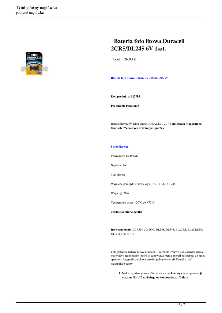Bateria foto litowa Duracell 2CR5/DL245 6V 1szt.