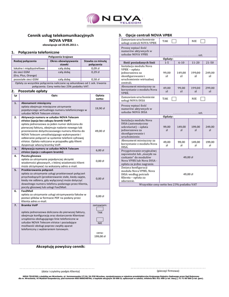 3. Opcje centrali NOVA VPBX Cennik usług telekomunikacyjnych NOVA VPBX Zamawiam uruchomienie usługi centrali NOVA VPBX obowiązuje od 20.05.2011 r. Proszę wpisać ilość numerów aktywnych w usłudze NOVA VPBX 1. Połączenia telefoniczne Rodzaj połączenia Połączenia krajowe Okres obowiązywania stawki całą dobę całą dobę Stawka za minutę połączenia 0,09 zł 0,29 zł lokalne i międzystrefowe do sieci GSM (Era, Plus, Orange) pozostałe sieci GSM całą dobę 0,58 zł Opłaty za wszystkie połączenia naliczane są sekundowo od 1 sek. trwania połączenia. Ceny netto bez 23% podatku VAT. 2. Pozostałe opłaty Lp Opis: 1. Abonament miesięczny opłata obejmuje miesięczne utrzymanie pojedynczego wirtualnego numeru telefonicznego w usłudze NOVA Telecom eVoice. Aktywacja numeru w usłudze NOVA Telecom eVoice (opcja bez zakupu bramki VoIP) opłata jednorazowa za jeden numer doliczana do pierwszej faktury, obejmuje nadanie nowego lub przeniesienie dotychczasowego numeru Klienta do NOVA Telecom umożliwiającego wykonywanie i odbieranie połączeo w systemie telefonii cyfrowej eVoice. Opłata naliczana w przypadku gdy Klient dysponuje własną bramką VoIP. Aktywacja numeru w usłudze NOVA Telecom eVoice (opcja z zakupem bramki) Poczta głosowa opłata za utrzymanie pojedynczej skrzynki wiadomości głosowych, z której wiadomości Klient może otrzymywad na wskazany adres e-mail. Przekierowania połączeo opłata za utrzymanie usługi przekierowao połączeo przychodzących (przekierowanie stałe, kiedy zajęte, kiedy nie odbiera, gdy wyłączony) może dotyczyd dowolnego numeru telefonu podanego przez Klienta, poczty głosowej lub usługi Fax2Mail. Fax2Mail opłata za utrzymanie usługi otrzymywania faksów w postaci plików w formacie PDF na podany przez Klienta adres e-mail. Bramka VoIP 2. 3. 4. 5. 6. 7. TAK Opłata netto: 19,90 zł Ilość posiadanych linii Instalacja modułu Nova VPBX – opłata jednorazowa za skonfigurowanie i uruchomienie wirtualnej centrali. Abonament miesięczny za korzystanie z modułu Nova VPBX. Zamawiam uruchomienie usługi NOVA DISA NIE . . . . . . . . . . . . . . . . . . . szt. Opłaty: 1-5 6-10 11-20 21-50 99,00 zł 149,00 zł 199,00 zł 249,00 zł 49,00 zł 99,00 zł 199,00 zł 299,00 zł TAK Proszę wpisać ilość numerów aktywnych w usłudze NOVA DISA NIE . . . . . . . . . . . . . . . . . . . szt. Opłaty: 49,00 zł 6,00 zł 0,00 zł 0,00 zł Instalacja modułu Nova DISA (automatyczny 99,00 149,00 199,00 sekretariat) – opłata jednorazowa za zł zł zł skonfigurowanie i uruchomienie. Abonament miesięczny za 49,00 99,00 149,00 korzystanie z modułu Nova zł zł zł DISA. Przygotowanie oryginalnej zapowiedzi lub „muzyki na 49,00 zł czekanie” do modułów Nova VPBX lub Nova DISA opłata za jedno nagranie. Zmiana konfiguracji modułu Nova VPBX, Nova 49,00 zł DISA według potrzeb Klienta – opłata za zdarzenie. Wszystkie ceny netto bez 23% podatku VAT 0,00 zł zamawiam: opłata jednorazowa doliczana do pierwszej faktury, obejmuje konfigurację oraz dostarczenie Klientowi urządzenia obsługującego linie telefoniczne w usłudze NOVA Telecom eVoice i posiadające możliwośd obsługi poprzez zwykły aparat telefoniczny z wybieraniem tonowym. TAK NIE cena: 199,00 zł Akceptuję powyższy cennik: ................................................... (data i czytelny podpis Klienta) ................................................... (pieczęd firmowa) NOVA TELECOM z siedzibą we Wrocławiu, ul. Jerzmanowska 17/16, 54-530 Wrocław, zarejestrowaną w rejestrze przedsiębiorców Krajowego Rejestru Sądowego przez Sąd Rejonowy dla m. Wrocławia, VI Wydział Gospodarczy, pod numerem KRS 0000348766, o kapitale akcyjnym 30 000 zł, opłaconym w całości, infolinia 801 911 900 (z tel. stacj.), 71 71 60 500 (z tel. gsm). 249,00 zł 199,00 zł KRAJ DO SIECI DO SIECI STACJ GSM KRAJ DO SIECI DO SIECI STACJ GSM KRAJ DO SIECI STACJ DO SIECI GSM AFGANISTAN 3,45 zł 3,45 zł HONDURAS 3,45 zł 3,45 zł PALAU 8,00 zł 8,00 zł AFRYKA POŁUDNIOWA 1,04 zł 1,04 zł HONG KONG 1,04 zł 1,04 zł PALESTYNA 3,45 zł 3,45 zł ALBANIA 1,04 zł 1,04 zł INDIE 1,04 zł 1,04 zł PANAMA 3,45 zł 3,45 zł ALGIERIA 1,04 zł 1,04 zł INDONEZJA 3,45 zł 3,45 zł PAPUA (NOWA GWINEA) 3,45 zł 3,45 zł ANDORA 0,49 zł 1,09 zł INMARSAT 40,00 zł 40,00 zł PARAGWAJ 3,45 zł 3,45 zł ANGOLA 3,45 zł 3,45 zł IRAK 3,45 zł 3,45 zł PERU 3,45 zł 3,45 zł ANGUILLA 3,45 zł 3,45 zł IRAN 3,45 zł 3,45 zł POLINEZJA FRANCUSKA 3,45 zł 3,45 zł ANTARKTYDA 4,50 zł 4,50 zł IRLANDIA 0,49 zł 1,04 zł PORTUGALIA 0,49 zł 1,04 zł ANTIGUA & BARBUDA 3,45 zł 3,45 zł ISLANDIA 0,49 zł 1,04 zł PUERTO RICO 3,45 zł 3,45 zł ANTYLE HOLENDERSKIE 3,45 zł 3,45 zł IZRAEL 1,04 zł 1,04 zł REPUBLIKA SALWADORU 3,45 zł 3,45 zł ARABIA SAUDYJSKA 3,45 zł 3,45 zł JAMAJKA 3,45 zł 3,45 zł REPUBLIKA ŚRODK. AFRYKAŃSKA 3,45 zł 3,45 zł ARGENTYNA 1,04 zł 1,04 zł JAPONIA 1,04 zł 1,04 zł REUNION 3,45 zł 3,45 zł ARMENIA 1,04 zł 1,04 zł JEMEN 3,45 zł 3,45 zł ROSJA 1,09 zł 1,09 zł ARUBA 3,45 zł 3,45 zł JORDANIA 3,45 zł 3,45 zł RUMUNIA 1,09 zł 1,09 zł AUSTRALIA 0,49 zł 0,49 zł SERBIA I CZARNOGÓRA 1,09 zł 1,09 zł RWANDA 3,45 zł 3,45 zł AUSTRIA 0,49 zł 1,09 zł KAJMANY 3,45 zł 3,45 zł SALOMONA (WYSPY) 3,45 zł 3,45 zł AZERBEJDŹAN 1,04 zł 1,04 zł KAMBODŻA 3,45 zł 3,45 zł SALWADOR 3,45 zł 3,45 zł BAHRAIN 3,45 zł 3,45 zł KAMERUN 3,45 zł 3,45 zł SAMOA AMERYKAŃSKIE 3,45 zł 3,45 zł BANGLADESZ 3,45 zł 3,45 zł KANADA 0,49 zł 0,49 zł SAMOA ZACHODNIE 3,45 zł 3,45 zł BARBADOS 3,45 zł 3,45 zł KATAR 3,45 zł 3,45 zł SAN MARINO 0,49 zł 0,49 zł BELGIA 0,49 zł 1,09 zł KAZACHSTAN 1,04 zł 1,04 zł SENEGAL 3,45 zł 3,45 zł BELIZE 3,45 zł 3,45 zł KENIA 3,45 zł 3,45 zł SESZELE 3,45 zł 3,45 zł BENIN 3,45 zł 3,45 zł KIRGISTAN 1,04 zł 1,04 zł SIERRA LEONE 3,45 zł 3,45 zł BERMUDY 3,45 zł 3,45 zł KIRIBATI 3,45 zł 3,45 zł SINGAPUR 1,04 zł 1,04 zł BH