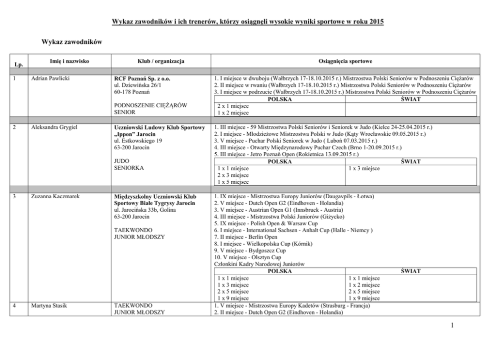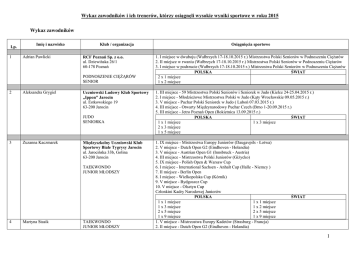 Wykaz zawodników i ich trenerów, którzy osiągnęli wysokie wyniki sportowe w roku 2015 Wykaz zawodników Lp. 1 Imię i nazwisko Adrian Pawlicki Klub / organizacja RCF Poznań Sp. z o.o. ul. Dziewińska 26/1 60-178 Poznań PODNOSZENIE CIĘŻĄRÓW SENIOR 2 Aleksandra Grygiel Uczniowski Ludowy Klub Sportowy „Ippon” Jarocin ul. Estkowskiego 19 63-200 Jarocin JUDO SENIORKA 3 Zuzanna Kaczmarek Międzyszkolny Uczniowski Klub Sportowy Białe Tygrysy Jarocin ul. Jarocińska 33b, Golina 63-200 Jarocin TAEKWONDO JUNIOR MŁODSZY 4 Martyna Stasik TAEKWONDO JUNIOR MŁODSZY Osiągnięcia sportowe 1. I miejsce w dwuboju (Wałbrzych 17-18.10.2015 r.) Mistrzostwa Polski Seniorów w Podnoszeniu Ciężarów 2. II miejsce w rwaniu (Wałbrzych 17-18.10.2015 r.) Mistrzostwa Polski Seniorów w Podnoszeniu Ciężarów 3. I miejsce w podrzucie (Wałbrzych 17-18.10.2015 r.) Mistrzostwa Polski Seniorów w Podnoszeniu Ciężarów POLSKA ŚWIAT 2 x 1 miejsce 1 x 2 miejsce 1. III miejsce - 59 Mistrzostwa Polski Seniorów i Seniorek w Judo (Kielce 24-25.04.2015 r.) 2. I miejsce - Młodzieżowe Mistrzostwa Polski w Judo (Kąty Wrocławskie 09.05.2015 r.) 3. V miejsce - Puchar Polski Seniorek w Judo ( Luboń 07.03.2015 r.) 4. III miejsce - Otwarty Międzynarodowy Puchar Czech (Brno 1-20.09.2015 r.) 5. III miejsce - Jetro Poznań Open (Rokietnica 13.09.2015 r.) POLSKA ŚWIAT 1 x 1 miejsce 1 x 3 miejsce 2 x 3 miejsce 1 x 5 miejsce 1. IX miejsce - Mistrzostwa Europy Juniorów (Daugavpils - Łotwa) 2. V miejsce - Dutch Open G2 (Eindhoven - Holandia) 3. V miejsce - Austrian Open G1 (Innsbruck - Austria) 4. III miejsce - Mistrzostwa Polski Juniorów (Giżycko) 5. IX miejsce - Polish Open & Warsaw Cup 6. I miejsce - International Sachsen - Anhalt Cup (Halle - Niemcy ) 7. II miejsce - Berlin Open 8. I miejsce - Wielkopolska Cup (Kórnik) 9. V miejsce - Bydgoszcz Cup 10. V miejsce - Olsztyn Cup Członkini Kadry Narodowej Juniorów POLSKA 1 x 1 miejsce 1 x 1 miejsce 1 x 3 miejsce 1 x 2 miejsce 2 x 5 miejsce 2 x 5 miejsce 1 x 9 miejsce 1 x 9 miejsce 1. V miejsce - Mistrzostwa Europy Kadetów (Strasburg - Francja) 2. II miejsce - Dutch Open G2 (Eindhoven - Holandia) ŚWIAT 1 5 Katarzyna Półrolniczak TAEKWONDO JUNIOR MŁODSZY 6 Patrycja Adamkiewicz TAEKWONDO JUNIOR MŁODSZY 3. II miejsce - Austrian Open G1 (Innsbruck - Austria) 4. III miejsce - Serbian Open G1 (Belgrad - Serbia) 5. IX miejsce - Croatia Open (Zagrzeb - Chorwacja) 6. I miejsce - Mistrzostwa Polski Juniorów Młodszych - konkurencja Kyorugi (Puławy) 7. V miejsce - Mistrzostwa Polski Juniorów Młodszych - konkurencja dwubój techniczny (Puławy) 8. I miejsce - Polish Open & Warsaw Cup 9. III miejsce - International Sachsen - Anhalt Cup (Halle - Niemcy ) 10. III miejsce - Berlin Open 11. I miejsce - Wielkopolska Cup (Kórnik) 12. I miejsce -Bydgoszcz Cup 13. I miejsce - Olsztyn Cup Członkini Kadry Narodowej Kadetów POLSKA ŚWIAT 5 x 1 miejsce 2 x 2 miejsce 1 x 5 miejsce 3 x 3 miejsce 1 x 5 miejsce 1 x 9 miejsce 1. IX - Austrian Open G1 (Innsbruck - Austria) 2. III miejsce - Mistrzostwa Polski Juniorów młodszych - konkurencja Kyorugi (Puławy) 3. IX miejsce - Mistrzostwa Polski Juniorów Młodszych - konkurencja dwubój techniczny (Puławy) 4. IX - Polish Open & Warsaw Cup 5. III miejsce - International Sachsen - Anhalt Cup (Halle - Niemcy) 6. V miejsce - Berlin Open 7. III miejsce - Wielkopolska Cup (Kórnik) 8. V miejsce - Bydgoszcz Cup 9. V miejsce - Olsztyn Cup 10. I miejsce - Otwarty Turniej Taekwondo o Puchar Burmistrza Kórnika POLSKA ŚWIAT 1 x 1 miejsce 1 x 3 miejsce 2 x 3 miejsce 1 x 5 miejsce 2 x 5 miejsce 1 x 9 miejsce 2 x 9 miejsce 1. II miejsce - Dutch Open G2 ( Eindhoven - Holandia) 2. IX miejsce - Austrian Open G1 (Innsbruck - Austria) 3. I miejsce - Mistrzostwa Polski Juniorów (Giżycko) 4. I miejsce - Berlin Open 5. II miejsce - Wielkopolska Cup (Kórnik) 6. I miejsce - Bydgoszcz Cup Członkini Kadry Narodowej Juniorów Stypendystka Marszałka Województwa Wlkp. Zawodniczka AZS AWF Warszawa POLSKA ŚWIAT 2 x 1 miejsce 1 x 1 miejsce 1 x 2 miejsce 1 x 2 miejsce 1 x 9 miejsce 2 7 Sebastian Brugger Uczniowski Klub Sportowy Taekwondo Jarocin ul. Franciszkańska 1 63-200 Jarocin 1. III miejsce - Mistrzostwa Polski (Borne Sulinowo 04.10.2015 r.) Członek Kadry Narodowej POLSKA 1 x 3 miejsce ŚWIAT TAEKWONDO SENIOR 8 Marcelina Lewandowicz Polski Związek Jeździecki JEŹDZIECTWO 9 Szymon Krawczyk KOLARSTWO 10 Julita Jagodzińska KOLARSTWO 1. I miejsce w zawodach ogólnopolskich z woltyżerki sportowej w kategorii par (Baborówko 16.05.2015 r.) 2. II miejsce w zawodach ogólnopolskich z woltyżerki w konkursie par Cp-1 (Gajewniki 04.10.2015 r.) 3. I miejsce w zawodach towarzyskich w konkursie indywidualnych od lat 14 4. I miejsce w kategorii Tz i I miejsce w kategorii T9 - Zawody w Woltyżerce Sportowej (Jaszków 1415.11.2015 r.) POLSKA ŚWIAT 4 x 1 miejsce 1 x 2 miejsce 1. II miejsce - Młodzieżowe Mistrzostwa Europy na torze w wyścigu punktowym (Ateny 14-19.07.2015 r.) 2. III miejsce - Młodzieżowe Mistrzostwa Europy na torze w jeździe drużynowej (Anteny 14-19.07.2015 r.) 3. IV miejsce - Mistrzostwa Świata Juniorów na torze w wyścigu punktowym (Astana 19-23.08.2015 r.) 4. V miejsce - Mistrzostwa Świata Juniorów na torze w jeździe drużynowej (Astana 19-23.08.2015 r.) 5. II miejsce - Młodzieżowe Mistrzostwa Polski Juniorów na torze w konkurencji Omnium (Pruszków 2628.05.2015 r.) 6. I miejsce - Puchar Polski Juniorów na torze w jeździe drużynowej (Pruszków 26-28.05.2015 r.) 7. I miejsce - Puchar Polski Juniorów na torze w konkurencji Omnium (Pruszków 28.02-01.03.2015 r.) 8. II miejsce - Puchar Polski Juniorów na torze w jeździe drużynowej (Pruszków 28.02-01.03.2015 r.) 9. I miejsce - Mistrzostwa Polski Juniorów w jeździe drużynowej (Godziesze Wielkie 04.10.2015 r.) 10. I miejsce - Mistrzostwa Polski Juniorów w jeździe dwójkami na szosie ( Opatówek 02.10.2015 r.) 11. I miejsce - Mistrzostwa Polski Juniorów w kolars