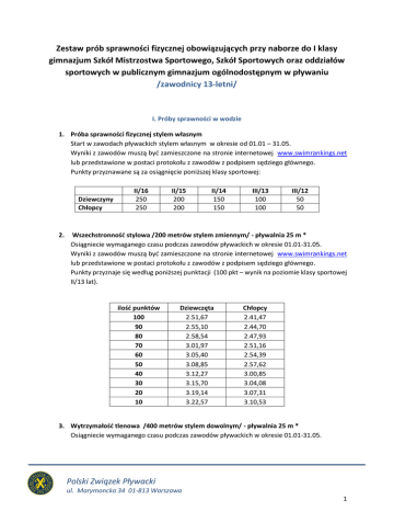 Zestaw prób sprawności fizycznej obowiązujących przy naborze do I klasy gimnazjum Szkół Mistrzostwa Sportowego, Szkół Sportowych oraz oddziałów sportowych w publicznym gimnazjum ogólnodostępnym w pływaniu /zawodnicy 13-letni/ I. Próby sprawności w wodzie 1. Próba sprawności fizycznej stylem własnym Start w zawodach pływackich stylem własnym w okresie od 01.01 – 31.05. Wyniki z zawodów muszą być zamieszczone na stronie internetowej www.swimrankings.net lub przedstawione w postaci protokołu z zawodów z podpisem sędziego głównego. Punkty przyznawane są za osiągnięcie poniższej klasy sportowej: Dziewczyny Chłopcy 2. II/16 250 250 II/15 200 200 II/14 150 150 III/13 100 100 III/12 50 50 Wszechstronność stylowa /200 metrów stylem zmiennym/ - pływalnia 25 m * Osiągniecie wymaganego czasu podczas zawodów pływackich w okresie 01.01-31.05. Wyniki z zawodów muszą być zamieszczone na stronie internetowej www.swimrankings.net lub przedstawione w postaci protokołu z zawodów z podpisem sędziego głównego. Punkty przyznaje się według poniższej punktacji (100 pkt – wynik na poziomie klasy sportowej II/13 lat). ilość punktów 100 90 80 70 60 50 40 30 20 10 Dziewczęta 2.51,67 2.55,10 2.58,54 3.01,97 3.05,40 3.08,85 3.12,27 3.15,70 3.19,14 3.22,57 Chłopcy 2.41,47 2.44,70 2.47,93 2.51,16 2.54,39 2.57,62 3.00,85 3.04,08 3.07,31 3.10,53 3. Wytrzymałość tlenowa /400 metrów stylem dowolnym/ - pływalnia 25 m * Osiągniecie wymaganego czasu podczas zawodów pływackich w okresie 01.01-31.05. _____________________________________________________________________________________________ Polski Związek Pływacki ul. Marymoncka 34 01-813 Warszawa 1 Wyniki z zawodów muszą być zamieszczone na stronie internetowej www.swimrankings.net lub przedstawione w postaci protokołu z zawodów z podpisem sędziego głównego. Punkty przyznaje się według poniższej punktacji (100 pkt – wynik na poziomie klasy sportowej II/13 lat) ilość punktów 100 90 80 70 60 50 40 30 20 10 Dziewczęta 5.13,48 5.19,75 5.26,02 5.32,39 5.38,56 5.44,83 5.51,10 5.57,37 6.03,64 6.09,91 Chłopcy 5.00,70 5.06,71 5.12,73 5.18,74 5.24,76 5.30,77 5.36,78 5.42,80 5.48,81 5.54,83 w przypadku braku wyników z zawodów istnieje możliwość zaliczenia próby podczas testów kwalifikacyjnych 4. Technika pływania – ocena techniki wszystkich styli pływackich /100 punktów/ Oceny techniki dokonuje trener pływania podczas testów kwalifikacyjnych przeprowadzanych w danej placówce a) Styl motylkowy – maksymalnie 25 punktów praca nóg /25 m w ułożeniu na boku/ - oceniamy ułożenie ciała oraz technikę pracy nóg od 1 do 5 pkt. praca ramion /25 m z małą deską pomiędzy podudziami/ - oceniamy chwyt wody, pociągniecie, przenoszenie ramion od 0 do 5 pkt. koordynacja pływania /3 x LR + NN, 3 x PR + NN/ - od 0 do 5 pkt. pływanie całym stylem /35 m szybko ze skoku startowego z nawrotem/ - oceniamy pływanie pod wodą, technikę pływania od 0 do 10 pkt. b) Styl grzbietowy - maksymalnie 25 punktów praca nóg /25m na plecach, ręce za głową/ - oceniamy ułożenie ciała oraz technikę pracy nóg od 1 do 5 pkt. praca ramion /25m z małą deską pomiędzy podudziami/ - oceniamy chwyt wody, pociągniecie, przenoszenie ramion od 0 do 5 pkt. koordynacja pływania /25m LR + NN, PR + NN/ - od 0 do 5 pkt. pływanie całym stylem /35 m szybko ze skoku startowego z nawrotem/ - oceniamy pływanie pod wodą, technikę pływania od 0 do 10 pkt. c) Styl klasyczny – maksymalnie 25 punktów praca nóg /25 m na plecach, 25 m ramiona z przodu / - oceniamy ułożenie ciała oraz technikę pracy nóg od 1 do 5 pkt. _____________________________________________________________________________________________ Polski Związek Pływacki ul. Marymoncka 34 01-813 Warszawa 2 praca ramion /25 z małą deską pomiędzy podudziami/ - oceniamy chwyt wody, pociągniecie, przenoszenie ramion od 0 do 5 pkt. koordynacja pływania /2 x NN 1 x RR/ - od 0 do 5 pkt. pływanie całym stylem /35 m szybko ze skoku startowego z nawrotem/ - oceniamy pływanie pod wodą, technikę pływania od 0 do 10 pkt. d) Styl dowolny – maksymalnie 25 punktów praca nóg /25m na boku/ - oceniamy ułożenie ciała oraz technikę pracy nóg od 1 do 5 pkt. praca ramion /25m z małą deską pomiędzy podudziami/ - oceniamy chwyt wody, pociągniecie, przenoszenie ramion od 0 do 5 pkt. koordynacja pływania /25m LR z oddechem z prawą stronę , 25m PR z oddechem na lewą stronę/ - od 0 do 5 pkt. pływanie całym stylem /35 m szybko ze skoku startowego z nawrotem/ - oceniamy pływanie pod wodą, technikę pływania od 0 do 10 pkt. II. Próby sprawności na lądzie 1. Siła kończyn górnych – zwis/podciąganie na drążku a) wykonanie /dziewczęta/ Z przestawionego krzesła badana przechodzi do zwisu nachwytem o ramionach ugiętych. Dłonie winny znajdować się na szerokość barków. Na sygnał "start" zaczyna się próba zwisu i trwa aż do zmęczenia. Podbródek w czasie trwania testu winien znajdować się wyraźnie nad drążkiem. b) pomiar Próba wykonywana jest l raz. Liczy się ilość wytrzymanych sekund w wspomnianej pozycji. Pomiar kończy się z chwilą, gdy podbródek znajduje się poniżej drążka. c) uwagi Drążek musi być tak usytuowany, by badany wykonywał próbę w pełnym zwisie. a) wykonanie /chłopcy/ Z przystawionego krzesła badany przechodzi do zwisu nachwytem. Ręce znajdują się na szerokości barków. Na sygnał "start" testowany ugina ręce podciągając się na wysokość podbródka, po czym bez chwili odpoczynku przechodzi do zwisu prostego. Ćwiczenie powtarza się aż do chwili zmęczenia. b) pomiar Próba wykonana jest l raz. Liczy się ilość pełnych podciągnięć na wysokość podbródka, z pełnego zwisu. c) uwagi Test należy przerwać, jeśli badany zrobi przerwę wynoszącą 2 sekundy i dłuższa. Drążek winien być tak usytuowany, by testowany wykonywał próbę w pełnym zwisie. ___________