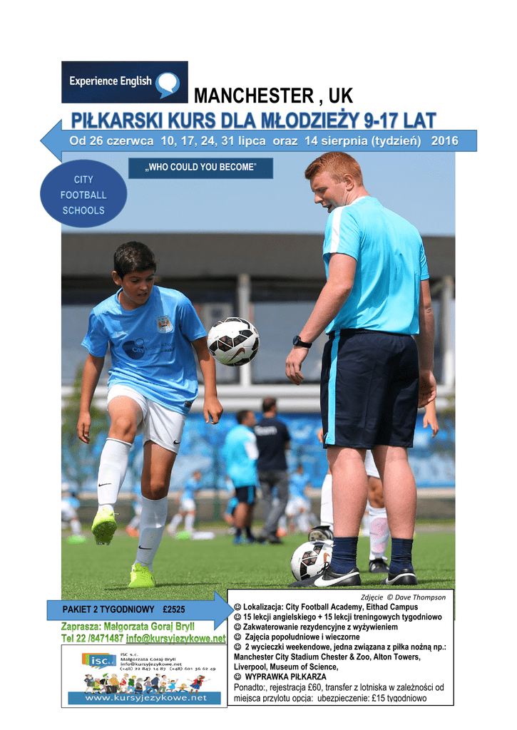 MANCHESTER , UK Od 26 czerwca 10, 17, 24, 31 lipca oraz 14 sierpnia (tydzień) 2016 „WHO COULD YOU BECOME” Zdjęcie © Dave Thompson PAKIET 2 TYGODNIOWY £2525 Lokalizacja: City Football Academy, Eithad Campus 15 lekcji angielskiego + 15 lekcji treningowych tygodniowo Zakwaterowanie rezydencyjne z wyżywieniem Zajęcia popołudniowe i wieczorne 2 wycieczki weekendowe, jedna związana z piłka nożną np.: Manchester City Stadium Chester & Zoo, Alton Towers, Liverpool, Museum of Science, WYPRAWKA PIŁKARZA Ponadto:, rejestracja £60, transfer z lotniska w zależności od miejsca przylotu opcja: ubezpieczenie: £15 tygodniowo