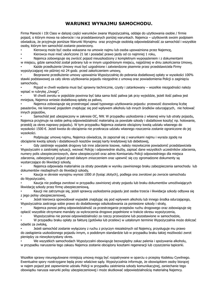 WARUNKI WYNAJMU SAMOCHODU. Firma Marecki i 1St Class w dalszej części warunków zwana Wypożyczalnią, oddaje do użytkowania osobie / firmie pojazd, o którym mowa na odwrocie i na przedstawionych poniżej warunkach. Najemca – użytkownik swoim podpisem oświadcza, że przyjmuje poniższe Warunki Wynajmu oraz przyjmuje osobistą odpowiedzialność za samochód i wszystkie osoby, którym ten samochód zostanie powierzony. • Kierowcą może być osoba wskazana na umowie najmu lub osoba upoważniona przez Najemcę, • Kierowca musi mieć ukończone 21 lat i posiadać prawo jazdy od co najmniej 1 roku, • Najemca zobowiązuje się zwrócić pojazd nieuszkodzony z kompletnym wyposażeniem i z dokumentami w miejscu, gdzie samochód został pobrany lub w innym uzgodnionym miejscu, najpóźniej w dniu zakończenia Umowy, • Każde przedłużenie Umowy musi być uzgodnione i zatwierdzone pisemnie przez przedstawiciela Firmy wypożyczającej nie później niż 24 godz. przed zakończeniem umowy, • Bezprawne przedłużenie umowy upoważnia Wypożyczalnię do pobrania dodatkowej opłaty w wysokości 100% stawki podstawowej za cały okres użytkowania pojazdu niezgodnie z umową oraz powiadomienia Policji o zaginięciu samochodu, • Pojazd w chwili wydania musi być sprawny technicznie, czysty i zatankowany – wszelkie niezgodności należy wpisać w rubrykę „Uwagi”, • W chwili zwrotu w pojeździe powinna być taka sama ilość paliwa jak przy wyjeździe, jeżeli ilość paliwa jest mniejsza, Najemca wniesie dodatkową opłatę za paliwo, • Najemca zobowiązuje się przestrzegać zasad typowego użytkowania pojazdu: przewozić dozwoloną liczbę pasażerów, nie kierować pojazdem znajdując się pod wpływem alkoholu lub innych środków odurzających, nie holować innych pojazdów, • Samochód jest ubezpieczony w zakresie OC, NW. W przypadku uszkodzenia z własnej winy lub utraty pojazdu, Najemca przyjmuje na siebie pełną odpowiedzialność materialną za powstałe szkody i dodatkowe koszty( np. holowanie, przestój za okres naprawy pojazdu). W tym przypadku Najemca zostanie obciążony kwotą udziału własnego do wysokości 1500 €. Jeżeli kwota do obciążenia nie przekracza udziału własnego roszczenia zostanie ograniczone do jej wysokości. • Podpisując umowę najmu, Najemca oświadcza, że zapoznał się z warunkami najmu i wyraża zgodę na obciążenie kwotą szkody i dodatkowych kosztów swojej karty kredytowej lub debetowej, • Gdy zaistnieje wypadek drogowy lub inne zdarzenie losowe, należy niezwłocznie powiadomić przedstawiciela Wypożyczalni o zaistniałej sytuacji, wezwać Policję i odpowiednie służby, zapisać dane wszystkich uczestników zdarzenia, numery polis ubezpieczeniowych, dane ubezpieczycieli oraz adres Komisariatu Policji odpowiedniego dla miejsca zdarzenia, zabezpieczyć pojazd przed dalszym zniszczeniem oraz upewnić się czy zgromadzone dokumenty są wystarczające do likwidacji szkody, • Najemca odpowiada materialnie za straty powstałe w wyniku zawinionego braku zabezpieczenia samochodu lub dokumentów niezbędnych do likwidacji szkody, • Kaucja w okresie wynajmu wynosi 1000 zł (tysiąc złotych), podlega ona zwrotowi po zwrocie samochodu do Wypożyczalni, • Kaucja nie podlega zwrotowi w przypadku zawinionej utraty pojazdu lub braku dokumentów umożliwiających likwidację szkody przez firmę ubezpieczeniową, • Kaucji nie zatrzymuje się, jeżeli sprawcą uszkodzenia pojazdu jest osoba trzecia i likwidacja szkody odbywa się z jego polisy ubezpieczeniowej, • Jeżeli kierowca spowodował wypadek znajdując się pod wpływem alkoholu lub innego środka odurzającego, Wypożyczalnia zastrzega sobie prawo do dodatkowego odszkodowania za poniesione szkody i straty, • Najemca ponosi pełną odpowiedzialność za przestrzeganie przepisów ruchu drogowego oraz zobowiązuje się opłacić wszystkie otrzymane mandaty za wykroczenia drogowe popełnione w trakcie okresu wypożyczenia, • Wypożyczalnia nie ponosi odpowiedzialności za rzeczy przewożone lub pozostawione w samochodzie, • W przypadku braku opłaty za fakturę (gotówka lub przelew) w ustalonym terminie Wypożyczalnia może doliczać odsetki za zwłokę, • Jeżeli samochód zostanie wyłączony z ruchu z przyczyn niezależnych od Najemcy, przysługuje mu prawo do zastąpienia uszkodzonego pojazdu innym, o podobnym standardzie lub w przypadku braku takiej możliwości zwrot pieniędzy za niewykorzystany okres. • We wszystkich samochodach Wypożyczalni obowiązuje bezwzględny zakaz palenia i spożywania alkoholu, w przypadku naruszenia tego zakazu Najemca zostanie obciążony kosztami regeneracji lub czyszczenia tapicerki. Wszelkie sprawy nieuregulowane niniejszą umową mogą być rozpatrywane w oparciu o przepisy Kodeksu Cywilnego. Ewentualne spory rozstrzygane będą przez właściwe sądy. Wypożyczalnia informuje, że obowiązkiem osoby biorącej w najem pojazd jest zapewnienie udziału Policji w przypadku zaistnienia szkody komunikacyjnej, zaniechanie tego obowiązku narusza warunki polisy ubezpieczeniowej i może skutkować odpowiedzialnością materialną Najemcy.