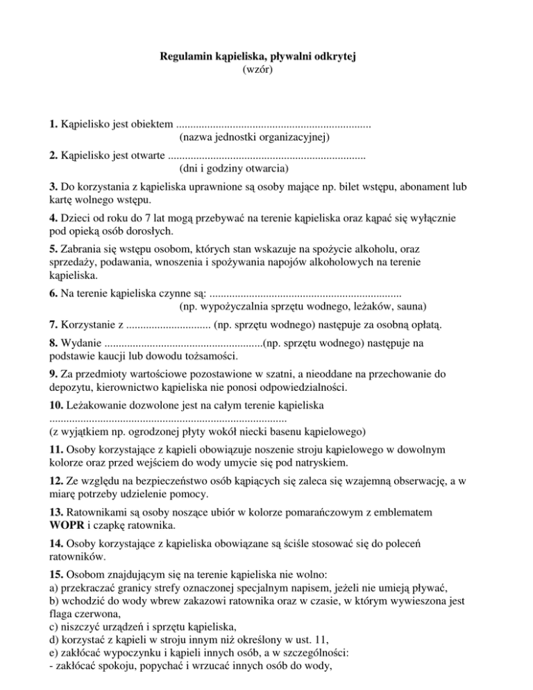 Regulamin kąpieliska, pływalni odkrytej (wzór) 1. Kąpielisko jest obiektem ..................................................................... (nazwa jednostki organizacyjnej) 2. Kąpielisko jest otwarte ...................................................................... (dni i godziny otwarcia) 3. Do korzystania z kąpieliska uprawnione są osoby mające np. bilet wstępu, abonament lub kartę wolnego wstępu. 4. Dzieci od roku do 7 lat mogą przebywać na terenie kąpieliska oraz kąpać się wyłącznie pod opieką osób dorosłych. 5. Zabrania się wstępu osobom, których stan wskazuje na spożycie alkoholu, oraz sprzedaży, podawania, wnoszenia i spożywania napojów alkoholowych na terenie kąpieliska. 6. Na terenie kąpieliska czynne są: .................................................................... (np. wypożyczalnia sprzętu wodnego, leżaków, sauna) 7. Korzystanie z .............................. (np. sprzętu wodnego) następuje za osobną opłatą. 8. Wydanie ........................................................(np. sprzętu wodnego) następuje na podstawie kaucji lub dowodu tożsamości. 9. Za przedmioty wartościowe pozostawione w szatni, a nieoddane na przechowanie do depozytu, kierownictwo kąpieliska nie ponosi odpowiedzialności. 10. Leżakowanie dozwolone jest na całym terenie kąpieliska .................................................................................... (z wyjątkiem np. ogrodzonej płyty wokół niecki basenu kąpielowego) 11. Osoby korzystające z kąpieli obowiązuje noszenie stroju kąpielowego w dowolnym kolorze oraz przed wejściem do wody umycie się pod natryskiem. 12. Ze względu na bezpieczeństwo osób kąpiących się zaleca się wzajemną obserwację, a w miarę potrzeby udzielenie pomocy. 13. Ratownikami są osoby noszące ubiór w kolorze pomarańczowym z emblematem WOPR i czapkę ratownika. 14. Osoby korzystające z kąpieliska obowiązane są ściśle stosować się do poleceń ratowników. 15. Osobom znajdującym się na terenie kąpieliska nie wolno: a) przekraczać granicy strefy oznaczonej specjalnym napisem, jeżeli nie umieją pływać, b) wchodzić do wody wbrew zakazowi ratownika oraz w czasie, w którym wywieszona jest flaga czerwona, c) niszczyć urządzeń i sprzętu kąpieliska, d) korzystać z kąpieli w stroju innym niż określony w ust. 11, e) zakłócać wypoczynku i kąpieli innych osób, a w szczególności: - zakłócać spokoju, popychać i wrzucać innych osób do wody, - wchodzić na wieżę i skakać z niej do wody, - leżakować i biegać po pomostach, - zaśmiecać i brudzić terenu kąpieliska. f) niszczyć znaków żeglugowych odgradzających kąpielisko od szlaku żeglugowego, wód otwartych lub miejsc, w których kąpiel jest zabroniona. 16. Osoby naruszające porządek publiczny lub przepisy niniejszego regulaminu będą usuwane z terenu kąpieliska, niezależnie od ewentualnego skierowania sprawy na drogę postępowania w sprawach o wykroczenia. 17. Osoby niszczące i uszkadzające sprzęt wodny lub urządzenia kąpieliska ponoszą odpowiedzialność materialną za wyrządzone szkody. 18. Parkowanie pojazdów mechanicznych w pobliżu kąpieliska dozwolone jest w miejscu przeznaczonym na ten cel, za osobną opłatą. 19. Skargi i wnioski należy zgłaszać kierownikowi kąpieliska; książka skarg i wniosków znajduje się w kasie kąpieliska. Regulamin kąpieliska zatwierdził. ........................................................ (Kierownik Ośrodka, Pływalni)