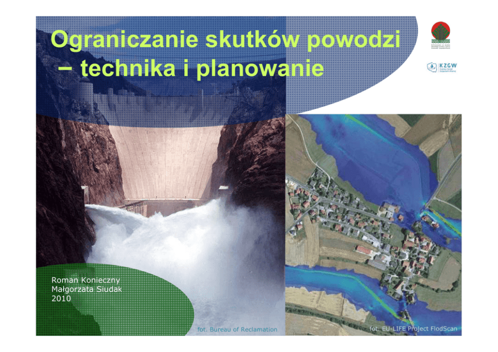Ograniczanie skutków powodzi – technika i planowanie Roman Konieczny Małgorzata Siudak 2010 fot. Bureau of Reclamation fot. EU-LIFE Project FlodScan Strategie ograniczania skutków powodzi Dla ograniczenia skutków powodzi stosuje się trzy strategie. By osiągnąć maksymalny efekt należy brać pod uwagę wszystkie te strategie jednocześnie. Wykład omawia dwie pierwsze. Trzymać powódź daleko od ludzi Trzymać ludzi daleko od powodzi Nauczyć się żyć z powodzią Strategia Trzymać powódź daleko od ludzi fot. www.ikarystyka.pl Zbiorniki retencyjne Gromadzą wodę – kiedy jest jej dużo, oddają – kiedy jest jej mało, produkują energię elektryczną. urządzenia upustowe pojemność powodziowa pojemność użytkowa Zapora Kanał u p pojemność martwa Zbiornik Solina, Polska (fot.. Wikipedia) z czego ponad połowa została zbudowana przed II Wojną Światową. Najstarszy Turbina ustowy rys. English Wikipedia zalety W Polsce mamy 174 zbiorniki wodne, hydroelektrownia • • • zaopatrzenie w wodę rolnictwa, przemysłu, mieszkańców ochrona przed powodzią wykorzystanie do rekreacji zbiornik w Polsce – Jezioro Zygmunta Augusta na Nareśli zbudowano w połowie XVI wieku. Najstarszy działający zbiornik na świecie (Syria) ma ponad 3000 lat. • • • • negatywny wpływ na środowisko niewielki efekt ochrony przed powodzią w stosunku do kosztu konieczność przesiedleń możliwość katastrofy Wały powodziowe Wały służą do ochrony przed zalaniem mieszkających za nimi ludzi, ich dobytku oraz majątku publicznego. W Polsce jest około 8500 km wałów. Rozpowszechniony mit wały powodują podniesienie się poziomu wody w korycie i szybszy spływ fot. English Wikipedia Wały gwarantują bezpieczeństwo ludzi i inwestycji poza wałami. To nieprawda! Wały dają dużą gwarancję bezpieczeństwa przy małych i średnich powodziach, przy dużych dają nam tylko więcej czasu na ewakuację. długość uszkodzonych w czasie powodzi wałów w km tereny zalewowe tereny zalewowe koryto rzeki Suche zbiorniki i poldery naturalna skarpa to obszar doliny rzeki, normalnie chroniony wałami, który w przypadku wysokich stanów może być zalany dla obniżenia kulminacji fali. Do wpuszczenia i później, wypuszczenia wody z polderu stosuje się specjalne urządzenia wałowe. Jednym z największych polderów, jest polder Buków wypływ wody wał wlot wody ukończony w 2002 roku. to zbiornik gromadzący wodę tylko w okresie powodzi. obszar okresowo zalewany naturalna skarpa W innych okresach zbiornik (teren odgrodzony zaporą) nie jest wypełniony wodą. W czasie powodzi zapora początkowo przepuszcza tylko bezpieczną (dla terenów położonych poniżej) ilość wody, a po wypełnieniu zbiornika, tyle samo jej wypływa, ile dopływa. W Polsce jest 12 takich zbiorników i mają one lokalne znaczenie. zapora naturalna skarpa Kanały ulgi W miastach, w których zabudowa zlokalizowana jest blisko rzeki, a zagrożenie przerwania wałów duże, stosuje się często Są to sztucznie przekopane koryta, które powyżej miasta pobierają część wody z rzeki i odprowadzają ją do niej poniżej miasta. Dzięki temu obniża się poziom wody w rzece. W Polsce w ten sposób zwiększona została Kole i Poznaniu oraz Raciborzu, Opolu i Wrocławiu. Kanał ulgi przepustowość koryta rzeki w Śremie, Koninie, Naturalne tereny zalewowe To tereny zalewane przez rzekę podczas wysokich stanów wód. średniowieczny Kraków teren pomiędzy wałami rzeka Odra naturalne tereny zalewowe obwałowania rys. planowanie.um.krakow.pl Na Renie, gdzie w przeszłości odcięto od rzeki prawie 90% terenów zalewowych i skrócono rzekę o kilkadziesiąt kilometrów czas przepływu powodzi zmniejszył się prawie o połowę. W efekcie woda powodziowa z dopływów nakłada się na kulminację na Renie. Na schemacie widać naturalny zasięg powodzi w Krakowie (kolor jasnoniebieski) i wąski obwałowany pas (kolor granatowy), w którym ta sama woda musi się zmieścić dzisiaj. W miastach konieczność budowy wałów jest zrozumiała, ale odcięcie wałami terenów zalewowych od koryta rzeki dotyczy praktycznie całej długości rzek. Na Odrze, od XVIII do XX w. odcięto wałami ponad 70% terenów zalewowych. Zostawmy rzekom więcej miejsca Z inicjatywy WWF Polska rozpoczęto projekt polegający na odsunięciu wałów od rzeki w gminie Wołów nad Odrą. Wały w tym miejscu „chronią” lasy i pastwiska. Po przesunięciu wałów na odcinku 7,5 km uzyska się 670 ha nowych obszarów retencyjnych w dolinie Odry. 670 hektarów wolnej przestrzeni dla rzeki proponowana trasa wałów Odra linia istniejących wałów Retencjonowanie wody na terenach zabudowanych i niezabudowanych Tereny niezabudowane wody opadowe są zatrzymywane Drzewa i rośliny osłabiają impet deszczu i pomagają zmniejszyć erozję gleby Dachy i chodniki odprowadzają wodę Kanalizacja burzowa odprowadza wodę wprost do rzeki Woda gromadzi się w zagłębieniach i przesiąka do gleby Ulice działają jak strumienie i odprowadzają wodę wprost do rzeki Zanieczyszczenia gromadzące się na ulicach i placach dostają się wprost do rzeki ODPŁYW Korzenie wiążą glebę ograniczając erozję gruntu Roślinność buduje organiczną glebę ułatwiającą filtrację rys. www.coastal.ca.gov/nps/watercyclefacts.pdf Tereny zabudowane wody opadowe szybko spływają do rzeki Wpływ zagospodarowania terenu na retencję powierzchniową tylko 10- 20% powierzchni nieprzepuszczalnej naturalne pokrycie terenu 40% parowanie 38% parowanie 20% spływ 10% spływ 25% głęboka filtracja 35-50% powierzchni nieprzepuszczalnej 21% płytka filtracja 21% głęboka filtracja aż 75-100% powierzchni nieprzepuszczalnej 30% parowanie 35% parowanie 55% spływ 30% spływ 20% płytka filtracja 10% płytka filtracja 15% głęboka filtracja 5% głęboka filtracja rys: www.coastal.ca.gov/nps/watercyclefacts.pdf 25% płytka filtracja Skutki zagospodarowania i przeciwdziałania in