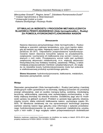 Problemy Inżynierii Rolniczej nr 4/2011 Mieczysław Grzesik1), Regina Janas1), Zdzisława Romanowska-Duda2) Instytut Ogrodnictwa w Skierniewicach 2) Uniwersytet Łódzki w Łodzi Katedra Ekofizjologii i Rozwoju Roślin 1) STYMULACJA WZROSTU I PROCESÓW METABOLICZNYCH ŚLAZOWCA PENSYLWAŃSKIEGO (Sida hermaphrodita L. Rusby) ZA POMOCĄ HYDROKONDYCJONOWANIA NASION 1 Streszczenie Nasiona ślazowca pensylwańskiego (Sida hermaphrodita L. Rusby) kiełkują w szerokim zakresie temperatury, przy czym bardzo słabo, gdy jej wartości są niskie. Najwięcej nasion (30–50%) kiełkuje w temperaturze 20–35°C. Odpowiednio przeprowadzone hydrokondycjonowanie nasion ślazowca korzystnie wpływa na przyśpieszenie, zwiększenie i wyrównanie ich kiełkowania oraz wzrost i rozwój uzyskanych z nich roślin. Przyśpieszony wzrost roślin jest wynikiem zwiększonej aktywności metabolicznej, m.in. większej aktywności fotosyntetycznej oraz fosfatazy kwaśnej, zasadowej i RNazy, a także mniejszej przepuszczalności membran cytoplazmatycznych. Ze względu na niewielkie koszty hydrokondycjonowanie może być polecane w wielkotowarowej produkcji wymienionego gatunku. Słowa kluczowe: hydrokondycjonowanie, kiełkowanie, metabolizm, ślazowiec pensylwański, wzrost Wstęp Ślazowiec pensylwański (Sida hermaphrodita L. Rusby) jest jedną z bardziej atrakcyjnych roślin uprawianych na biomasę, będącą surowcem do produkcji energii odnawialnej. Jest on szybko rosnącą byliną, ozdobną, miododajną, leczniczą, włóknodajną, paszową oraz wytwarzającą porównywalną, a niekiedy większą biomasę niż wierzba wiciowa. Dodatkowy jego atut to możliwość uprawy na glebach suchych. Problem w uprawie tego gatunku stwarza, między innymi, słaba zdolność kiełkowania nasion, wynosząca często 30– 50%. W literaturze światowej nie ma opracowanych technologii poprawy wartości siewnej nasion tego gatunku oraz informacji o wpływie przedsiewnego hydrokondycjonowania na wzrost i aktywność metaboliczną uzyskanych z nich roślin. Z tego względu celem przeprowadzonych doświadczeń Badania naukowe częściowo finansowane ze środków na naukę w latach 2010–2014 jako projekty badawcze N N304 38533 i N N304 102940. 81 Mieczysław Grzesik, Regina Janas, Zdzisława Romanowska-Duda było zbadanie wpływu jednej z metod hydrokondycjonowania na dynamikę i zdolność kiełkowania nasion oraz wzrost roślin i ich aktywność metaboliczną. Materiał i metody badań Badaniom podano komercyjne nasiona ślazowca pensylwańskiego (Sida hermaphrodita L. Rusby) o wilgotności 9,9%. W pierwszej kolejności oceniono ich wartość siewną na podstawie dynamiki i zdolności kiełkowania w zakresie temperatury od 5 do 45oC. Inną partię nasion poddano hydrokondycjonowaniu, polegającemu na nawilgotnieniu ich w wodzie destylowanej do zawartości wody 30, 35, 40 i 45% i następnie inkubacji w 20°C przez 6 dni w hermetycznych pojemnikach, codziennie przewietrzanych. W trakcie inkubacji, co 2 dni, dokonywano pomiaru wilgotności nasion metodą suszarkową, wyrażonej w % świeżej masy [ISTA 2003]. Po zakończeniu inkubacji nasiona suszono w warunkach laboratoryjnych (25°C, 50% wilgotności powietrza) do wilgotności wyjściowej (9,9%) i następnie poddano je ocenie dynamiki i zdolności kiełkowania w temperaturze 20°C, zgodnie z metodyką i zaleceniami ISTA [2003]. W tym celu wysiano 3 x 100 nasion na wilgotną bibułę w szalkach Pertiego i umieszczono w termostatach, w ciemności i w stałej temperaturze 20°C. Codziennie liczono liczbę skiełkowanych sztuk. Za skiełkowane nasiona przyjmowano te, u których korzonek zarodkowy przebił okrywę nasienną i uzyskał długość co najmniej 1 mm [ISTA 2003]. Na podstawie codziennych pomiarów wykreślono krzywe dynamiki kiełkowania, natomiast końcowa liczba skiełkowanych nasion wskazała na zdolność ich kiełkowania. Zdolność tę oznaczono na podstawie procentowej liczby skiełkowanych nasion w stosunku do wysianych. Kontrolę stanowiły nasiona niekondycjonowane, o wilgotności początkowej 9,9%. W celu zbadania wpływu hydrokondycjonowania na wzrost roślin uszlachetnione tą metodą nasiona wysiano pojedynczo do 3-litrowych pojemników wypełnionych uniwersalną ziemią ogrodniczą i umieszczono na kontenerowni. W czasie rozwoju okresowo mierzono wysokość roślin. Gdy siewki osiągnęły 20 cm wysokości, oceniono integralność membran cytoplazmatycznych na podstawie pomiarów wycieku elektrolitów z tkanek liści (elektroprzewodnictwo wód nastoinowych) oraz aktywność metaboliczną, badając intensywność fotosyntezy (fotosynteza netto, przewodność szparkowa, stężenie międzykomórkowego CO2, transpiracja), a także aktywność fosfatazy alkalicznej, fosfatazy kwaśnej i RNazy [Badek i in. 2006; Grzesik i in. 2008]. Wszystkie badania wykonano trzykrotnie, a wyniki podane na rysunkach stanowią średnią z tych trzech serii doświadczeń. Wyniki opracowano statystycznie metodą analizy wariancji. Wartości NIR0,05 podane przy średnich zostały wyznaczone na podstawie liniowego modelu mieszanego z uwzględnieniem pomiarów powtarzanych. 82 a) 45 NIR(LSD)0,05=5,02 35 30 25 20 15 10 5 0 83 1 3 5 7 9 11 13 15 Czas kiełkowania [dni] Time of germination [days] 5°C 10°C 15°C 20°C 30°C 35°C 40°C 45°C 17 19 21 25°C Źródło: wyniki własne. Source: own study. Rys. 1. Dynamika kiełkowania nasion ślazowca pensylwańskiego (Sida hermaphrodita L. Rusby): a) w temperaturze 5–45°C bez kondycjonowania, b) w temperaturze 20°C kondycjonowanych przez nawilgotnienie do 30–45% zawartości wody i następnie inkubowanych przez 6 dni; K – kontrola Fig. 1. Germination dynamics of Virginia mallow (Sida hermaphrodita L.Rusby) seeds: a) at temperature 5–45°C without treatment, b) at temperature 20°C conditioned by moistening up to 30–45% m.c. and next incubated over 6 days; K – control Stymulacja wzrostu i procesów metabolicznych ślazowca... 