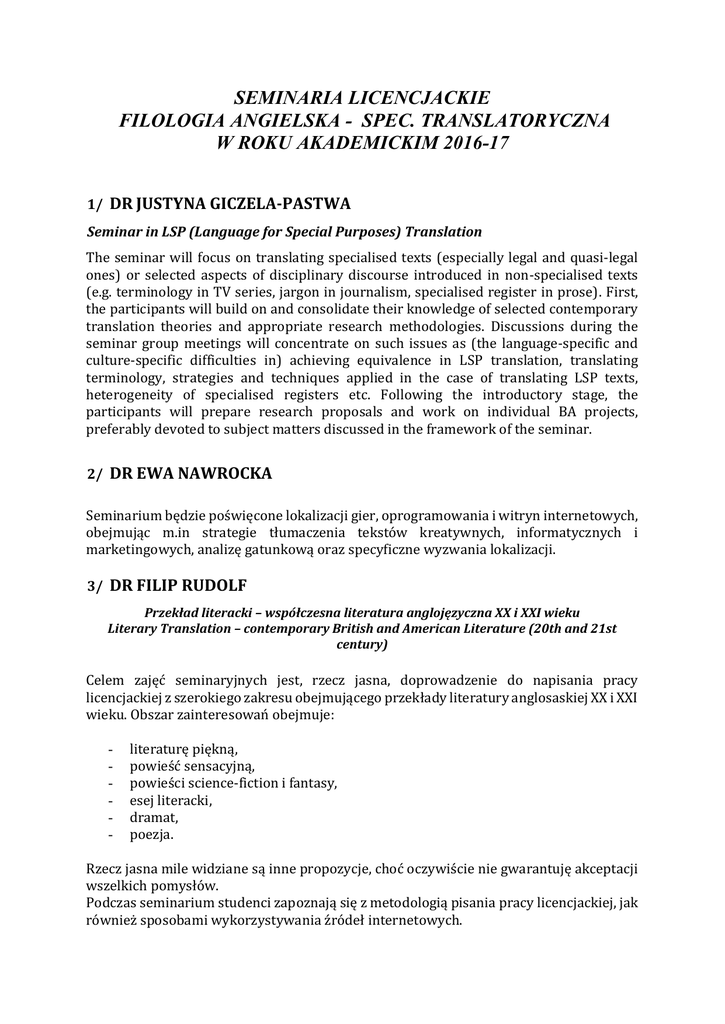 SEMINARIA LICENCJACKIE FILOLOGIA ANGIELSKA - SPEC. TRANSLATORYCZNA W ROKU AKADEMICKIM 2016-17 1/ DR JUSTYNA GICZELA-PASTWA Seminar in LSP (Language for Special Purposes) Translation The seminar will focus on translating specialised texts (especially legal and quasi-legal ones) or selected aspects of disciplinary discourse introduced in non-specialised texts (e.g. terminology in TV series, jargon in journalism, specialised register in prose). First, the participants will build on and consolidate their knowledge of selected contemporary translation theories and appropriate research methodologies. Discussions during the seminar group meetings will concentrate on such issues as (the language-specific and culture-specific difficulties in) achieving equivalence in LSP translation, translating terminology, strategies and techniques applied in the case of translating LSP texts, heterogeneity of specialised registers etc. Following the introductory stage, the participants will prepare research proposals and work on individual BA projects, preferably devoted to subject matters discussed in the framework of the seminar. 2/ DR EWA NAWROCKA Seminarium będzie poświęcone lokalizacji gier, oprogramowania i witryn internetowych, obejmując m.in strategie tłumaczenia tekstów kreatywnych, informatycznych i marketingowych, analizę gatunkową oraz specyficzne wyzwania lokalizacji. 3/ DR FILIP RUDOLF Przekład literacki – współczesna literatura anglojęzyczna XX i XXI wieku Literary Translation – contemporary British and American Literature (20th and 21st century) Celem zajęć seminaryjnych jest, rzecz jasna, doprowadzenie do napisania pracy licencjackiej z szerokiego zakresu obejmującego przekłady literatury anglosaskiej XX i XXI wieku. Obszar zainteresowań obejmuje: - literaturę piękną, powieść sensacyjną, powieści science-fiction i fantasy, esej literacki, dramat, poezja. Rzecz jasna mile widziane są inne propozycje, choć oczywiście nie gwarantuję akceptacji wszelkich pomysłów. Podczas seminarium studenci zapoznają się z metodologią pisania pracy licencjackiej, jak również sposobami wykorzystywania źródeł internetowych. W ramach pisania pracy licencjackiej studenci dokonują wszechstronnej analizy krytycznej istniejącego już przekładu wybranej powieści anglojęzycznej (brytyjskiej, amerykańskiej, kanadyjskiej, australijskiej, itp.). Wymagania dotyczące pracy licencjackiej. Długość: min. 35 stron. Bibliografia: 20 pozycji Styl zapisu: MLA Terminy: wybór tematu i tytułu do 10 listopada 2014 r. Oddanie całości pracy: do 15 kwietnia 2017 roku. LEKTURY: J. Boase-Beier ‘Stylistic Approaches to Translation’ A. Chesterman ‘Memes of Translation’ R. Lewicki ,,Konotacja obcości w przekładzie” R. Lewicki ,,Obcość w odbiorze przekładu” R. Leppihalme ‘Culture Bumps’ T. Parks ‘A Literature Approach to Translation – a Translation Approach to Literature’ K. Lipiński ,,Mity przekładoznawstwa” O. Wojtasiewicz ,,Wstęp do teorii tłumaczenia” T. Hermans ‘The Conference of Tongues’ K. Hejwowski ‘Translation: A Cognitive Communicative Approach‘ K. Hejwowski ,,Iluzja przekładu”