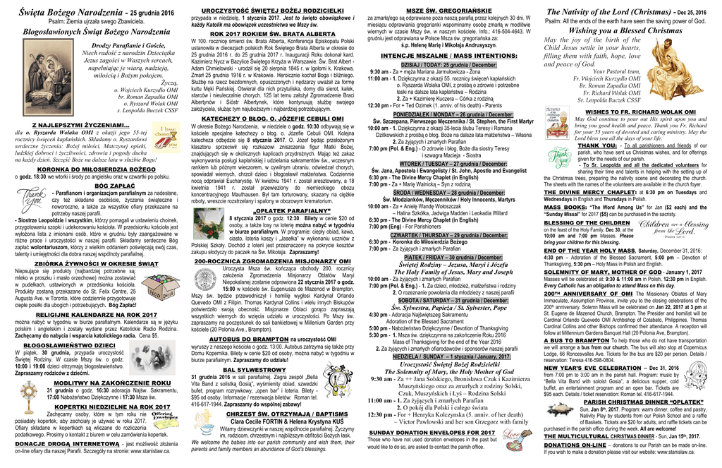 Święta Bożego Narodzenia - 25 grudnia 2016 Psalm: Ziemia ujrzała swego Zbawiciela. Błogosławionych Świąt Bożego Narodzenia Drodzy Parafianie i Goście, Niech radość z narodzin Dzieciątka Jezus zagości w Waszych sercach, napełniając je wiarą, nadzieją, miłością i Bożym pokojem. Życzą, o. Wojciech Kurzydło OMI br. Roman Zapadka OMI o. Ryszard Wolak OMI s. Leopolda Buczek CSSF Z NAJLEPSZYMI ŻYCZENIAMI… dla o. Ryszarda Wolaka OMI z okazji jego 55-tej rocznicy święceń kapłańskich. Składamy o. Ryszardowi serdeczne życzenia: Bożej miłości, Matczynej opieki, ludzkiej dobroci i życzliwości, zdrowia i pogody ducha na każdy dzień. Szczęść Boże na dalsze lata w służbie Bogu! KORONKA DO MIŁOSIERDZIA BOŻEGO o godz. 18:30 we wtorki i środy po angielsku oraz w czwartki po polsku. BÓG ZAPŁAĆ - Parafianom i organizacjom parafialnym za nadesłane, czy też składane osobiście, życzenia świąteczne i noworoczne, a także za wszystkie ofiary przekazane na potrzeby naszej parafii. - Siostrze Leopoldzie i wszystkim, którzy pomagali w ustawieniu choinek, przygotowaniu szopki i udekorowaniu kościoła. W przedsionku kościoła jest wyłożona lista z imionami osób, które w grudniu były zaangażowane w różne prace i uroczystości w naszej parafii. Składamy serdeczne Bóg zapłać wolontariuszom, którzy z wielkim oddaniem poświęcają swój czas, talenty i umiejętności dla dobra naszej wspólnoty parafialnej. ZBIÓRKA ŻYWNOŚCI W OKRESIE ŚWIĄT Niepsujące się produkty (najbardziej potrzebne są: mleko w proszku i masło orzechowe) można zostawiać w pudełkach, ustawionych w przedsionku kościoła. Produkty zostaną przekazane do St. Felix Centre, 25 Augusta Ave. w Toronto, które codziennie przygotowuje ciepłe posiłki dla ubogich i potrzebujących. Bóg Zapłać! RELIGIJNE KALENDARZE NA ROK 2017 można nabyć w tygodniu w biurze parafialnym. Kalendarze są w języku polskim i angielskim i zostały wydane przez Katolickie Radio Rodzina. Zachęcamy do nabycia i wsparcia katolickiego radia. Cena $5. BŁOGOSŁAWIEŃSTWO DZIECI W piątek, 30 grudnia, przypada uroczystość Świętej Rodziny. W czasie Mszy św. o godz. 10:00 i 19:00 dzieci otrzymają błogosławieństwo. Zapraszamy rodziców z dziećmi. MODLITWY NA ZAKOŃCZENIE ROKU 31 grudnia o godz. 16:30 adoracja Najśw. Sakramentu, 17:00 Nabożeństwo Dziękczynne i 17:30 Msza św. KOPERTKI NIEDZIELNE NA ROK 2017 Zachęcamy osoby, które w tym roku nie posiadały kopertek, aby zechciały je używać w roku 2017. Ofiary składane w kopertkach są wliczane do rozliczenia podatkowego. Prosimy o kontakt z biurem w celu zamówienia kopertek. DONACJE DROGĄ INTERNETOWĄ - jest możliwość złożenia on-line ofiary dla naszej Parafii. Szczegóły na stronie: www.stanislaw.ca. UROCZYSTOŚĆ ŚWIĘTEJ BOŻEJ RODZICIELKI przypada w niedzielę, 1 stycznia 2017. Jest to święto obowiązkowe i każdy Katolik ma obowiązek uczestnictwa we Mszy św. ROK 2017 ROKIEM ŚW. BRATA ALBERTA W 100. rocznicę śmierci św. Brata Alberta, Konferencja Episkopatu Polski ustanowiła w diecezjach polskich Rok Świętego Brata Alberta w okresie do 25 grudnia 2016 r. do 25 grudnia 2017 r. Inauguracji Roku dokonał kard. Kazimierz Nycz w Bazylice Świętego Krzyża w Warszawie. Św. Brat Albert Adam Chmielowski - urodził się 20 sierpnia 1845 r. w Igołomi k. Krakowa. Zmarł 25 grudnia 1916 r. w Krakowie. Heroicznie kochał Boga i bliźniego. Służbę na rzecz bezdomnych, opuszczonych i nędzarzy uważał za formę kultu Męki Pańskiej. Otwierał dla nich przytuliska, domy dla sierot, kalek, starców i nieuleczalnie chorych. 125 lat temu założył Zgromadzenie Braci Albertynów i Sióstr Albertynek, które kontynuują służbę swojego założyciela, służąc tym najuboższym i najbardziej potrzebującym. KATECHEZY O BŁOG. O. JÓZEFIE CEBULI OMI W okresie Bożego Narodzenia, w niedziele o godz. 10:30 odbywają się w kościele specjalne katechezy o błog. o. Józefie Cebuli OMI. Kolejna katecheza odbędzie się 8 stycznia 2017. O. Józef będąc przełożonym klasztoru sprzeciwił się rozkazowi zniszczenia figur Matki Bożej, znajdujących się w okolicznych kaplicach przydrożnych. Mając też zakaz wykonywania posługi kapłańskiej i udzielania sakramentów św., wczesnym rankiem lub późnym wieczorem, w cywilnym ubraniu, odwiedzał chorych, spowiadał wiernych, chrzcił dzieci i błogosławił małżeństwa. Codziennie nocą odprawiał Eucharystię. W kwietniu 1941 r. został aresztowany, a 18 kwietnia 1941 r. został przewieziony do niemieckiego obozu koncentracyjnego Mauthausen. Był tam torturowany, skazany na ciężkie roboty, wreszcie rozstrzelany i spalony w obozowym krematorium. „OPŁATEK PARAFIALNY” 8 stycznia 2017 o godz. 12:30. Bilety w cenie $20 od osoby, a także losy na loterię można nabyć w tygodniu w biurze parafialnym. W programie: ciepły obiad, kawa, ciasto, loteria koszy i „Jasełka” w wykonaniu uczniów z Polskiej Szkoły. Dochód z loterii jest przeznaczony na pokrycie kosztów zakupu słodyczy do paczek na Św. Mikołaja. Zapraszamy! 200-ROCZNICA ZGROMADZENIA MISJONARZY OMI Uroczysta Msza św. kończąca obchody 200. rocznicy założenia Zgromadzenia Misjonarzy Oblatów Maryi Niepokalanej zostanie odprawiona 22 stycznia 2017 o godz. 15:00 w kościele św. Eugeniusza de Mazenod w Brampton. Mszy św. będzie przewodniczył i homilię wygłosi Kardynał Orlando Quevedo OMI z Filipin. Thomas Kardynał Collins i wielu innych Biskupów potwierdziło swoją obecność. Misjonarze Oblaci gorąco zapraszają wszystkich wiernych do wzięcia udziału w uroczystości. Po Mszy św. zapraszamy na poczęstunek do sali bankietowej w Millenium Garden przy kościele (20 Polonia Ave., Brampton). AUTOBUS DO BRAMPTON na uroczystość OMI wyruszy z naszego kościoła o godz. 13:00. Autobus zatrzyma się także przy Domu Kopernika. Bilety w cenie $20 od osoby, można nabyć w tygodniu w biurze parafi
