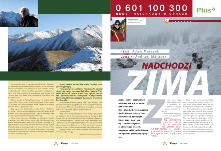 ADAM MARASEK Zastępca naczelnika TOPR, przewodnik tatrzański. T A T R A C H TEKST: Adam Marasek ZDJĘCIA: A n d r z e j M a r a s e k NADCHODZI Nie pozostało mi nic innego jak wezwać kolegów z Zakopanego. Nie miałem wciąż stuprocentowej pewności, że szliśmy śladem pozostawionym przez pana Zbigniewa, ale skoro wciąż nie było go w schronisku... No właśnie, zachodziło uzasadnione podejrzenie, że gdzieś tu, w górach, znajduje się poszukiwany. Moją argumentację uznał naczelnik TOPR Robert Janik i wnet ukazały się w dolinie światła samochodów. Główne siły szły na Wyżnią Chochołowską i do miejsca, w którym zgubiłem ślad, mniejszy zespół przepatrywał Dolinę Jarząbczą, do której poszukiwany mógł się dostać, trawersując Czerwony Wierch w lewo, na granicy lasu i skał. Była piękna noc. Wygwieżdżone niebo. Stałem z Robertem w miejscu, z którego narciarz mógł pójść w lewo, do Jarząbczej lub w prawo, ponad lasem, przecinając stoki i żlebiki Czerwonego Wierchu opadające ku kotłom Wyżniej Chochołowskiej. Mimo nocy ratownicy odnajdują na stromszych stokach, w twardym, przez wiatr ubitym śniegu, nikłe ślady krawędzi nart. Równocześnie Władysław Cywiński informuje przez radiotelefon, że jego grupa zauważyła świeży obryw lawiny, nieco powyżej Wyżniej Chochołowskiej, na stokach pomiędzy Czerwonym Wierchem i Wołowcem. W bocznej części obrywu znikają ślady narciarza – zanotowano później w „Księdze wypraw”. Wydaje się – kontynuował W. Cywiński – że nie ma śladów wyjścia. A więc lawina. W ruch idą sondy. Do akcji przygotowują się psy. Tuż przed północą Maciej Pawlikowski natknął się na martwego narciarza. Zginął na miejscu. W terenie, który tak dobrze znał i który był mu tak bliski. Ledwo wyszedł na stromy stok – ruszyła lawina. Niewielka, ale wystarczająca, by zgnieść kruche ciało człowieka. Nazajutrz rano rozmowa z panią Zofią – żoną zmarłego. Znosi śmierć męża z imponującą godnością. W jakiś czas potem otrzymałem list od pani Zofii i wiem, że podziękowanie podobnej treści nadesłała na ręce naczelnika, Roberta Janika. Oto ten list: Szanowny Panie, Minął właśnie miesiąc od tragicznej śmierci mojego męża, Zbigniewa C. Zginął w Dolinie Chochołowskiej, pod lawiną. Wiem, że to dzięki Pana szybkiej decyzji i Pana osobistemu zaangażowaniu udało się dotrzeć do miejsca wypadku i wydostać spod śniegu ciało mojego męża. Jestem Panu głęboko wdzięczna za zorganizowanie akcji ratowniczej i za okazane zrozumienie. Gdyby nie pomoc Pana, ratowników i przyjaciół, nie wiem, jak potoczyłyby się wydarzenia, jak wyglądałoby moje życie. W imieniu swoim i mojej rodziny chciałabym Panu za wszystko serdecznie podziękować. Na podstawie książki „Wołanie w górach” ZIMA Jeszcze żyjemy wspomnieniami minionego lata, a tu już za progiem czai się zima. Zima – dla jednych radość, wspaniałe zjazdy, ski-toury, kuligi czy zimowe wędrowanie, zaś dla tych, którzy zdają sobie sprawę z zimowych zagrożeń, w głowie kłębić się będą niespokojne myśli o tym jak bezpiecznie wędrować, zjeżdżać czy się wspinać. 6 1(7)/2006 ima. Śnieg, mróz, wiatry, zasypane szlaki, ograniczona widoczność no i przede wszystkim zagrożenie lawinowe. Chciałbym słów parę przekazać o tym poważnym zagrożeniu. Na przestrzeni ostatnich 10-ciu lat w lawinach po polskiej stronie Tatr zginęły 33 osoby, a poważnie rannych zostało 36 turystów, narciarzy i taterników. 7 Może w porównaniu do ilości ludzi, którzy każdego dnia giną na naszych drogach, liczba zabitych przez lawiny nie jest zbyt szokująca, ale problem tkwi w czym innym. Zimą każdego dnia do Morskiego Oka idzie bardzo wielu „turystów”. Zdecydowana większość z nich to ludzie zupełnie nie zdający sobie sprawy z zagrożeń lawinowych. Tylko niewielu z nich stosuje się do zaleceń czy ostrzeżeń w terenie np. idzie od Włosienicy zimowym obejściem, czy nie wchodzi na Morskie Oko tuż pod wylotem Marchwicznego Żlebu. Tylko szczęśliwemu zbiegowi okoliczności należy zawdzięczać to, że spadające tamtędy duże lawiny nie zasypały sporej ilości osób. 1(7)/2006 STOPNIE ZAGROŻENIA L AWINOWEGO ZAGROŻENIE LAWINOWE I MAŁE STABILNOŚĆ POKRYWY ŚNIEGOWEJ NA OGÓŁ BEZPIECZNA Pokrywa śniegowa jest na ogół utrwalona i stabilna PRAWDOPODOBIEŃSTWO SAMOISTNEGO I MECHANICZNEGO WYZWOLENIA LAWINY Możliwe samorzutne zejście lawin małych rozmiarów w postaci tzw. zsuwów, szczególnie przy śniegach mokrych Mechaniczne wyzwolenie lawiny możliwe na ekstremalnie stromych stokach ≥ 40 o, tylko przy bardzo dużym dodatkowym obciążeniu**. Możliwe jest samorzutne schodzenie pojedynczych lawin małych rozmiarów. II UMIARKOWANE SYTUACJA NIEBEZPIECZNA Pokrywa śniegowa jest na ogół umiarkowanie stabilna, ale na stokach bardzo stromych (35-40) o, a zwłaszcza na ekstremalnie stromych ≥ 40 o może być mało stabilna Mechaniczne wyzwolenie lawiny jest możliwe przede wszystkim na bardzo stromych stokach (35-40) o, przy dużym obciążeniu dodatkowym**. Na niektórych ekstremalnie stromych stokach ≥ 40 o o niekorzystnych wystawach*, możliwe jest wyzwolenie lawiny średnich rozmiarów już przy małym dodatkowym obciążeniu np. przez pojedynczego człowieka. Możliwe jest częste, samorzutne schodzenie średnich bądź pojedynczych dużych lawin, czasami osiągających nawet dna dolin. III ZNACZNE IV DUŻE V BARDZO DUŻE SYTUACJA KRYTYCZNA! Warunki w znacznej mierze niekorzystne. Już na wielu stromych stokach (30-35) o pokrywa śniegowa jest utrwalona co najwyżej umiarkowanie, lub słabo SYTUACJA SKRAJNIE KRYTYCZNA! Warunki niekorzystne. Pokrywa śniegowa jest słabo utrwalona już na wszystkich stromych stokach (30-35) o SYTUACJA KATASTROFALNA! Pokrywa śniegowa jest na rozległym obszarze bardzo słabo utrwalona. * UWAGA!!! za szczególnie niebezpieczne