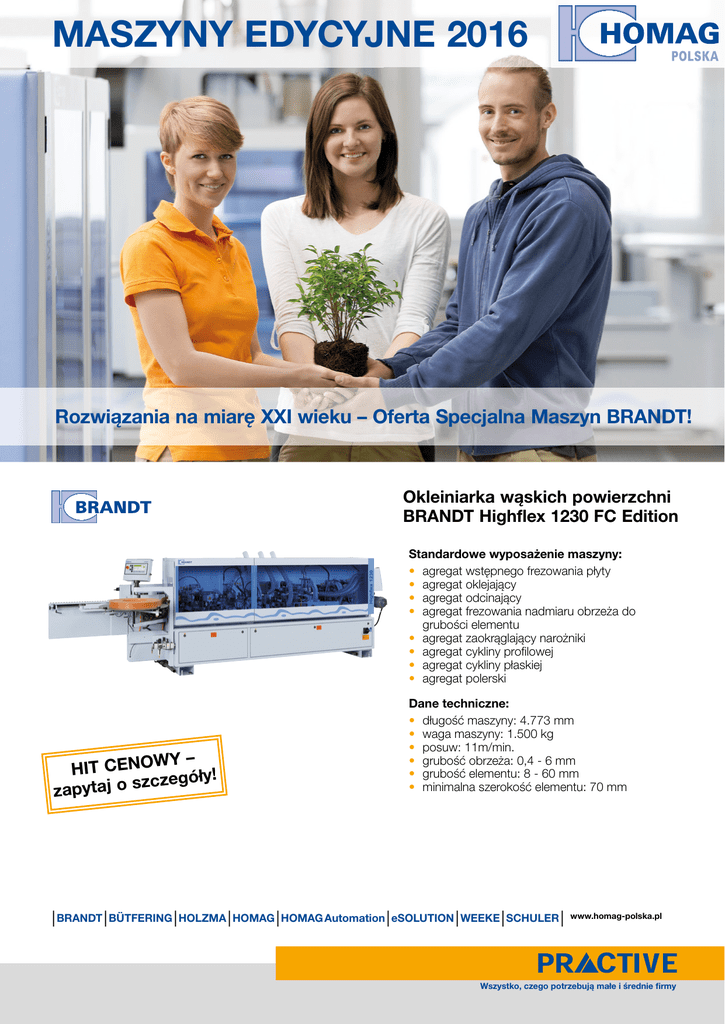 MASZYNY EDYCYJNE 2016 Rozwiązania na miarę XXI wieku – Oferta Specjalna Maszyn BRANDT! Okleiniarka wąskich powierzchni BRANDT Highflex 1230 FC Edition Standardowe wyposażenie maszyny: • agregat wstępnego frezowania płyty • agregat oklejający • agregat odcinający • agregat frezowania nadmiaru obrzeża do grubości elementu • agregat zaokrąglający narożniki • agregat cykliny profilowej • agregat cykliny płaskiej • agregat polerski WY – HIT CENO góły! zcze zapytaj o s Dane techniczne: • długość maszyny: 4.773 mm • waga maszyny: 1.500 kg • posuw: 11m/min. • grubość obrzeża: 0,4 - 6 mm • grubość elementu: 8 - 60 mm • minimalna szerokość elementu: 70 mm | BRANDT | BÜTFERING | HOLZMA | HOMAG | HOMAG Automation | eSOLUTION | WEEKE | SCHULER | www.homag-polska.pl Wszystko, czego potrzebują małe i średnie firmy Zawsze do Państwa dyspozycji! Sprawdź nas! www.homag-polska.pl Okleiniarka wąskich powierzchni BRANDT Ambition 1650 FC Edition Standardowe wyposażenie maszyny: • agregat wstępnego frezowania płyty • agregat oklejający • agregat odcinający • agregat frezowania nadmiaru obrzeża do grubości elementu • agregat zaokrąglający narożniki • agregat cykliny profilowej • agregat cykliny płaskiej • agregat polerski WY – HIT CENO góły! zcze zapytaj o s Dane techniczne: • długość maszyny: 5.760 mm • waga maszyny: 2.700 kg • posuw: 8 – 18 m/min. • grubość obrzeża: 0,4 – 12 mm • grubość elementu: 8 – 60 mm • minimalna szerokość elementu: 70 mm Okleiniarka wąskich powierzchni BRANDT Ambition 1440 FC Edition Standardowe wyposażenie maszyny: • agregat wstępnego frezowania płyty • agregat oklejający • agregat odcinający • agregat frezowania nadmiaru obrzeża do grubości elementu • agregat zaokrąglający narożniki • pakiet automatyki • agregat cykliny profilowej • agregat cykliny płaskiej • agregat polerski WY – HIT CENO góły! zcze zapytaj o s Dane techniczne: • długość maszyny: 5.270 mm • waga maszyny: 1.900 kg • posuw: 14 m/min. • grubość obrzeża: 0,4 – 8 mm • grubość elementu: 8 – 60 mm • minimalna szerokość elementu: 70 mm HOMAG Polska Sp. z o.o. ul. Prądzyńskiego 24 63-000 Środa Wielkopolska tel. +48 61 647 45 00 [email protected] Wszystko, czego potrzebują małe i średnie firmy