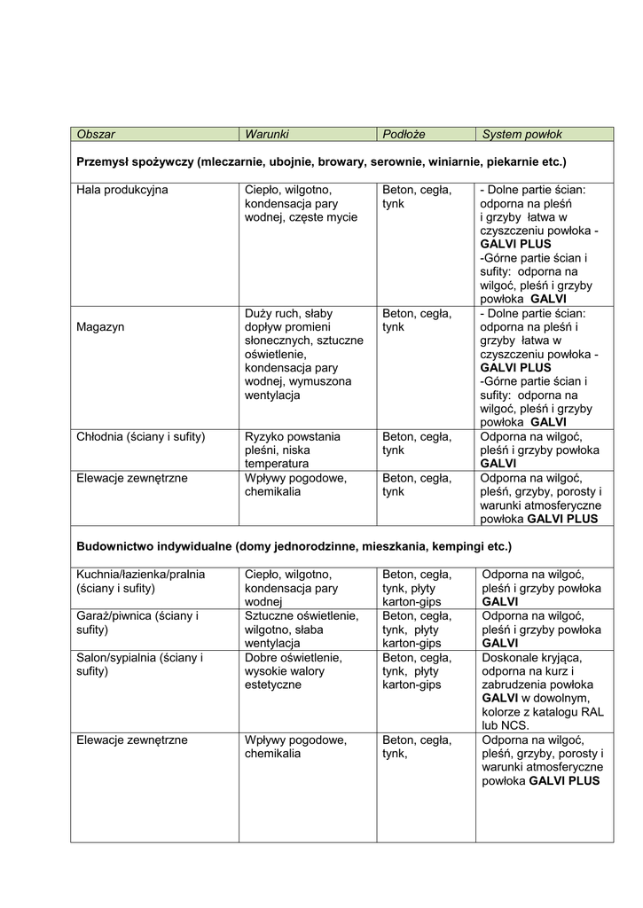 Obszar Warunki Podłoże System powłok Przemysł spożywczy (mleczarnie, ubojnie, browary, serownie, winiarnie, piekarnie etc.) Hala produkcyjna Magazyn Chłodnia (ściany i sufity) Elewacje zewnętrzne Ciepło, wilgotno, kondensacja pary wodnej, częste mycie Beton, cegła, tynk Duży ruch, słaby dopływ promieni słonecznych, sztuczne oświetlenie, kondensacja pary wodnej, wymuszona wentylacja Beton, cegła, tynk Ryzyko powstania pleśni, niska temperatura Wpływy pogodowe, chemikalia Beton, cegła, tynk Beton, cegła, tynk - Dolne partie ścian: odporna na pleśń i grzyby łatwa w czyszczeniu powłoka GALVI PLUS -Górne partie ścian i sufity: odporna na wilgoć, pleśń i grzyby powłoka GALVI - Dolne partie ścian: odporna na pleśń i grzyby łatwa w czyszczeniu powłoka GALVI PLUS -Górne partie ścian i sufity: odporna na wilgoć, pleśń i grzyby powłoka GALVI Odporna na wilgoć, pleśń i grzyby powłoka GALVI Odporna na wilgoć, pleśń, grzyby, porosty i warunki atmosferyczne powłoka GALVI PLUS Budownictwo indywidualne (domy jednorodzinne, mieszkania, kempingi etc.) Kuchnia/łazienka/pralnia (ściany i sufity) Garaż/piwnica (ściany i sufity) Salon/sypialnia (ściany i sufity) Elewacje zewnętrzne Ciepło, wilgotno, kondensacja pary wodnej Sztuczne oświetlenie, wilgotno, słaba wentylacja Dobre oświetlenie, wysokie walory estetyczne Beton, cegła, tynk, płyty karton-gips Beton, cegła, tynk, płyty karton-gips Beton, cegła, tynk, płyty karton-gips Wpływy pogodowe, chemikalia Beton, cegła, tynk, Odporna na wilgoć, pleśń i grzyby powłoka GALVI Odporna na wilgoć, pleśń i grzyby powłoka GALVI Doskonale kryjąca, odporna na kurz i zabrudzenia powłoka GALVI w dowolnym, kolorze z katalogu RAL lub NCS. Odporna na wilgoć, pleśń, grzyby, porosty i warunki atmosferyczne powłoka GALVI PLUS Budynki użyteczności publicznej (szkoły, przedszkola, szpitale, domy opieki, baseny, oczyszczalnie ścieków) Korytarze (ściany i sufity) Duże zanieczyszczenie mikrobiologiczne, Beton, cegła, tynk Kuchnia/łazienka/pralnia (ściany i sufity) Ciepło, wilgotno, kondensacja pary wodnej Duże zanieczyszczenie mikrobiologiczne, kondensacja pary wodnej Wpływy pogodowe, chemikalia Beton, cegła, tynk, płyty karton-gips Beton, cegła, tynk, płyty karton-gips Beton, cegła, tynk Odporna na wilgoć, pleśń, grzyby, porosty i warunki atmosferyczne powłoka GALVI PLUS Wymuszona wentylacja, sztuczne oświetlenie Wymuszona wentylacja, kondensacja pary wodnej, dużo zanieczyszczeń mikrobiologicznych Sztuczne oświetlenie, wymuszona wentylacja, wilgotno Cegła, beton, tynk, płyty karton-gips Cegła, beton, tynk, płyty karton-gips Odporna na wilgoć, pleśń i grzyby powłoka GALVI Odporna na wilgoć, pleśń i grzyby powłoka GALVI Cegła, beton, tynk Odporna na wilgoć, pleśń i grzyby powłoka GALVI Ciepło, wilgotno, zanieczyszczenia mikrobiologiczne, Ciepło, wilgotno, kondensacja pary wodnej Ryzyko powstania pleśni, niska temperatura Wpływy pogodowe, chemikalia Cegła, tynk, beton Odporna na wilgoć, pleśń i grzyby powłoka GALVI Odporna na wilgoć, pleśń i grzyby powłoka GALVI Odporna na wilgoć, pleśń i grzyby powłoka GALVI Odporna na wilgoć, pleśń, grzyby, porosty i warunki atmosferyczne powłoka GALVI PLUS Sale dydaktyczne/biura (ściany i sufity) Elewacje zewnętrzne Odporna na wilgoć, pleśń i grzyby powłoka GALVI Odporna na wilgoć, pleśń i grzyby powłoka GALVI Odporna na wilgoć, pleśń i grzyby powłoka GALVI Biurowce Korytarze Biura typu „open space” Parkingi podziemne Rolnictwo Obory/chlewnie/kurniki/ (ściany i sufity) Kuchnia/łazienka/ (ściany i sufity) Chłodnia (ściany i sufity) Elewacje zewnętrzne Cegła, tynk, beton, płyty karton-gips Cegła, tynk, beton Beton, cegła, tynk Obronność ( koszary, schrony dla ludności cywilnej ,magazyny żywności etc.) Kuchnia/łazienka/pralnia Magazyn Schron Elewacje zewnętrzne Ciepło, wilgotno, kondensacja pary wodnej Ciepło, wilgotno, kondensacja pary wodnej, Sztuczne oświetlenie, wymuszona wentylacja, wilgotno Wpływy pogodowe, chemikalia Beton, cegła, tynk, płyty karton-gips Beton, cegła, tynk, Beton, cegła, tynk Beton, cegła, tynk Odporna na wilgoć, pleśń i grzyby powłoka GALVI Odporna na wilgoć, pleśń i grzyby powłoka GALVI Odporna na wilgoć, pleśń i grzyby powłoka GALVI Odporna na wilgoć, pleśń, grzyby, porosty i warunki powłoka GALVI PLUS