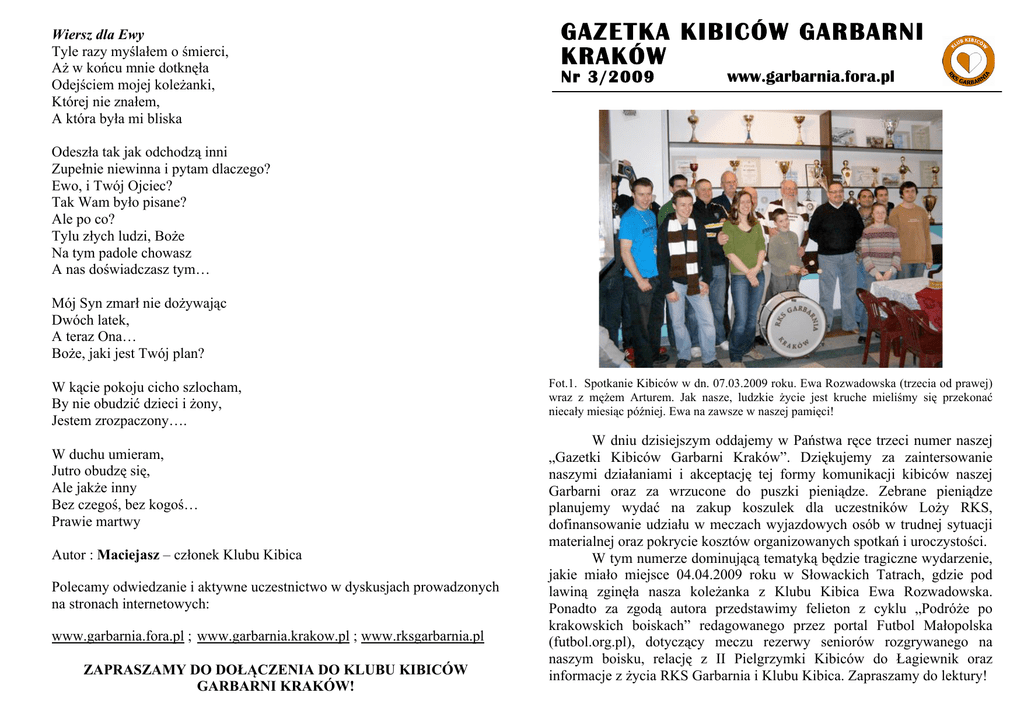 Wiersz dla Ewy Tyle razy my!la"em o !mierci, A# w ko$cu mnie dotkn%"a Odej!ciem mojej kole#anki, Której nie zna"em, A która by"a mi bliska GAZETKA KIBICÓW GARBARNI KRAKÓW Nr 3/2009 www.garbarnia.fora.pl 04.04.2009 Odesz"a tak jak odchodz& inni Zupe"nie niewinna i pytam dlaczego? Ewo, i Twój Ojciec? Tak Wam by"o pisane? Ale po co? Tylu z"ych ludzi, Bo#e Na tym padole chowasz A nas do!wiadczasz tym… Mój Syn zmar" nie do#ywaj&c Dwóch latek, A teraz Ona… Bo#e, jaki jest Twój plan? W k&cie pokoju cicho szlocham, By nie obudzi' dzieci i #ony, Jestem zrozpaczony…. W duchu umieram, Jutro obudz% si%, Ale jak#e inny Bez czego!, bez kogo!… Prawie martwy Autor : Maciejasz – cz"onek Klubu Kibica Polecamy odwiedzanie i aktywne uczestnictwo w dyskusjach prowadzonych na stronach internetowych: www.garbarnia.fora.pl ; www.garbarnia.krakow.pl ; www.rksgarbarnia.pl ZAPRASZAMY DO DO!"CZENIA DO KLUBU KIBICÓW GARBARNI KRAKÓW! Fot.1. Spotkanie Kibiców w dn. 07.03.2009 roku. Ewa Rozwadowska (trzecia od prawej) wraz z m%#em Arturem. Jak nasze, ludzkie #ycie jest kruche mieli!my si% przekona' nieca"y miesi&c pó(niej. Ewa na zawsze w naszej pami%ci! W dniu dzisiejszym oddajemy w Pa$stwa r%ce trzeci numer naszej „Gazetki Kibiców Garbarni Kraków”. Dzi%kujemy za zaintersowanie naszymi dzia"aniami i akceptacj% tej formy komunikacji kibiców naszej Garbarni oraz za wrzucone do puszki pieni&dze. Zebrane pieni&dze planujemy wyda' na zakup koszulek dla uczestników Lo#y RKS, dofinansowanie udzia"u w meczach wyjazdowych osób w trudnej sytuacji materialnej oraz pokrycie kosztów organizowanych spotka$ i uroczysto!ci. W tym numerze dominuj&c& tematyk& b%dzie tragiczne wydarzenie, jakie mia"o miejsce 04.04.2009 roku w S"owackich Tatrach, gdzie pod lawin& zgin%"a nasza kole#anka z Klubu Kibica Ewa Rozwadowska. Ponadto za zgod& autora przedstawimy felieton z cyklu „Podró#e po krakowskich boiskach” redagowanego przez portal Futbol Ma"opolska (futbol.org.pl), dotycz&cy meczu rezerwy seniorów rozgrywanego na naszym boisku, relacj% z II Pielgrzymki Kibiców do )agiewnik oraz informacje z #ycia RKS Garbarnia i Klubu Kibica. Zapraszamy do lektury! Tragiczna #mier$ Ewy Rozwadowskiej i jej Taty Wies%awa w Tatrach S%owackich INFORMACJE Z RKS GARBARNIA KRAKÓW (na podstawie oficjalnego serwisu internetowego: rksgarbarnia.pl): Nasza Kole#anka z Klubu Kibica, Ewa Rozwadowska wybra"a si% w Tatry S"owackie wraz ze swoim Tat& Wies"awem. Byli mi"o!nikami gór, doskonale je znali i nigdy nie podejmowali niepotrzebnego ryzyka o czym za!wiadcza m. innymi przyjaciel Pana Wies"awa w wyemitowanym materiale filmowym w dniu 23.04.2009 roku o godzinie 18.00 w Kronice Krakowskiej po!wi%conym *.P. Ewie i Wies"awie Rozwadowskim (polecam ogladni%cie tego felietonu, który zaczyna si% o 7 minuty 36 sekundy emitowanej Kroniki dost%pny na stronie http://ww6.tvp.pl/6272,20090423901422.strona ). Na 15 minut przed zej!ciem lawiny siedzieli w schronisku posilaj&c si%. Nic nie wskazywa"o na to, #e istnieje na szlaku jakiekolwiek zagro#enie. A jednak ..... Lawina zabra"a dwoje fantastycznych ludzi, o czym zapewniaj& wszyscy, którzy spotkali ich na swojej drodze. W tym dniu m&# Ewy, Artur Rozwadowski dopingowa" z Klubem Kibica nasz& dru#yn% w meczu z Lubrzanka Kajetanów (6-0). Na naszej stronie http://www.garbarnia.fora.pl/sprawy-kibica,1/ mo#na zapozna' si% dok"adniej z towarzysz&cymi nam emocjami zwi&zanymi z t& tragedi&. Ewa mia"a 27 lat. Uko$czy"a 2 kierunku na Akademii Pedagogicznej (matematyk% i fizyk%). By"a !wietn& nauczycielk&, bardzo lubian& przez uczniów, o czym !wiadcz& m.innymi wpisy na jej profilu w „Naszej Klasie”. Jej Tat, Pan Wies"aw równie# by" nauczycielem, I dru#ynowym Bia"ej Fregaty, Cz"onkiem Komendy Hufca Nowa Huta. Ewa by"a równie# cz"onkiem S"u#b Porz&dkowych w Sanktuarium Bo#ego Mi"osierdzia w )agiewnikach. Pogrzeb Ewy i Pana Wies"awa odby" si% w dniu 23.04.2009 roku na cmentarzu w Batowicach. Szersz& notk% biograficzn& Ewy przedstawimy w kolejnych numerach naszej Gazetki. Pozostawili w bólu swoich najbli#szych, w!ód których m&# Artur, siostra Agnieszka s& cz"onkami naszego Klubu Kibica. Mama Ewy, Pani Maria (by"a piel%gniarka) ma powa#ne problemy zdrowotne, których leczenie wymaga du#ych !rodków finansowych, których w obliczu tej tragedii tym bardziej trudno zaspokoi'. Piszemy o tym dlatego, #e by' mo#e kto! z Pa$stwa czytaj&cych t% Gazetk% b%dzie mia" pomys" jak mo#na by cho' w minimalnym stopniu pomóc tej rodzinie i pokaza' w ten sposób nasz& solidarno!'. Ewentualne pomys"y prosz% o przekazywanie na mail [email protected], telefonicznie na numer 888-723-448 (Artur Bochenek) lub do cz"onków Klubu Kibica obecnych na naszym stadionie (Lo#a RKS). 1) W dniu 21.04.2009 roku nast!pi"y zmiany w sk"adzie Zarz!du RKS Garbarnia Kraków. Rezygnacj# z pe"nienia funkcji Cz"onka Zarz!du RKS Garbarnia Kraków z"o$yli Panowie Jerzy Kursa oraz Wies"aw Kowalczyk, którym Prezes Klubu Jerzy Jasiówka w imieniu w"asnym i wszystkich cz"onków Zarz!du podzi#kowa" za dotychczasow! prac# dla Klubu oraz gotowo%& do rezygnacji z w"asnych ambicji dla dobra Klubu jak! wykazali obaj ustepuj!cy Cz"onkowie Zarz!du. W ich miejsce do Zarz!du powo"ani zostali na podstawie jednog"o%nej Uchwa"y nr 2009/04/15/1 Panowie Marek Siedlarz i Ryszard S"apak. 2) Z okazji 225-tej rocznicy powstania Miasta Podgórze oraz 'wi#ta Narodowego Konstytucji 3 Maja, RKS Garbarnia Kraków zorganizowa!a turniej dla trampkarzy m"odszych oraz mecz oldbojów Garbarni z teamem dziennikarzy. Impreza odby"a si# 2 maja 2009 r. (sobota) na obiektach RKS Garbarnia Kraków przy ul. Rydlówka 23. W turnieju trampkarzy m"odszych rocznik 1996-97 udzia" wzi#"y dru$yny z dzielnicy Podgórze - Armatura Kraków, Borek Kraków, Orze! Sidzina oraz gospodarze Garbarnia Kraków. Turniej wygra"a dru$yna Garbarni. Najlepszym pi"karzem turnieju wybrano Maksymiliana Dzi#giela (Borek), a najlepszym bramkarzem: Kamila Sale (Armatura), Królem strzelców zosta" Micha! S