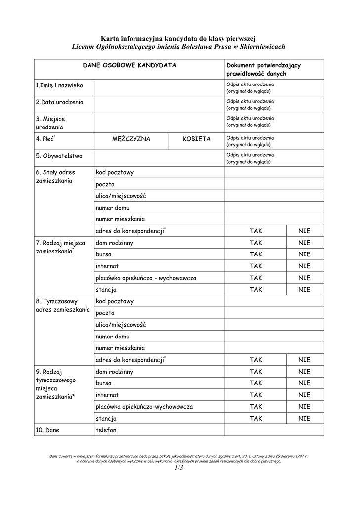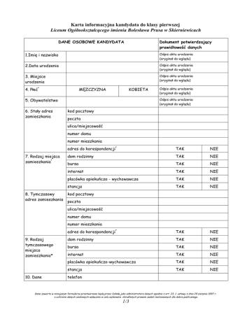 Karta informacyjna kandydata do klasy pierwszej Liceum Ogólnokształcącego imienia Bolesława Prusa w Skierniewicach DANE OSOBOWE KANDYDATA Dokument potwierdzający prawidłowość danych 1.Imię i nazwisko Odpis aktu urodzenia (oryginał do wglądu) 2.Data urodzenia Odpis aktu urodzenia (oryginał do wglądu) 3. Miejsce urodzenia Odpis aktu urodzenia (oryginał do wglądu) 4. Płeć* MĘŻCZYZNA KOBIETA 5. Obywatelstwo 6. Stały adres zamieszkania Odpis aktu urodzenia (oryginał do wglądu) Odpis aktu urodzenia (oryginał do wglądu) kod pocztowy poczta ulica/miejscowość numer domu numer mieszkania 7. Rodzaj miejsca zamieszkania* 8. Tymczasowy adres zamieszkania adres do korespondencji* TAK NIE dom rodzinny TAK NIE bursa TAK NIE internat TAK NIE placówka opiekuńczo - wychowawcza TAK NIE stancja TAK NIE adres do korespondencji* TAK NIE dom rodzinny TAK NIE bursa TAK NIE internat TAK NIE placówka opiekuńczo-wychowawcza TAK NIE stancja TAK NIE kod pocztowy poczta ulica/miejscowość numer domu numer mieszkania 9. Rodzaj tymczasowego miejsca zamieszkania* 10. Dane telefon Dane zawarte w niniejszym formularzu przetwarzane będą przez Szkołę jako administratora danych zgodnie z art. 23. 1. ustawy z dnia 29 sierpnia 1997 r. o ochronie danych osobowych wyłącznie w celu wykonania określonych prawem zadań realizowanych dla dobra publicznego. 1/3 Karta informacyjna kandydata do klasy pierwszej Liceum Ogólnokształcącego imienia Bolesława Prusa w Skierniewicach kontaktowe kandydata telefon komórkowy e-mail 11. Dane kontaktowe telefon opiekunów telefon komórkowy e-mail 12. Ojciec nazwisko imię 13. Matka status opiekuna prawnego * TAK NIE żyje* TAK NIE status opiekuna prawnego * TAK NIE żyje * TAK NIE nazwisko imię 14. Rodzeństwo nazwisko imię data urodzenia 15.Rodzina zastępcza* 16. Orzeczenie / opinia poradni specjalistycznej TAK NIE orzeczenie/opinia/ nie dotyczy* Kserokopia orzeczenia/opinii (oryginał do wglądu) data wydania data ważności przedmiot orzeczenia / opinii Prawdziwość danych zawartych Wiersze 1 – 5 w zaznaczonych wierszach niniejszego formularza potwierdzam własnoręcznym podpisem, Wiersz 16 …............................................................ Podpis członka Szkolnej Komisji Kwalifikacyjno -Rekrutacyjnej …............................................................ Podpis członka Szkolnej Komisji Kwalifikacyjno -Rekrutacyjnej Wiersze 6 – 15 …........................................................... Podpis opiekuna prawnego kandydata Dane zawarte w niniejszym formularzu przetwarzane będą przez Szkołę jako administratora danych zgodnie z art. 23. 1. ustawy z dnia 29 sierpnia 1997 r. o ochronie danych osobowych wyłącznie w celu wykonania określonych prawem zadań realizowanych dla dobra publicznego. 2/3 Karta informacyjna kandydata do klasy pierwszej Liceum Ogólnokształcącego imienia Bolesława Prusa w Skierniewicach PREFERENCJE EDUKACYJNE KANDYDATA * 17. Pierwszy język obcy (kontynuowany) angielski niemiecki rosyjski francuski 18.a) Drugi język obcy* angielski niemiecki rosyjski francuski b) Wnioskuję o przyjęcie do grupy kontynuacyjnej* 19. Wybieram formę zajęć fakultatywnych z wychowania fizycznego* TAK NIE piłka koszykowa; piłka siatkowa; turystyka i rekreacja zajęcia taneczne zajęcia fitness piłka nożna 20. Deklaruję wolę uczęszczania na zajęcia z wychowania do życia w rodzinie* TAK 21. Deklaruję wolę uczęszczania na lekcje * NIE religii etyki Wolę realizacji preferencji zaznaczonych w wierszach 17 – 21 niniejszego formularza potwierdzam własnoręcznym podpisem, * ….................................................. podpis kandydata ….................................................. podpis opiekuna prawnego kandydata Właściwe zaznaczyć Dane zawarte w niniejszym formularzu przetwarzane będą przez Szkołę jako administratora danych zgodnie z art. 23. 1. ustawy z dnia 29 sierpnia 1997 r. o ochronie danych osobowych wyłącznie w celu wykonania określonych prawem zadań realizowanych dla dobra publicznego. 3/3