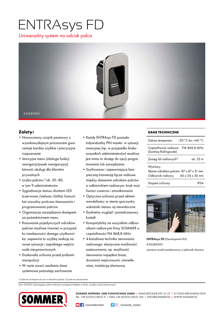 ENTRAsys FD Uniwersalny system na odcisk palca # 5058V000 Zalety: DANE TECHNICZNE •N owoczesny czujnik pasmowy z wysokowydajnym procesorem gwarantuje bardzo szybkie i precyzyjne rozpoznanie • Intuicyjne menu (obsługa funkcji nawigacji/pasek nawigacyjny): łatwość obsługi dla klientów prywatnych • Liczba palców:1) ok. 50–80, w tym 9 administratorów •S ygnalizacja statusu diodami LED (czerwona /zielona /żółta): komunikat wizualny podczas skanowania i programowania palców •O rganizacja zarządzania dostępem za pośrednictwem menu •K asowanie pojedynczych odcisków palców możliwe również w przypadku nieobecności danego użytkownika; zapewnia to szybką reakcję na nowe sytuacje i zapobiega wejściu osób nieuprawnionych •D oskonała ochrona przed próbami manipulacji •W razie awarii zasilania dane systemowe pozostają zachowane • Każdy ENTRAsys FD posiada indywidualny PIN master: w sytuacji awaryjnej (np. w przypadku braku wszystkich administratorów) możliwy jest mimo to dostęp do opcji programowania lub zarządzania •S zyfrowane i zapewniające bezpieczną transmisję łącze radiowe między skanerem odcisków palców a odbiornikiem radiowym; brak moż liwości zwarcia i zmostkowania •O ptyczna ochrona przed aktami wandalizmu: w stanie spoczynku wskaźniki statusu są niewidoczne •D yskretny wygląd i ponadczasowy kształt •K ompatybilny ze wszystkimi odbiornikami radiowymi firmy SOMMER o częstotliwości FM 868,8 MHz •4 -kanałowa technika sterowania radiowego: elastyczne możliwości zastosowania, np. możliwość sterowania napędem bram, drzwiami wejściowymi, oświetleniem, instalacją alarmową Zakres temperatur −20 °C bis +60 °C Częstotliwość radiowa FM 868,8 MHz (Somloq Rollingcode) Zasięg fal radiowych2) ok. 25 m Wymiary Skaner odcisków palców 87 x 47 x 31 mm Odbiornik radiowy 60 x 34 x 36 mm Stopień ochrony IP54 ENTRAsys FD (Development Kit) # 5058V000 zawiera moduł podstawowy z jednostkąskanera 1) zależnie od stopnia złożoności odcisków palców. 2) zależnie od otoczenia. Stan: 03/2015. Zastrzegamy sobie możliwość wystąpienia błędów w druku, omyłek i zmian technicznych. SOMMER ANTRIEBS- UND FUNKTECHNIK GMBH | HANS-BÖCKLER-STR. 21–27 | D-73230 KIRCHHEIM/TECK TEL. +49 (0)70 21/80 01-0 | FAKS +49 (0)70 21/80 01-100 | [email protected] | WWW.SOMMER.EU SOMMERGMBH SOMMER_GMBH