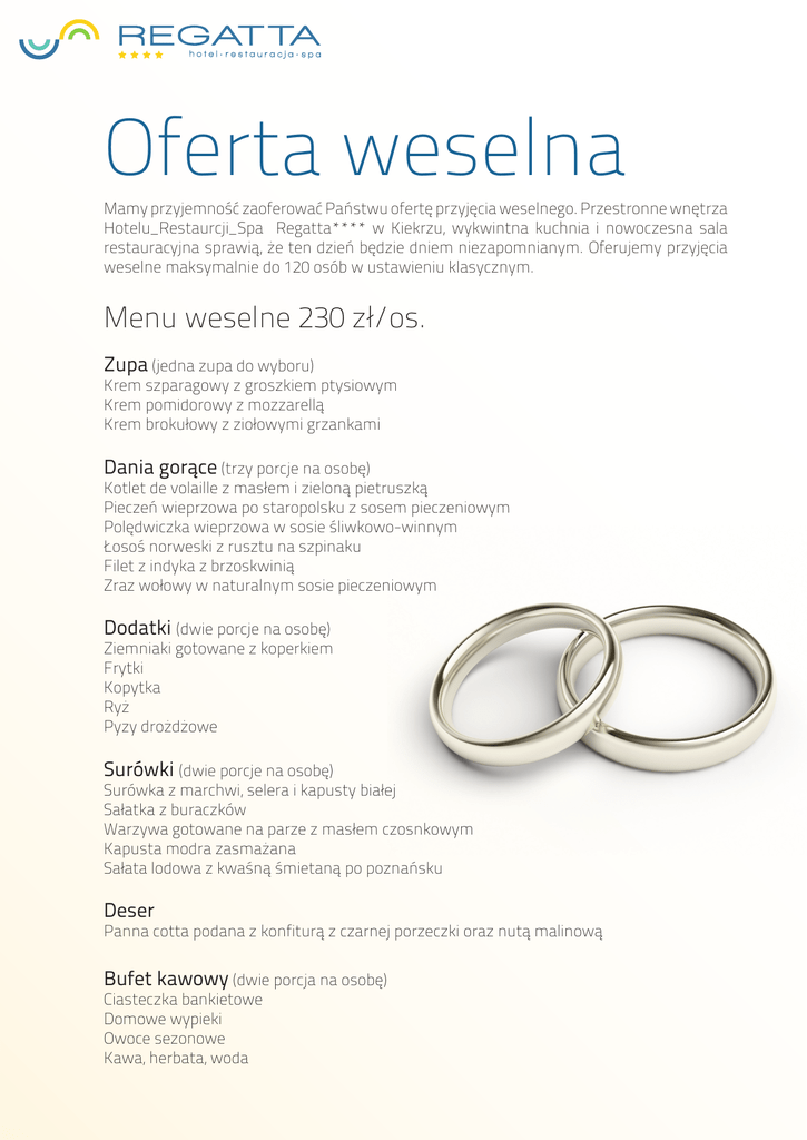 Oferta weselna Mamy przyjemność zaoferować Państwu ofertę przyjęcia weselnego. Przestronne wnętrza Hotelu_Restaurcji_Spa Regatta**** w Kiekrzu, wykwintna kuchnia i nowoczesna sala restauracyjna sprawią, że ten dzień będzie dniem niezapomnianym. Oferujemy przyjęcia weselne maksymalnie do 120 osób w ustawieniu klasycznym. Menu weselne 230 zł/os. Zupa (jedna zupa do wyboru) Krem szparagowy z groszkiem ptysiowym Krem pomidorowy z mozzarellą Krem brokułowy z ziołowymi grzankami Dania gorące (trzy porcje na osobę) Kotlet de volaille z masłem i zieloną pietruszką Pieczeń wieprzowa po staropolsku z sosem pieczeniowym Polędwiczka wieprzowa w sosie śliwkowo-winnym Łosoś norweski z rusztu na szpinaku Filet z indyka z brzoskwinią Zraz wołowy w naturalnym sosie pieczeniowym Dodatki (dwie porcje na osobę) Ziemniaki gotowane z koperkiem Frytki Kopytka Ryż Pyzy drożdżowe Surówki (dwie porcje na osobę) Surówka z marchwi, selera i kapusty białej Sałatka z buraczków Warzywa gotowane na parze z masłem czosnkowym Kapusta modra zasmażana Sałata lodowa z kwaśną śmietaną po poznańsku Deser Panna cotta podana z konfiturą z czarnej porzeczki oraz nutą malinową Bufet kawowy (dwie porcja na osobę) Ciasteczka bankietowe Domowe wypieki Owoce sezonowe Kawa, herbata, woda Zakąski zimne (trzy porcje na osobę) Schab pieczony nadziewany suszonymi śliwkami Galantyna z kurczaka z orzechami Terine z indyka z orzechami Szparagi zawijane w szynkę konserwową Tatar wołowy z jajkiem Łosoś w galarecie Tatar z łososia Śledź w oliwie z cebulą Tymbaliki z wędzonego pstrąga Pieczywo, masło Sałatki (jedna porcja na osobę) Caprese Młody szpinak z serem pleśniowym, śliwką i boczkiem Grecka Sosy zimne (tatarski, czosnkowy, cumberland) Kolacja (jedna porcja na osobę) Zupa gulaszowa Szynka wieprzowa pieczona w całości glazurowana Kapusta kiszona zasmażana okraszona wędzonka Strogonow drobiowy z kluskami kładzionymi Sos żurawinowy, musztarda, chrzan, pieczywo Cena obejmuje również: Powitanie Pary Młodej chlebem i solą Brak opłaty korkowej za wódkę i wino Białe obrusy i serwetki, świeczniki Apartament dla Nowożeńców ze śniadaniem Bezpłatny parking hotelowy Zakwaterowanie podczas Wesela: Do dyspozycji Państwa oddajemy 23 komfortowo urządzone pokoje w specjalnej cenie: Pokój jednoosobowy 200 zł + śniadanie 35 zł/os. Pokój dwuosobowy 230 zł + śniadanie 35 zł/os. W cenie doby hotelowej bezpłatny dostęp do strefy Wellness & Spa: basen z przeciwprądem, sauna fińska i turecka, jacuzzi, salka fitness. Atrakcje dodatkowe: Fontanna czekolady z owocami: 700 zł Pokaz fajerwerków: 1000 zł Stół wiejski : 20 zł/os. Dekoracja kwiatowa stołów: 10 zł/os. Kontakt: Joanna Gulczyńska / joanna.gulczyń[email protected]/ tel.: 501 221 215 Hotel_Restauracja_Spa Regatta**** / ul. Chojnicka 49 ; 60 -480 Poznań-Kiekrz telefon: + 48 61 848 83 08 / mob. + 48 502 78 78 10 / fax: + 48 61 840 32 10 email: [email protected] / www.regattahotel.pl