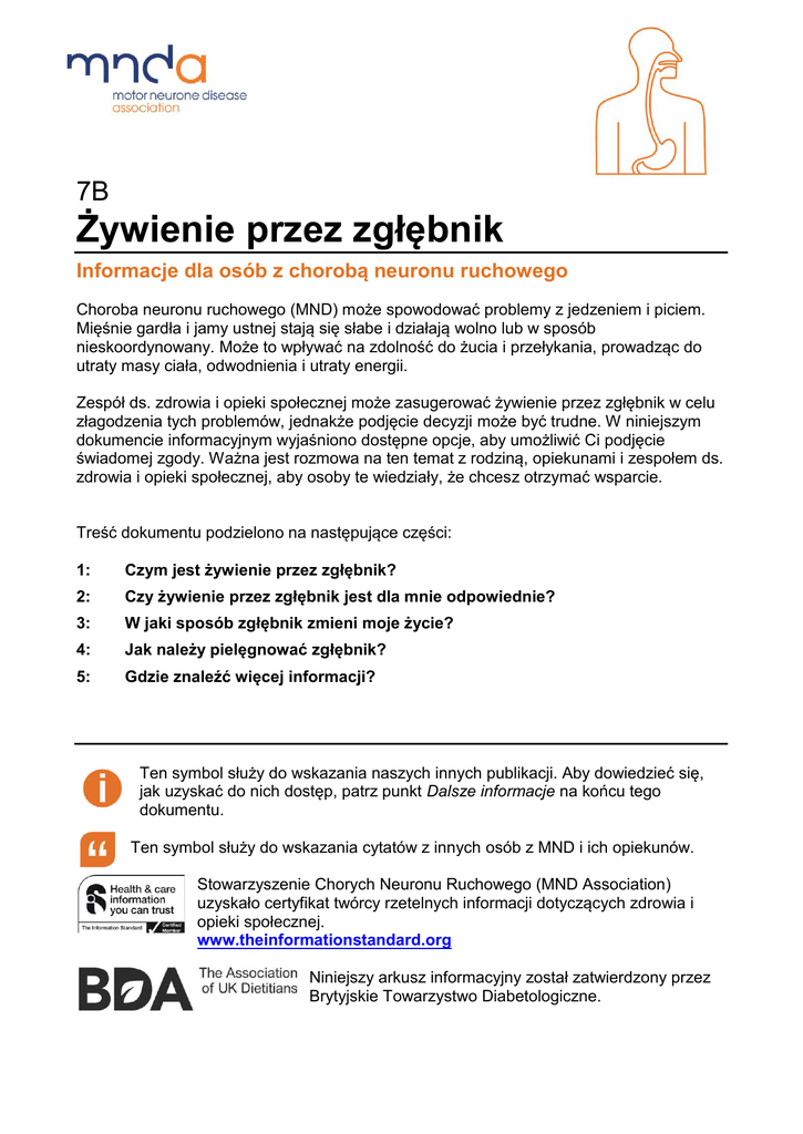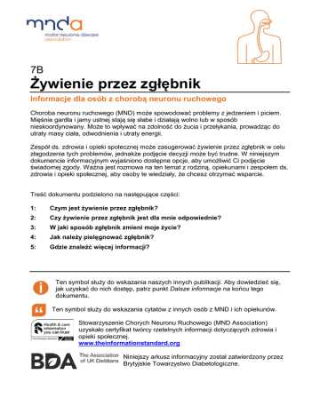 7B 7B Żywienie przez zgłębnik Informacje dla osób z chorobą neuronu ruchowego Choroba neuronu ruchowego (MND) może spowodować problemy z jedzeniem i piciem. Mięśnie gardła i jamy ustnej stają się słabe i działają wolno lub w sposób nieskoordynowany. Może to wpływać na zdolność do żucia i przełykania, prowadząc do utraty masy ciała, odwodnienia i utraty energii. Zespół ds. zdrowia i opieki społecznej może zasugerować żywienie przez zgłębnik w celu złagodzenia tych problemów, jednakże podjęcie decyzji może być trudne. W niniejszym dokumencie informacyjnym wyjaśniono dostępne opcje, aby umożliwić Ci podjęcie świadomej zgody. Ważna jest rozmowa na ten temat z rodziną, opiekunami i zespołem ds. zdrowia i opieki społecznej, aby osoby te wiedziały, że chcesz otrzymać wsparcie. Treść dokumentu podzielono na następujące części: 1: Czym jest żywienie przez zgłębnik? 2: Czy żywienie przez zgłębnik jest dla mnie odpowiednie? 3: W jaki sposób zgłębnik zmieni moje życie? 4: Jak należy pielęgnować zgłębnik? 5: Gdzie znaleźć więcej informacji? Ten symbol służy do wskazania naszych innych publikacji. Aby dowiedzieć się, jak uzyskać do nich dostęp, patrz punkt Dalsze informacje na końcu tego dokumentu. Ten symbol służy do wskazania cytatów z innych osób z MND i ich opiekunów. Stowarzyszenie Chorych Neuronu Ruchowego (MND Association) uzyskało certyfikat twórcy rzetelnych informacji dotyczących zdrowia i opieki społecznej. www.theinformationstandard.org Niniejszy arkusz informacyjny został zatwierdzony przez Brytyjskie Towarzystwo Diabetologiczne. Prosimy pamiętać, że jest to tłumaczenie informacji źródłowych. Stowarzyszenie MND korzysta z uznanych agencji tłumaczeniowych, niemniej jednak nie może ponosić odpowiedzialności za błędy w przekładzie. Przy podejmowaniu decyzji w sprawie leczenia i opieki należy zawsze zwrócić się o poradę do zespołu ds. zdrowia i opieki społecznej. Jego członkowie mogą pomóc w umówieniu obecności tłumacza, który zapewni pomoc na wizytach. Istnieje możliwość tłumaczenia dalszych informacji, jednakże jest to usługa ograniczona. Szczegółowe informacje można uzyskać w naszej infolinii „MND Connect”: Numer telefonu: 0808 802 6262 E-mail: [email protected] 1: Czym jest żywienie przez zgłębnik? Żywienie przez zgłębnik to metoda podawania płynów i specjalnie przygotowanego płynnego pokarmu bezpośrednio do żołądka przez rurkę umieszczoną w brzuchu. Rurka ta jest elastyczna i może zostać dyskretnie schowana pod ubraniem. Ma ona wielkość małej, cienkiej słomki. Różne marki i rodzaje zgłębników mogą wyglądać nieco inaczej, ale ich konstrukcja jest podobna. Zdjęcie poniżej przedstawia przykładowy zgłębnik po założeniu: Po założeniu zgłębnika można nadal jeść i pić przez usta, o ile uznasz to za bezpieczne i zezwolił na to zespół ds. zdrowia i opieki społecznej. Na początku zgłębnik będzie najpierw wykorzystywany do uzupełnienia pokarmów i płynów przyjmowanych drogą doustną. W miarę nasilania się objawów możesz częściej korzystać ze zgłębnika. W razie potrzeby wszystkie niezbędne składniki odżywcze i płyny możesz przyjmować przez zgłębnik. W tym celu dietetyk może omówić rodzaj i ilość specjalnie przygotowanej płynnej odżywki i płynów. Patrz punkt 4: Jak należy pielęgnować zgłębnik? aby uzyskać dalsze informacje na temat życia ze zgłębnikiem. Jeśli chcesz porozmawiać o żywieniu przez zgłębnik, poproś lekarza rodzinnego o skierowanie do dietetyka, wyspecjalizowanej pielęgniarki lub lekarza specjalizującego się w żywieniu przez zgłębnik. W jaki sposób zamocowana jest rurka? Do zamocowania rurki niezbędne jest przeprowadzenie zabiegu chirurgicznego. Jest to gastrostomia. Istnieją 3 rodzaje gastrostomii: PEG (przezskórna gastrostomia endoskopowa) RIG (gastrostomia pod kontrolą radiologiczną) PIG (przezustna gastrostomia sterowana obrazem) Główna różnica pomiędzy poszczególnymi rodzajami zgłębników polega na sposobie zamocowania i utrzymywania rurki na miejscu. Pielęgniarka ds. żywienia, dietetyk lub lekarz wyjaśnią to zagadnienie. Najlepiej jest wcześnie zastanowić się nad dostępnymi opcjami, aby możliwe było podjęcie świadomej decyzji. Opieka pooperacyjna w przypadku RIG może potrwać dłużej i wiązać się z większym dyskomfortem. Jednakże jeśli MND wpłynęła niekorzystnie na oddychanie, lekarz może zaproponować Ci RIG zamiast PEG. Dostępne opcje będą zależeć od miejsca zamieszkania, ponieważ regionalne wytyczne mogą różnić się pod względem dostępnych rodzajów zgłębników oraz sytuacji, w których stosowane są poszczególne rodzaje rurek. Znaczna utrata masy ciała przed założeniem zgłębnika może zwiększyć ryzyko w trakcie operacji i później. Najlepiej jest rozważyć dostępne opcje zanim dojdzie do znacznej utraty masy ciała. Jeśli MND wpłynęła niekorzystnie na oddychanie, lekarz może zaproponować Ci RIG zamiast PEG. Może to zostać uznane za najlepszą opcję w tej sytuacji, jednakże opieka pooperacyjna po RIG może trwać dłużej i wiązać się z większym dyskomfortem. Wytyczne dotyczące sytuacji, w których należy stosować poszczególne rodzaje rurek mogą różnić się w zależności od miejsca zamieszkania chorego. Może to mieć wpływ na rodzaj rurki, jaki zostanie Ci zaoferowany. W celu przeprowadzenia operacji zostaniesz przyjęty/a do szpitala. Zwykle niezbędny jest krótki pobyt w szpitalu po zabiegu, ale jego długość zależy od potrzeb chorego. Cały zabieg trwa zwykle krócej niż pół godziny i wykonywany jest w lekkim znieczuleniu. Będziesz czuł się zrelaksowany/a, ale będziesz świadomy/a tego, co się dzieje. Później możesz spać przez godzinę lub dwie, a następnie obudzisz się, pamiętając niewiele z tego, co się wydarzyło. Czasem może zosta
