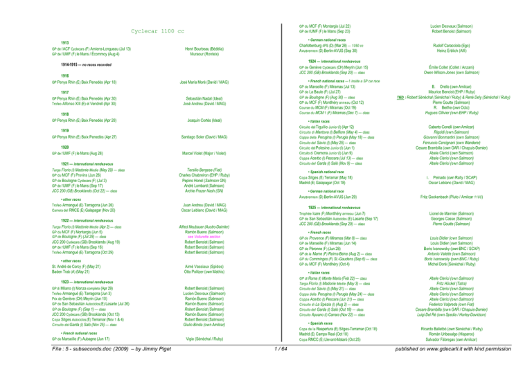 GP du MCF (F ) Montargis (Jul 22) GP de l’UMF (F ) le Mans (Sep 23) Cyclecar 1100 cc 1913 GP de l’ACF Cyclecars (F ) Amiens-Longueau (Jul 13) GP de l’UMF (F ) le Mans / Écommoy (Aug 4) • German national races Charlottenburg 4PS (D) (Mar 28) — 1050 cc Avusrennen (D) Berlin-AVUS (Sep 30) Henri Bourbeau (Bédélia) Muraour (Ronteix) GP de Genève Cyclecars (CH) Meyrin (Jun 15) JCC 200 (GB) Brooklands (Sep 20) — class 1916 GP Penya Rhin (E) Baix Penedès (Apr 18) José María Moré (David / MAG) 1917 GP Penya Rhin (E) Baix Penedès (Apr 30) Trofeo Alfonso XIII (E) el Vendrell (Apr 30) Sebastián Nadal (Ideal) José Andreu (David / MAG) • French national races —1 inside a SP car race GP de Marseille (F ) Miramas (Jul 13) GP de La Baule (F ) (Jul 27) GP de Boulogne (F ) (Aug 30) — class GP du MCF (F ) Montlhéry anneau (Oct 12) Course du MCM (F ) Miramas (Oct 19) Course du MCM 1 (F ) Miramas (Dec 7) — class 1918 1919 GP Penya Rhin (E) Baix Penedès (Apr 27) Joaquín Cortés (Ideal) • Italian races Circuito del Tigullio Junior (I) (Apr 12) Circuito di Mantova (I) Belfiore (May 4) — class Coppa della Perugina (I) Perugia (May 18) — class Circuito del Savio (I) (May 25) — class Circuito del Polesine Junior (I) (Jun 1) Circuito di Cremona Junior (I) (Jun 9) Coppa Acerbo (I) Pescara (Jul 13) — class Circuito del Garda (I) Salò (Nov 9) — class Santiago Soler (David / MAG) 1920 GP de l’UMF (F ) le Mans (Aug 28) Marcel Violet (Major / Violet) 1921 — international rendez-vous Targa Florio (I) Madonie Medie (May 29) — class GP du MCF (F ) Provins (Jun 26) GP de Boulogne Cyclecars (F ) (Jul 3) GP de l’UMF (F ) le Mans (Sep 17) JCC 200 (GB) Brooklands (Oct 22) — class • other races Trofeo Armangué (E) Tarragona (Jun 26) Carrera del RMCE (E) Galapagar (Nov 20) 1922 — international rendez-vous Targa Florio (I) Madonie Medie (Apr 2) — class GP du MCF (F ) Montargis (Jun 5) GP de Boulogne (F ) (Jul 29) — class JCC 200 Cyclecars (GB) Brooklands (Aug 19) GP de l’UMF (F ) le Mans (Sep 16) Trofeo Armangué (E) Tarragona (Oct 29) Tersilio Bergese (Fiat) Charles Chabreiron (EHP / Ruby) Pepino Honel (Salmson GN) André Lombard (Salmson) Archie Frazer Nash (GN) • Spanish national race Copa Sitges (E) Terramar (May 18) Madrid (E) Galapagar (Oct 18) 1923 — international rendez-vous GP di Milano (I) Monza completo (Apr 29) Trofeo Armangué (E) Tarragona (Jun 3) Prix de Genève (CH) Meyrin (Jun 10) GP de San Sebastián Autociclos (E) Lasarte (Jul 26) GP de Boulogne (F ) (Sep 1) — class JCC 200 Cyclecars (GB) Brooklands (Oct 13) Copa Sitges Autociclos (E) Terramar (Nov 1 & 4) Circuito del Garda (I) Salò (Nov 25) — class • French national races GP de Marseille (F ) Aubagne (Jun 17) File : 5 - subseconds.doc (2009) – by Jimmy Piget Émile Collet (Collet / Anzani) Owen Wilson-Jones (own Salmson) B. Orello (own Amilcar) Maurice Benoist (EHP / Ruby) TIED : Robert Sénéchal (Sénéchal / Ruby) & René Dely (Sénéchal / Ruby) Pierre Goutte (Salmson) R. Berthe (own Octo) Hugues Ollivier (own EHP / Ruby) Caberto Conelli (own Amilcar) Rigoldi (own Salmson) Giovanni Bonmartini (own Salmson) Ferruccio Cercignani (own Wanderer) Cesare Brambilla (own GAR / Chapuis-Dornier) Abele Clerici (own Salmson) Abele Clerici (own Salmson) Abele Clerici (own Salmson) I. Peinado (own Rally / SCAP) Oscar Leblanc (David / MAG) • German national race Avusrennen (D) Berlin-AVUS (Jun 29) Juan Andreu (David / MAG) Oscar Leblanc (David / MAG) Fritz Gockenbach (Pluto / Amilcar 1100 ) 1925 — international rendez-vous Alfred Neubauer (Austro-Daimler) Ramón Bueno (Salmson) see Voiturette section Robert Benoist (Salmson) Robert Benoist (Salmson) Robert Benoist (Salmson) • other races St. André de Corcy (F ) (May 21) Baden Trab (A) (May 21) Rudolf Caracciola (Ego) Heinz Erblich (Alfi) 1924 — international rendez-vous 1914-1915 — no races recorded GP Penya Rhin (E) Baix Penedès (Apr 28) Lucien Desvaux (Salmson) Robert Benoist (Salmson) Aimé Vassiaux (Spidos) Otto Politzer (own Mathis) Trophée Icare (F ) Montlhéry anneau (Jun 7) GP de San Sebastián Autociclos (E) Lasarte (Sep 17) JCC 200 (GB) Brooklands (Sep 29) — class Lionel de Marmier (Salmson) Georges Casse (Salmson) Pierre Goutte (Salmson) • French races GP de Provence (F ) Miramas (Mar 8) — class GP de Marseille (F ) Miramas (Jun 14) GP de Péronne (F ) (Jun 28) GP de la Marne (F ) Reims-Beine (Aug 2) — class GP du Comminges (F ) St.-Gaudens (Sep 6) — class GP du MCF (F ) Montlhéry (Oct 4) Louis Didier (own Salmson) Louis Didier (own Salmson) Boris Ivanowsky (own BNC / SCAP) Antonio Valette (own Salmson) Boris Ivanowsky (own BNC / Ruby) Michel Doré (Sénéchal / Ruby) • Italian races GP di Roma (I) Monte Mario (Feb 22) — class Targa Florio (I) Madonie Medie (May 3) — class Circuito del Savio (I) (May 21) — class Coppa della Perugina (I) Perugia (May 24) — class Coppa Acerbo (I) Pescara (Jun 21) — class Circuito di La Spèzia (I) (Aug 2) — class Circuito del Garda (I) Salò (Oct 18) — class Circuito Apuano (I) Carrara (Nov 22) — class Robert Benoist (Salmson) Lucien Desvaux (Salmson) Ramón Bueno (Salmson) Ramón Bueno (Salmson) Robert Benoist (Salmson) Ramón Bueno (Salmson) Robert Benoist (Salmson) Giulio Binda (own Amilcar) • Spanish races Copa de la Reapertura (E) Sitges-Terramar (Oct 18) Madrid (E) Campo Real (Oct 18) Copa RMCC (E) Llevant-Mataró (Oct 25) Vigie (Sénéchal / Ruby) 1 / 64 Abele Clerici (own Salmson) Fritz Hückel (Tatra) Abele Clerici (own Salmson) Abele Clerici (own Salmson) Abele Clerici (own Salmson) Federico Valpreda (own Fiat) Cesare Brambilla (own GAR / Chapuis-Dornier) Luigi Del Rè (own Spedia / Harley-Davidson) Ricardo Balletbó (own Sénéchal / Ruby) Román Uribesalgo (Hisparco) Salvador Fàbregas (own Amilcar) published on www.gdecarli.it with kind permission Montlhéry (F ) (Apr 17) GP de Troyes (F ) Torvilliers (May 8) 6 Heures de Bourgogne (F ) Dijon (May