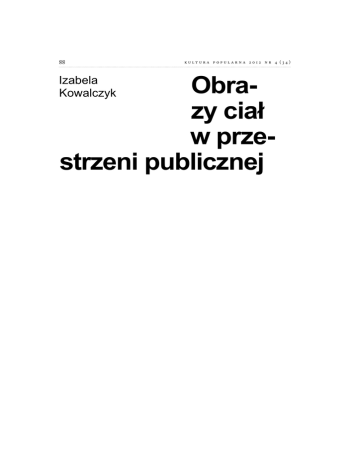 88 kultura popularna 2012 nr 4 (34) !"#$ %&'()#*' +',"%-$ ./"%-0)',1!2)(%0-3 Izabela !"#$%&'( I z a b e l a K owa l c z y k Obrazy ciał w przestrzeni publicznej Zastanawiając się nad relacją między tabuizowaną cielesnością a przestrzenią publiczną, trzeba przede wszystkim wskazać na nad-reprezentację ciał w tej przestrzeni, ich nad-obecność. Mamy więc do czynienia z multiplikowaniem się obrazów ukazujących ciała atrakcyjne, ponętne, niekiedy wręcz seksualne, rozebrane, a nawet nagie. Jesteśmy społeczeństwem nasyconym obrazami, pochłaniającym, jak powiada John Fiske, nieskończenie większą ilość obrazów niż ludzie społeczeństwa przedindustrialnego. „Różnica ilościowa jest tak wielka, że przekształca się w jakościową; przy rosnącej dawce obrazów zmieniają się proporcje między rodzajami doznań. Istotnie, żyjemy w epoce postmodernizmu, w której doznania wzrokowe wysuwają się na plan pierwszy i zacierają wszystko inne” (Fiske, 1997: 169). Tym bardziej więc należy zapytać o status tych obrazów, zastanowić się nad tym, jakie mogą być ciała, aby się pojawić w przestrzeni publicznej, jakie są wymogi dotyczące reprezentacji, a jakie ciała zostają skazane na niewidzialność lub pojawiają się w sferze widzialności jedynie sporadycznie, i wreszcie, jakie aspekty ciała są tabuizowane. Należy też podkreślić liczbę mnogą, w której powinno mówić się o cielesności. Zygmunt Bauman (1995) opisując ponowoczesność, wskazał, że jest to epoka, w której pojawia się wiele obrazów świata, a to, co w epoce nowoczesnej występowało w liczbie pojedynczej, teraz musi być opisywane w liczbie mnogiej. Nie istnieje już jeden obraz ciała, lecz mamy do czynienia z różnorodnymi typami ciał. Ciało funkcjonuje jako tekst, w który wpisywane są coraz to nowe formy wiedzy i nowe znaczenia. Ale właśnie dlatego ciało staje się istotne w rozważaniach na temat podmiotowości i jej definiowania. Reprezentacje cielesności wskazują na to, jakie formy podmiotowości mogą być widzialne i reprezentowane, a jakie znikają z pola widzialności. Pytanie o ciała w przestrzeni publicznej jest więc zarazem pytaniem o określanie współczesnego podmiotu, o jego granice, o to, czy dzisiejszy podmiot jest zamknięty czy mamy do czynienia z podmiotem otwartym (albo pękniętym, jak chcą to widzieć współcześni teoretycy). Podmiot powraca w rozważaniach kulturowych – w kulturowej polityce różnych podmiotowości, seksualności i tożsamości etnicznych – czasem jest to podmiot fundamentalistyczny, częściej jednak – hybrydyczny czy traumatyczny (Foster, 2010: 241). Jak pisze Monika Bakke, współcześnie podmiot nie zniknął, ale zmienił swój charakter: „teraz nie jest już zwielokrotnionym podmiotem, o jakim pisali postmoderniści, a raczej podmiotem otwartym, absorbującym, wrażliwym na swoje otoczenie, którego jest integralną częścią” (Bakke, 2010: 86). A jednak obrazy, które pojawiają się w przestrzeni publicznej, przeczą takiemu ujmowaniu podmiotu. Obrazy ukazujące absorbujący, otwarty na świat podmiot spotykają się raczej z zakazami, z różnymi formami cenzury czy też napiętnowania. Przedstawię ten problem analizując wybrane obrazy prezentowane lub przeznaczone do prezentacji w przestrzeni publicznej – reklamy komercyjne i reklamy społeczne, jak również prace artystyczne, które pojawiają się w miejscach zarezerwowanych dla reklamy, a więc przede wszystkim na billboardach. Wskażę też na zakazy, z którymi część tych obrazów się spotkała. Odniosę się głównie do przykładów polskich, starając się przy okazji zarysować specyfikę modelu społecznego dominującego w naszym kraju; wychodzę z założenia, że ujawnia się on między innymi właśnie poprzez sferę reprezentacji. 89 4%#!-2#'56+#2(%&7)*) +,)-#./0)1,#%234) ")5'67&43)8&(!$4) 9#2():2;#<=7>'%&<'%-)=)?&=4<<=(#,7>"#) ")@!&<#<=2/)AB"<=46) (,'>'%&(#)7&>2(=)!,#&)(2,#>!,(#)"'7>#"/)C2>!,(#) (7=D64()!)1!$7(=43)7&>2%4) (,'>'%&<430)"71BE#2>!,(#) &.=!,B")!)F4;=<=&;=4) =)(2$>2,&4)1!12$#,<43/) 90 kultura popularna 2012 nr 4 (34) 8)970-'()#*6 W reklamach, którymi nasycona jest przestrzeń publiczna, z reguły pojawiają się ciała piękne i młode. Najczęściej w reklamie pojawia się ciało kobiece lub jego fragmenty. Przykładem tego być reklama gładzi murarskich, która jakiś czas temu pojawiła się na polskich ulicach. Na tej reklamie przedstawione było leżące bokiem nagie kobiece ciało, opatrzono napisem: „gładź, gładź, gładź!!!”, co sugerowało, że to ciało jest miłe do głaskania, gładzenia, pieszczenia. Możliwe, że chodziło też o inną sugestię, a mianowicie, że kładzenie tych akurat gładzi murarskich jest tak przyjemne jak pieszczenie kobiecego ciała. Wspomnieć można także o innych reklamach ukazujących kobiece ciało i zawierających w sobie seksualne podteksty. Jedna z reklam Media Marktu ukazywała rozstawione kobiece nogi i strzałkę skierowaną w kobiece krocze, a towarzyszył temu napis: „30 min do tego, co lubisz”. Reklama jednego z banków przedstawiała z kolei dziewczynę w typie lolity leżącą wśród pluszowych zajączków, a slogan, który towarzyszył temu obrazowi, głosił: „Na co tylko chcesz”. Z kolei reklama firmy blacharsko-dekarskiej ukazywała dziewczynę, która obiecywała: „Zrobię dobrze”. Ten sam slogan wykorzystała jedna z agencji reklamowych zachwalając swoje usługi. Przedstawiono tu twarz dziewczyny z ustami złożonymi jakby do pocałunku, a towarzyszył temu napis: „Zrobię ci dobrze… Reklamę”. Jeszcze inna reklama, tym razem sklepu internetowego, ukazywała dwie identyczne dziewczyny w seksownej bieliźnie i napis: „Druga sztuka gratis”. Takie przykłady można by jeszcze mnożyć. Wizerunki kobiet pojawiają się w reklamach dowolnych produktów – od proszków do prania po oleje silnikowe. Same zaś kobiety u