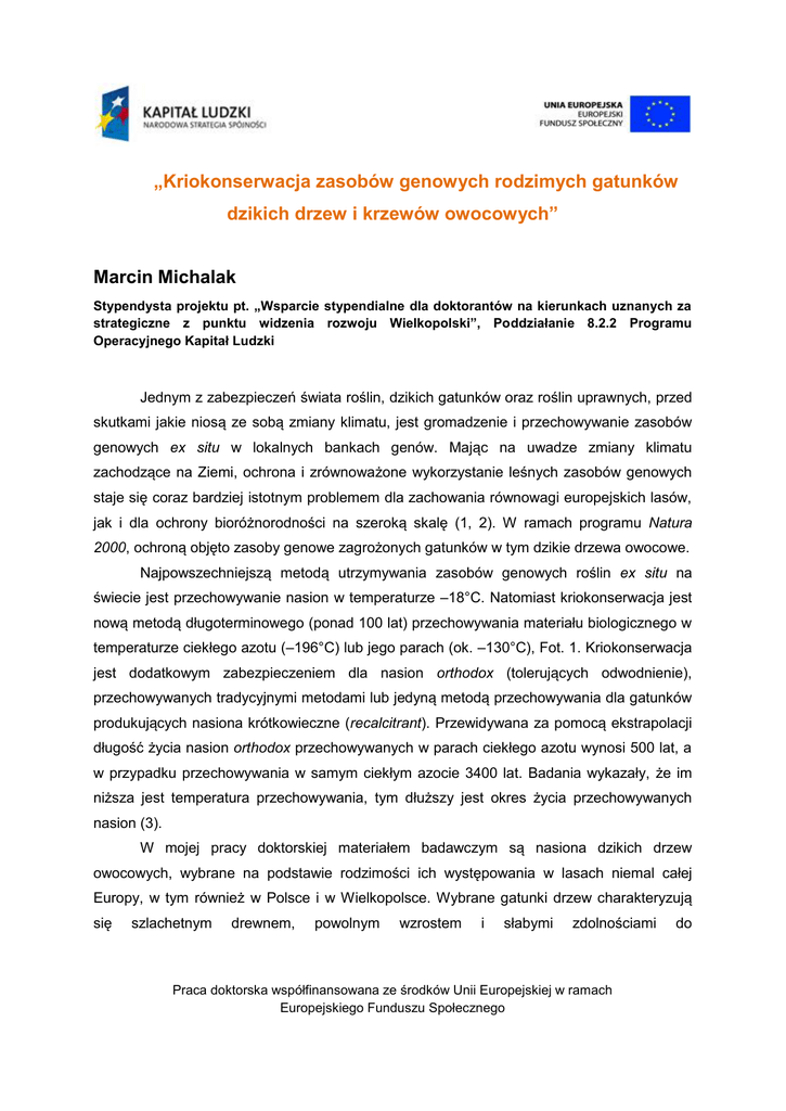 „Kriokonserwacja zasobów genowych rodzimych gatunków dzikich drzew i krzewów owocowych” Marcin Michalak Stypendysta projektu pt. „Wsparcie stypendialne dla doktorantów na kierunkach uznanych za strategiczne z punktu widzenia rozwoju Wielkopolski”, Poddziałanie 8.2.2 Programu Operacyjnego Kapitał Ludzki Jednym z zabezpieczeń świata roślin, dzikich gatunków oraz roślin uprawnych, przed skutkami jakie niosą ze sobą zmiany klimatu, jest gromadzenie i przechowywanie zasobów genowych ex situ w lokalnych bankach genów. Mając na uwadze zmiany klimatu zachodzące na Ziemi, ochrona i zrównoważone wykorzystanie leśnych zasobów genowych staje się coraz bardziej istotnym problemem dla zachowania równowagi europejskich lasów, jak i dla ochrony bioróżnorodności na szeroką skalę (1, 2). W ramach programu Natura 2000, ochroną objęto zasoby genowe zagrożonych gatunków w tym dzikie drzewa owocowe. Najpowszechniejszą metodą utrzymywania zasobów genowych roślin ex situ na świecie jest przechowywanie nasion w temperaturze –18°C. Natomiast kriokonserwacja jest nową metodą długoterminowego (ponad 100 lat) przechowywania materiału biologicznego w temperaturze ciekłego azotu (–196°C) lub jego parach (ok. –130°C), Fot. 1. Kriokonserwacja jest dodatkowym zabezpieczeniem dla nasion orthodox (tolerujących odwodnienie), przechowywanych tradycyjnymi metodami lub jedyną metodą przechowywania dla gatunków produkujących nasiona krótkowieczne (recalcitrant). Przewidywana za pomocą ekstrapolacji długość życia nasion orthodox przechowywanych w parach ciekłego azotu wynosi 500 lat, a w przypadku przechowywania w samym ciekłym azocie 3400 lat. Badania wykazały, że im niższa jest temperatura przechowywania, tym dłuższy jest okres życia przechowywanych nasion (3). W mojej pracy doktorskiej materiałem badawczym są nasiona dzikich drzew owocowych, wybrane na podstawie rodzimości ich występowania w lasach niemal całej Europy, w tym również w Polsce i w Wielkopolsce. Wybrane gatunki drzew charakteryzują się szlachetnym drewnem, powolnym wzrostem i słabymi zdolnościami Praca doktorska współfinansowana ze środków Unii Europejskiej w ramach Europejskiego Funduszu Społecznego do współzawodniczenia z innymi gatunkami. Posiadają wartościowy materiał genetyczny, jako przodkowie uprawianych obecnie odmian drzew i krzewów owocowych. Ich owoce i nasiona są pokarmem dla zwierzyny leśnej. Celem pracy doktorskiej jest określenie wrażliwości nasion czereśni ptasiej (Prunus avium L.), gruszy pospolitej (Pyrus communis L.) jabłoni dzikiej (Malus sylvestris (L.), oraz leszczyny pospolitej (Corylus avellana L.), Fot. 2, na silne odwodnienie w powiązaniu z temperaturą ciekłego azotu, w aspekcie zachowania ich zasobów genowych ex situ. W przypadku leszczyny pospolitej kriokonserwacji poddano izolowane z nasion osie zarodkowe, które po rozmrożeniu hodowane są w kulturach in vitro, Fot. 3. Przechowywanie materiału genetycznego ex situ oparte jest na założeniu, że materiał ten jest przechowywany w warunkach zapewniających stabilność genetyczną. W niniejszej pracy zostanie podjęta po raz pierwszy w skali światowej próba określenia zmiany w poziome 5 metylocytozyny (m5C) w DNA nasion Pyrus commuinis i Corylus avellana poddanych procedurze kriokonserwacji w odniesieniu do nasion nie przechowywanych. Nasiona o znanej wilgotności, przechowywane są w bankach genów w kontrolowanej temperaturze. Wykazano, że czynniki te (wilgotność nasion i temperatura) mają podstawowy wpływ na przebieg procesów epigenetycznych w tym na metylację genomowego DNA. U organizmów eukariotycznych metylacja cytozyny związana jest z dużą liczbą kluczowych procesów, jak chociażby regulacją cyklu komórkowego, transpozonów embriogenezą, i regulacją piętnowaniem genów. genomowym, Utrzymanie prawidłowego a także wzoru wyłączaniem metylacji jest zabezpieczeniem dla prawidłowej regulacji transkrypcji i ekspresji materiału genetycznego organizmu (4, 5, 6). Dlatego niezwykle istotne jest określenie czy podczas zamrażania nasion w ciekłym azocie nie następują zmiany w jej wzorze. W pracy doktorskiej wykorzystuję metody określające potencjalne zmiany w nasionach czy siewkach po kriogenicznym przechowywaniu na poziomie fizjologicznym i molekularnym. Wykluczenie niekorzystnych zmian w przechowywanych nasionach, zapewniłoby otrzymanie z nich siewek o wysokiej wartości hodowlanej w szkółkach leśnych. Wyniki otrzymanych badań będą podstawą do wnioskowania o stabilności epigenetycznej tkanek roślin drzewiastych przechowywanych w bankach genów z wykorzystaniem technik kriokonserwacji. Niniejsze badania mogą przyczynić się w przyszłości do zoptymalizowania metod kriokonserwacji zasobów genowych w postaci nasion, co doskonale wpisuję się w strategię Wielkopolski i Poznania jako miasta „Know-How” i społeczeństwa opartego na wiedzy. Praca doktorska współfinansowana ze środków Unii Europejskiej w ramach Europejskiego Funduszu Społecznego Rezultaty badań, które zebrane będą w formie pracy doktorskiej wpisują się w strategię europejskiego programu EUFORGEN, którego celem działania jest m.in. opracowanie bezpiecznych metod długoterminowego przechowania nasion dzikich drzew i krzewów owocowych. Ponadto tematyka badań zgodna jest ze strategią działania Lasów Państwowych, dzięki czemu wyniki niniejszych badań będą mogły mieć zastosowanie zarówno dla dzikich drzew owocowych województwa wielkopolskiego jak również w skali całego kraju, a w przyszłości również i Unii Europejskiej. b a a Fot. 1. Nasiona umieszcza się w specjalnych plastykowych pojemnikach, zamkniętych w metalowej kolumnie (a), zamrożenie próbek w zbiorniku z ciekłym azotem (–196°C) (b). Fot. M. Michalak a b c d Fot. 2. Nasiona gruszy pospolitej (a), jabłoni dzikiej (b) i czereśni ptasiej w okrywach owocowych (c) umieszc