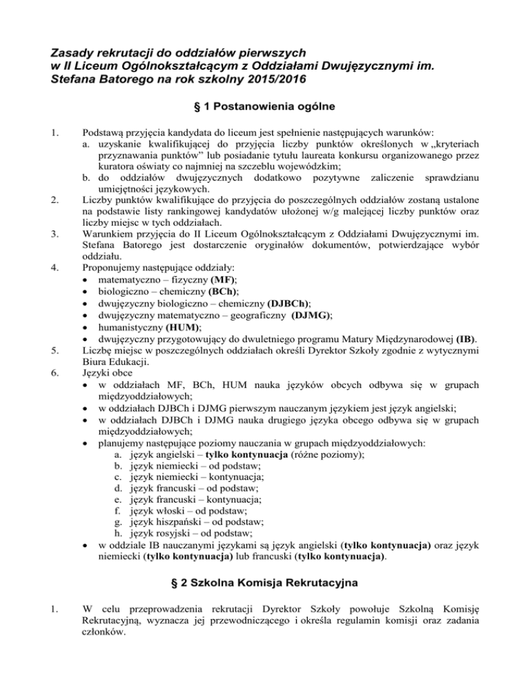 Zasady rekrutacji do oddziałów pierwszych w II Liceum Ogólnokształcącym z Oddziałami Dwujęzycznymi im. Stefana Batorego na rok szkolny 2015/2016 § 1 Postanowienia ogólne 1. 2. 3. 4. 5. 6. Podstawą przyjęcia kandydata do liceum jest spełnienie następujących warunków: a. uzyskanie kwalifikującej do przyjęcia liczby punktów określonych w „kryteriach przyznawania punktów” lub posiadanie tytułu laureata konkursu organizowanego przez kuratora oświaty co najmniej na szczeblu wojewódzkim; b. do oddziałów dwujęzycznych dodatkowo pozytywne zaliczenie sprawdzianu umiejętności językowych. Liczby punktów kwalifikujące do przyjęcia do poszczególnych oddziałów zostaną ustalone na podstawie listy rankingowej kandydatów ułożonej w/g malejącej liczby punktów oraz liczby miejsc w tych oddziałach. Warunkiem przyjęcia do II Liceum Ogólnokształcącym z Oddziałami Dwujęzycznymi im. Stefana Batorego jest dostarczenie oryginałów dokumentów, potwierdzające wybór oddziału. Proponujemy następujące oddziały: • matematyczno – fizyczny (MF); • biologiczno – chemiczny (BCh); • dwujęzyczny biologiczno – chemiczny (DJBCh); • dwujęzyczny matematyczno – geograficzny (DJMG); • humanistyczny (HUM); • dwujęzyczny przygotowujący do dwuletniego programu Matury Międzynarodowej (IB). Liczbę miejsc w poszczególnych oddziałach określi Dyrektor Szkoły zgodnie z wytycznymi Biura Edukacji. Języki obce • w oddziałach MF, BCh, HUM nauka języków obcych odbywa się w grupach międzyoddziałowych; • w oddziałach DJBCh i DJMG pierwszym nauczanym językiem jest język angielski; • w oddziałach DJBCh i DJMG nauka drugiego języka obcego odbywa się w grupach międzyoddziałowych; • planujemy następujące poziomy nauczania w grupach międzyoddziałowych: a. język angielski – tylko kontynuacja (różne poziomy); b. język niemiecki – od podstaw; c. język niemiecki – kontynuacja; d. język francuski – od podstaw; e. język francuski – kontynuacja; f. język włoski – od podstaw; g. język hiszpański – od podstaw; h. język rosyjski – od podstaw; • w oddziale IB nauczanymi językami są język angielski (tylko kontynuacja) oraz język niemiecki (tylko kontynuacja) lub francuski (tylko kontynuacja). § 2 Szkolna Komisja Rekrutacyjna 1. W celu przeprowadzenia rekrutacji Dyrektor Szkoły powołuje Szkolną Komisję Rekrutacyjną, wyznacza jej przewodniczącego i określa regulamin komisji oraz zadania członków. 2. 3. Szkolna Komisja Rekrutacyjna: a. podaje informacje o warunkach rekrutacji; b. przeprowadza postępowanie rekrutacyjne zgodnie z kryteriami określonymi w zasadach rekrutacji; c. ustala minimalną wymaganą liczbę punktów w postępowaniu rekrutacyjnym; d. ogłasza listę kandydatów zakwalifikowanych do przyjęcia; e. ogłasza listę kandydatów przyjętych do szkoły; f. podaje informację o wolnych miejscach; g. sporządza protokół z postępowania rekrutacyjnego. Wszelkie decyzje związane z rekrutacją podejmuje Szkolna Komisja Rekrutacyjna. § 3 Sprawdzian umiejętności językowych dla kandydatów do oddziałów dwujęzycznych 1. 2. 3. 4. 5. 6. 7. Sprawdzian umiejętności językowych jest organizowany wspólnie i w porozumieniu z: • XXXIII L.O. Dwujęzycznym im. M. Kopernika w Warszawie, • XXXV L.O. z Oddziałami Dwujęzycznymi im. B. Prusa w Warszawie, • XL L.O. z Oddziałami Dwujęzycznymi im. S. Żeromskiego w Warszawie, • XCIX L.O. z Oddziałami Dwujęzycznymi im. Z. Herberta w Warszawie, • CXXXVII L.O. z Oddziałami Dwujęzycznymi w Warszawie. Kandydat przystępuje do sprawdzianu umiejętności językowych w tej z ww. szkół, w której znajduje się pierwszy, najbardziej preferowany przez niego oddział dwujęzyczny. Sprawdzian umiejętności językowych dla kandydatów do oddziałów dwujęzycznych odbędzie się: • część pisemna – 29 maja 2015 o godz. 15:00, • część ustna – w dniach 1 – 10 czerwca 2015 Do dalszej rekrutacji do oddziałów dwujęzycznych zakwalifikowane są osoby, które uzyskają co najmniej 50% punktów rekrutacyjnych z każdej części egzaminu, tj. co najmniej 8 punktów z części pisemnej oraz co najmniej 4 punkty z części ustnej. Informacje o zakwalifikowaniu oraz szczegółowy harmonogram części ustnej sprawdzianu umiejętności językowych zostanie ogłoszony 1 czerwca 2015 do godziny 15:00. Sprawdzian umiejętności językowych dla kandydatów do oddziałów dwujęzycznych, którzy z udokumentowanych przyczyn losowych nie przystąpili do sprawdzianu umiejętności językowych lub dokonali zmiany wyboru oddziałów odbędzie się: • część pisemna – 24 czerwca 2015 o godz. 13:00, • część ustna – w dniach 24 – 25 czerwca 2015. Uzyskany przez kandydata wynik sprawdzianu umiejętności językowych jest przekazywany do wszystkich szkół wymienionych w punkcie 1. § 4 Wymagane dokumenty 1. 2. od 11 maja do 22 maja 2015: • wniosek o przyjęcie do szkoły (wygenerowany w internetowym systemie rekrutacji); od 26 czerwca do 29 czerwca 2015: • kopia świadectwa ukończenia gimnazjum oraz kopia zaświadczenia o szczegółowych wynikach egzaminu przeprowadzonego w ostatnim roku nauki w gimnazjum, poświadczone za zgodność z oryginałem przez Dyrektora Gimnazjum, które kandydat ukończył; • kopie zaświadczeń z konkursów przedmiotowych, sportowych i artystycznych; inne dokumenty umożliwiające skorzystanie z uprawnień przewidzianych przez regulamin rekrutacji; od 3 lipca do 6 lipca 2015: • oryginał świadectwa ukończenia gimnazjum; • oryginał zaświadczenia o szczegółowych wynikach egzaminu przeprowadzonego w ostatnim roku nauki w gimnazjum; • ankieta kandydata (w tym oświadczenie potwierdzające wolę podjęcia nauki); • karta zdrowia ucznia z gimnazjum; • 3 fotografie; • akceptacja warunków uczestnictwa w programie IB (tylko oddział IB); • deklaracja wyboru przedmiotów w programie IB (tylko oddział