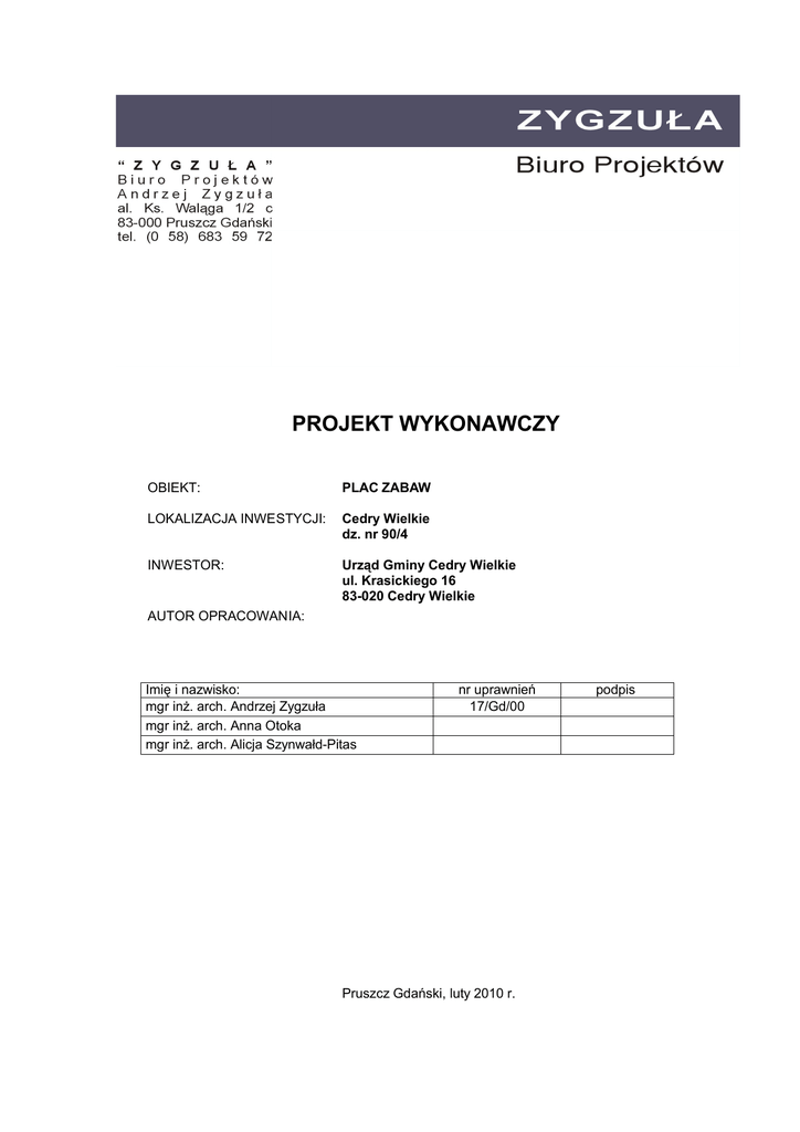 PROJEKT WYKONAWCZY OBIEKT: PLAC ZABAW LOKALIZACJA INWESTYCJI: Cedry Wielkie dz. nr 90/4 INWESTOR: Urząd Gminy Cedry Wielkie ul. Krasickiego 16 83-020 Cedry Wielkie AUTOR OPRACOWANIA: Imię i nazwisko: mgr inż. arch. Andrzej Zygzuła mgr inż. arch. Anna Otoka mgr inż. arch. Alicja Szynwałd-Pitas nr uprawnień 17/Gd/00 Pruszcz Gdański, luty 2010 r. podpis OŚWIADCZENIE DO PROJEKTU WYKONAWCZEGO PLACU ZABAW ZLOKALIZOWANEGO W CEDRACH WIELKICH DZ. NR 90/4, obręb Cedry Wielkie (ARCHITEKTURA) Oświadczam, że projekt został sporządzony zgodnie z obowiązującymi przepisami oraz zasadami wiedzy technicznej. Architektura: autor projektu: mgr inż. arch. Andrzej Zygzuła nr upr. 17/Gd/00 INFORMACJA DOTYCZĄCA BEZPIECZEŃSTWA I OCHRONY ZDROWIA, która powinna być uwzględniona w planie bezpieczeństwa i ochrony zdrowia projektowanego obiektu 1.0. Dane ogólne: 1.1. Nazwa obiektu – Projekt wykonawczy placu zabaw. 1.2. Adres obiektu – Cedry WIelkie działka nr 90/4. 1.3. Inwestor – Urząd Gminy Cedry Wielkie 1.4. Adres Inwestora – ul. Krasickiego 16, 83-020 Cedry Wielkie 1.5. Informację sporządził – arch. Andrzej Zygzuła. 2.0. Podstawa opracowania: 2.1. Projekt wykonawczy placu zabaw. 2.2. Rozporządzenie Ministra Infrastruktury z dnia 23.06.2003r. w sprawie informacji dotyczącej bezpieczeństwa i ochrony zdrowia oraz planu bezpieczeństwa i ochrony zdrowia Dz. U. Nr 12, poz. 1126 2.3. RMBiPMB z dnia 28.03.1972r. w sprawie bezpieczeństwa i higieny pracy przy wykonywaniu robót budowlano – montażowych i rozbiórkowych Dz.U. Nr 13, poz. 93 2.4. RMPiPS z dnia 26.09.1997r. w sprawie ogólnych przepisów bezpieczeństwa i higieny pracy 2.5. RMPiPS z dnia 08.02.1994r. w sprawie wprowadzenia obowiązku stosowania niektórych Polskich Norm i norm branżowych, dotyczących bezpieczeństwa i higieny pracy Dz. U. Nr 37, poz. 138 3.0. Część opisowa: Plac zaprojektowano w formie koła jako ogólnodostępną przestrzeń. Plac podzielono w połowie chodnikiem z płytek betonowych chodnikowych 30x30cm, z płukaną powierzchnią, w kolorze piaskowym, biegnącym w kierunku pn-pd. Od strony wschodniej plac domyka ciąg pieszy z kostki brukowej granitowej (w późniejszym etapie zagospodarowania pozostałej części działki ma on być kontynuowany). Linię ciągów podkreślono żywopłotami. Oba ciągi łączyć mają część północną i południową terenu sąsiadującego. Pozostałe projektowane chodniki komunikować będą część wschodnią i zachodnią wsi. W południowo-zachodnim kwartale placu projektuje się syntetyczną, elastyczną i bezpieczną nawierzchnię wraz z dużym, drewnianym zestawem zabawowym typu „ZAMEK”. W północno-zachodnim kwartale przewiduje się nawierzchnię piaskową wraz z piaskownicą, zespołem chuśtawek i sprężynowców oraz karuzelę. W południowo-wschodniej części natomiast projektuje się nawierzchnię piaskową wraz ze stołem pingpongowym. W części północno-wschodniej - zaciszne miejsce dla najmłodszych dzieci wraz z piaskownicą z palisady, sprężynowcami, drewnianym domkiem i lokomotywą. Tu również projektuje się nawierzchnię piaskową. Dodatkowo wprowadzono elementy małej architektury (drewniane ławki z oparciem wokół zachodniej części placu i wzdłuż linearnego ciągu pieszego a także bez oparcia wokół wschodniej części placu, stoliki do gry w szachy wraz z krzesełkami ulokowanymi od strony północnej, przed wejściem na plac oraz kosze na śmieci, stojaki na rowery i tablicę informacyjną). Część południowo-zachodnią placu uatrakcyjniono wprowadzając labirynt z żywopłotu ze żwirowymi ścieżkami. Wewnątrz labiryntu umieszczono liczne kolorowe elementy przestrzenne z tworzywa syntetycznego i elastycznego oraz ławeczki. Dla równowagi na przeciwległym pn-wsch. narożniku placu zaprojektowano rabaty kwiatowe, otoczone niskim żywopłotem. Całość wzbogacono dodatkową roślinnością: (krzewy, żywopłoty, trawa). Z uwagi na podniesienie terenu na placu zabaw zaprojektowano murki wokół drzew najniżej położonych, celem ich zabezpieczenia. Utworzone w ten sposób studnie zakrywa się z góry stalową, systemową kratą. Murki okłada się drewnem i wykorzystuje się również jako siedziska. 3.1. Na terenie objętym zakresem opracowania projektuje się : Prace obejmują roboty ziemne. Humus po zdjęciu złożyć na pryzmę następnie zagospodarować na terenie działki. Wszystkie roboty związane z nowym ukształtowaniem nachylenia terenu, wykopami szczególnie na granicach z istniejącymi drzewami należy prowadzić ze szczególną ostrożnością. W razie jakichkolwiek wątpliwości należy skontaktować się z projektantem. W zakres robót budowlanych i montażowych wchodzi: - obniżenia terenu i murki wokół istniejących drzew, 1 - chodniki i schody na gruncie, - nawierzchnie żwirowe, - nawierzchnia z płytek syntetycznych, - montaż urządzeń zabawowych, - montaż ławek parkowych, - montaż koszy na śmieci, - montaż stojaków rowerowych, - montaż tablicy informacyjnej, - trawniki, - rabaty kwiatowe, - żywopłoty i krzewy Wszystkie roboty związane z nowym ukształtowaniem nawierzchni terenu wokół istniejących drzew należy prowadzić ze szczególną ostrożnością. Elementy odpadowe powstałe z urządzania istniejącegio placu zabaw i rozbiórek nie nadające się do powtórnego użycia należy wywieźć na wysypisko śmieci. 3.2. Kolejność wykonywania robót: roboty budowlane i montażowe w kolejności jak w/w zakresie. 3.3. Rejon prac obejmuje dz. nr 90/4 3.4. W obrębie robót, przy rozbiórce, pracach ziemnych mogą występować typowe dla takich robót sytuacje stwarzające zagrożenie dla bezpieczeństwa zdrowia i życia ludzi. W związku z tym należy wykazać szczególną ostrożność. Zagrożenia te należy sformułować przed przystąpieniem do pracy i przestrzec przed nimi wykonujących je robotników, a także przeprowadzić instruktaż o udzielaniu pierwszej