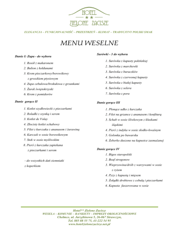 ELEGANCJA – FUNKCJONALNOŚĆ – PRZESTRZEŃ – KLIMAT – TRADYCJYNY POLSKI SMAK MENU WESELNE Surówki - 3 do wyboru Danie I: Zupa - do wyboru 1. Surówka z kapusty pekińskiej 1. Rosół z makaronem 2. Surówka z marchewki 2. Bulion z kołdunami 3. Surówka z buraczków 3. Krem pieczarkowy/borowikowy 4. Surówka z czerwonej kapusty z groszkiem ptysiowym 4. Zupa cebulowa/brokułowa z grzankami 5. Surówka z białej kapusty 5. Żurek świętokrzyski 6. Surówka z selera 6. Krem z pomidorów 7. Surówka z pora Danie gorące II Danie gorące III 1. Kotlet szydłowiecki z pieczarkami 1. Płonące udko z kurczaka 2. Roladki z szynką i serem 2. Filet na grzance z ananasem i konfiturą 3. Kotlet de Volay 3. Schab w sosie śliwkowym z kluskami 4. Złocisty kotlet schabowy śląskimi 5. Filet z kurczaka z ananasem i żurawiną 4. Pierś z indyka w sosie słodko-kwaśnym 6. Karczek w sosie borowikowym 5. Golonka po bawarsku 7. Stek w sosie myśliwskim 6. Żeberko duszone na kapustce zasmażanej 8. Pierś z kurczaka zapiekana Danie gorące IV z pieczarkami i serem 1. Bigos staropolski - do wszystkich dań ziemniaki 2. Beaf strogonow z koperkiem 3. Wieprzowina/drób z warzywami w sosie z ryżem 4. Pyzy z kapustą i mięsem 5. Żołądki drobiowe z cebulą i pieczarkami 6. Kapusta faszerowana w sosie Hotel** Zielone Zacisze WESELA – KOMUNIE – BANKIETY – IMPREZY OKOLICZNOŚCIOWE Chełmce, ul. Jarzębinowa 5, 26-067 Strawczyn, Tel. 885 88 55 75, 41-222 54 95 www.hotelzielonezacisze.net.pl ELEGANCJA – FUNKCJONALNOŚĆ – PRZESTRZEŃ – KLIMAT – TRADYCJYNY POLSKI SMAK Danie gorące V Sałatki – 3 do wyboru 1. Barszczyk czerwony z pasztecikiem/krokietem 2. Barszczyk czerwony z uszkami 3. Flaczki po warszawsku 1. Sałatka jarzynowa 2. Sałatka pieczarkowa 3. Sałatka królewska 4. Żurek z jajkiem i kiełbasą. 4. Gyros 5. Saganek świętokrzyski 5. Sałatka grecka 6. Sałatka hawajska Zakąski pieczyste - 5 do wyboru 1. Schab pieczony ze śliwką Warzywa i pikle 1. Pomidor i ogórek z cebulką i szczypiorkiem 2. Karczek pieczony 3. Boczek faszerowany 2. Ogórek konserwowy 4. Rolada a la kaczka 5. Żeberka faszerowane 3. Pieczarki marynowane 6. Pasztet mięsny domowy 4. Papryka w occie 7. Galantyna z kurczaka Danie gorące VI w warnikach – 3 do wyboru Przekąski zimne – 5 do wyboru 1. Pierogi z mięsem i kapustą 1. Jajko faszerowane 2. Pierogi z kapustą i grzybami 2. Galaretki drobiowe/wieprzowe 3. Złociste skrzydełka 3. Schab po warszawsku 4. Bigos 4. Jajka w szynce na sałatce 5. Szaszłyki 5. Ozorek w galarecie 6. Ryba po grecku 7. Trio śledziowe 8. Mozarella z pomidorami Kawa i herbata, woda mineralna, napoje gazowane i niegazowane. Cena nie zawiera: alkoholu, owoców, ciast i tortu, chłopskiego stołu. Hotel** Zielone Zacisze WESELA – KOMUNIE – BANKIETY – IMPREZY OKOLICZNOŚCIOWE Chełmce, ul. Jarzębinowa 5, 26-067 Strawczyn, Tel. 885 88 55 75, 41-222 54 95 www.hotelzielonezacisze.net.pl